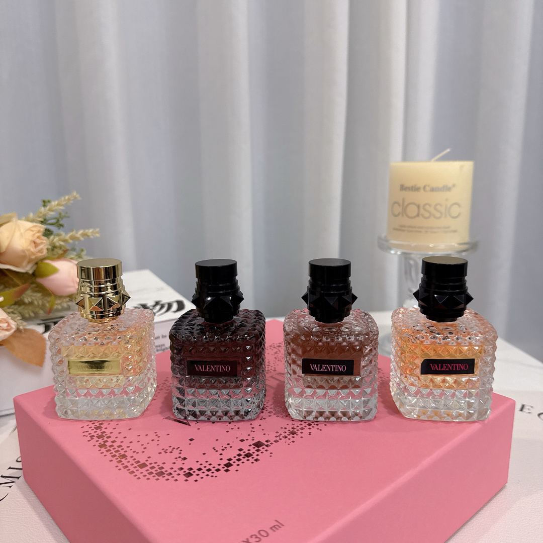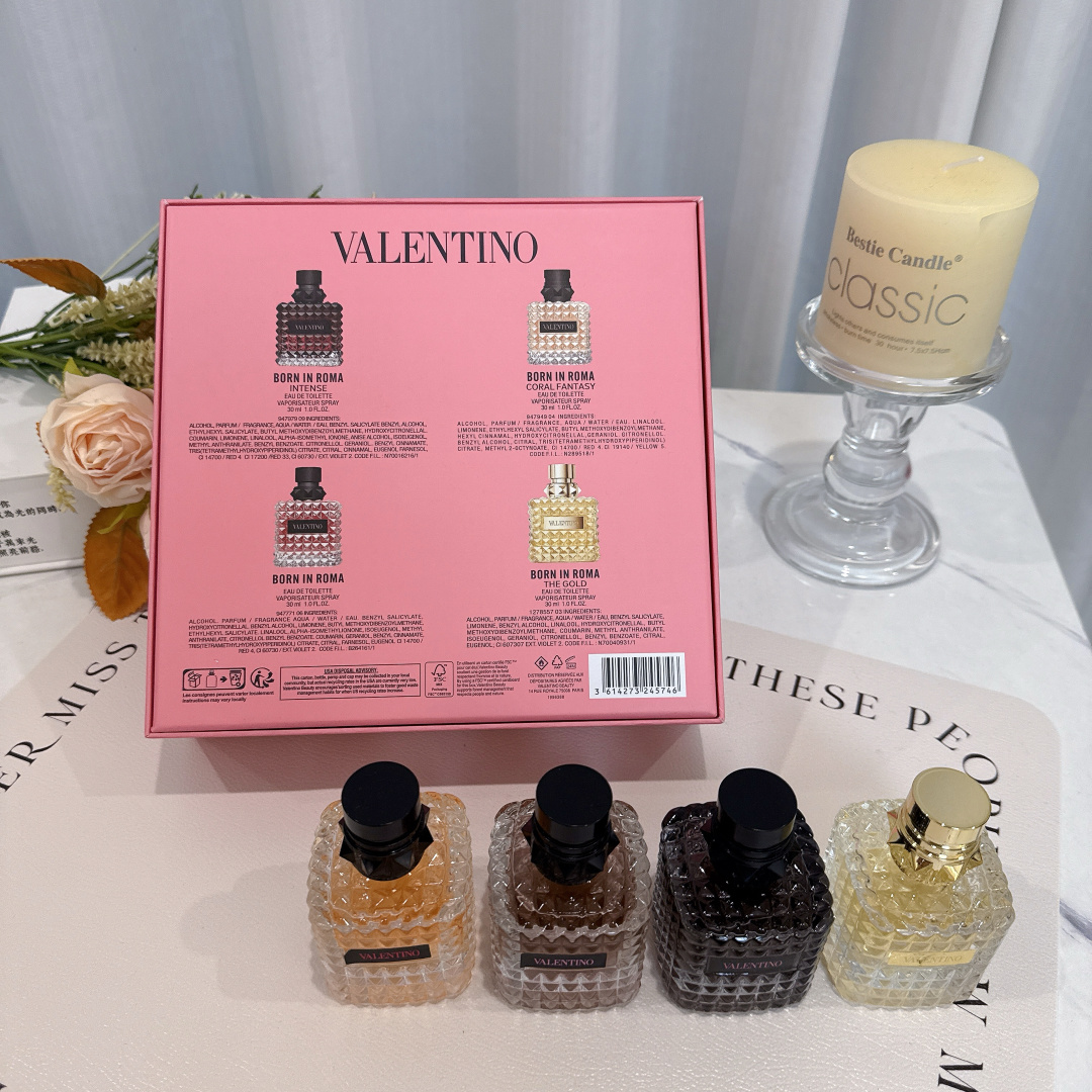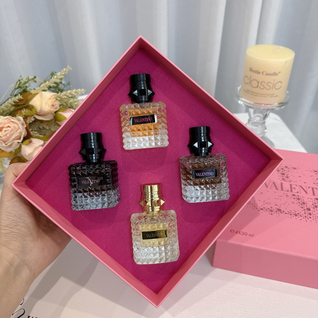 华伦天奴香水四件套宝子们 今天必须给大家分享超绝的华伦天奴香水套装 瞧瞧这颜值 每一瓶香水的瓶身都像是精心雕琢的艺术品 切割面犹如钻石般闪耀 摆在家里 就是精致生活的象征 金色瓶盖的那瓶 带着与生俱来的高贵感 喷上它 你就是人群中最耀眼的女王 而另外三款不同色调的香水 从深邃神秘到温暖柔和 每一款都蕴含着独特的魅力