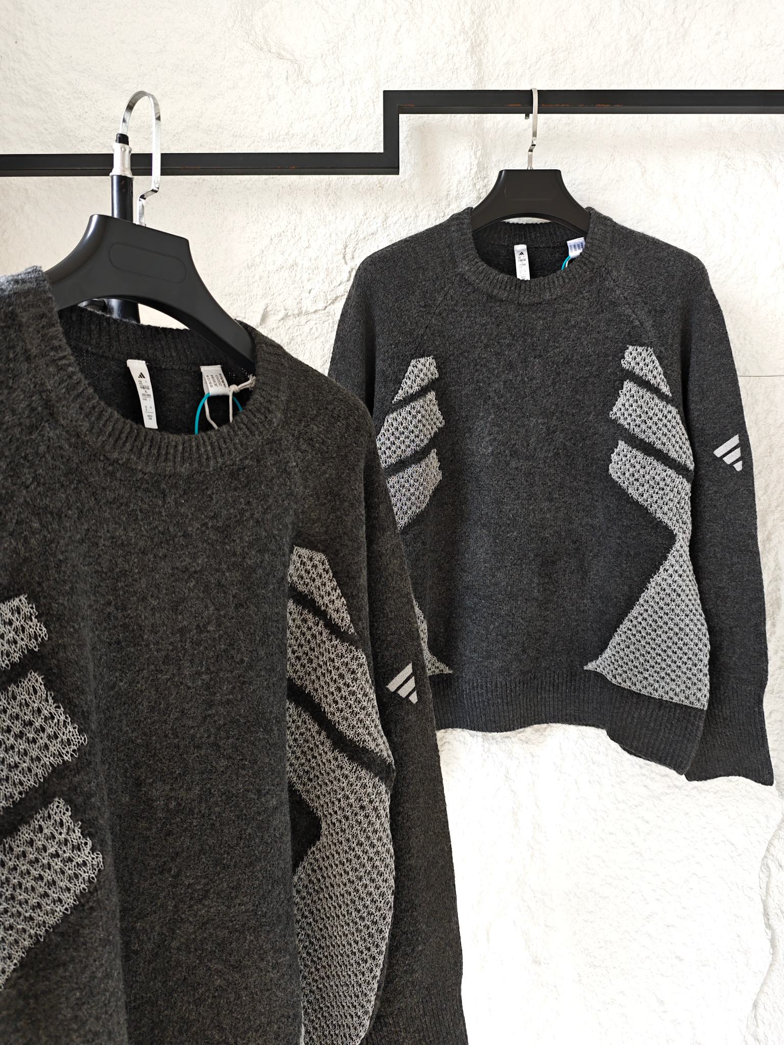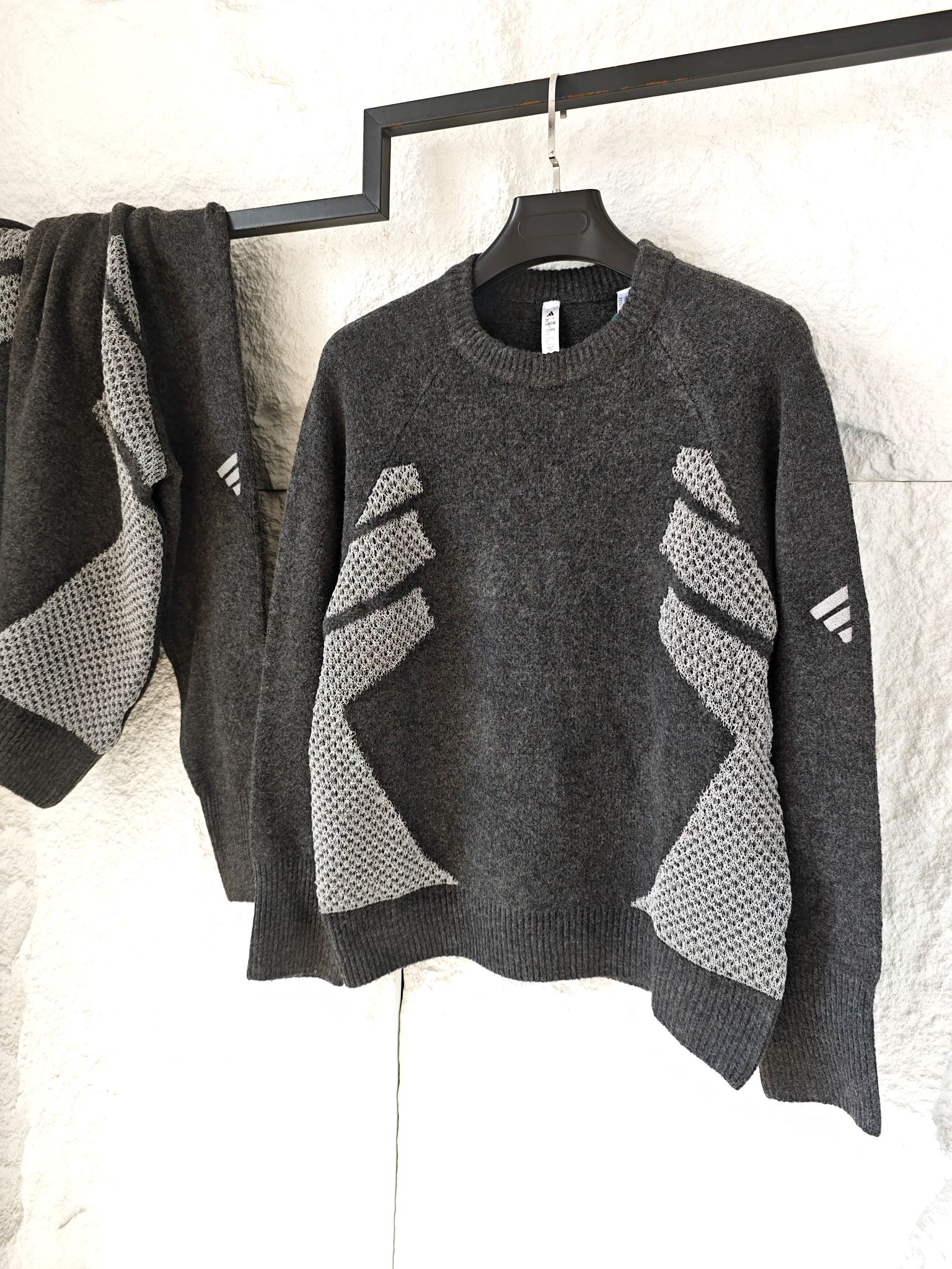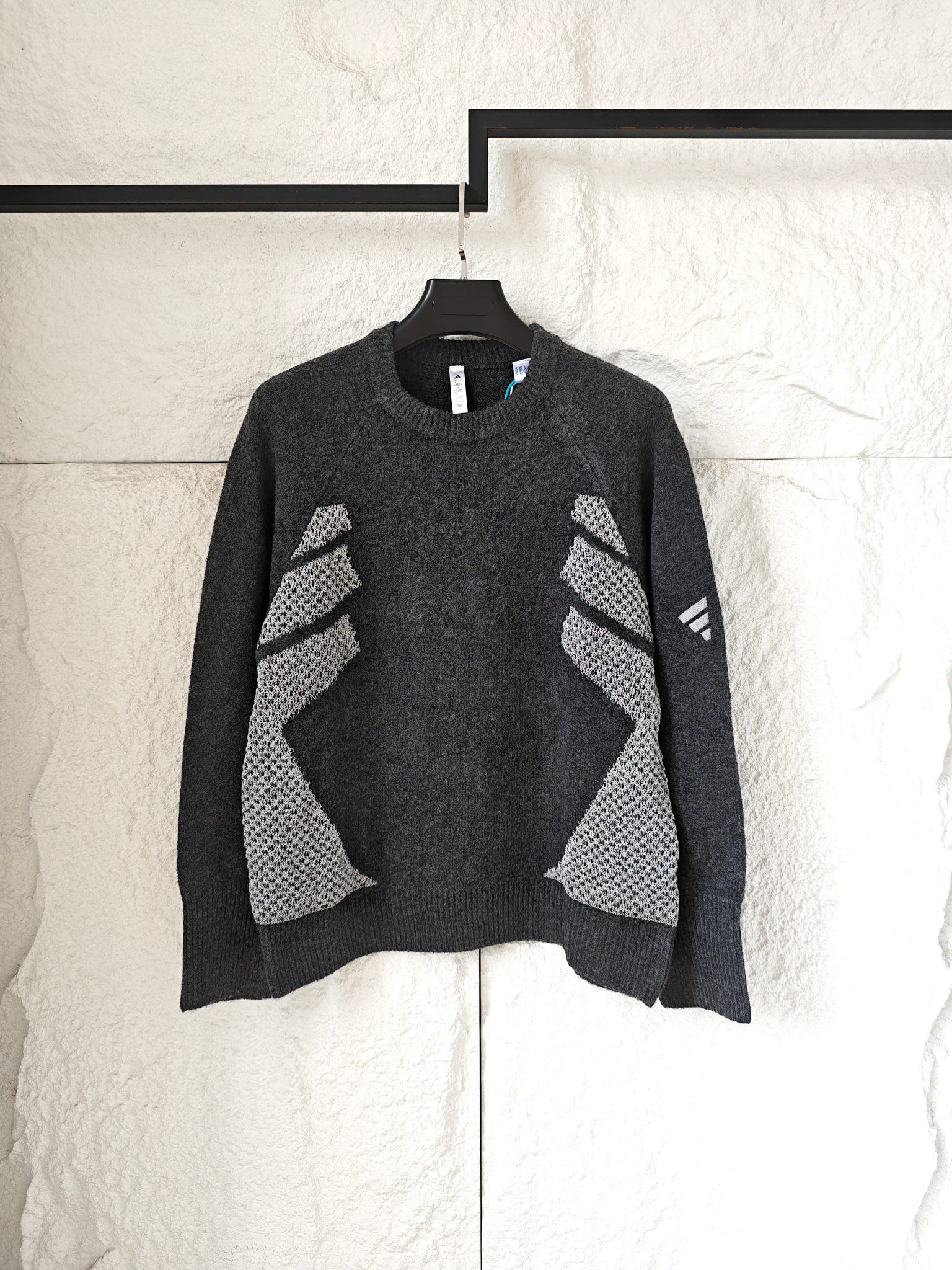 碳黑主调如都市暗夜里的高级注脚 自带 低调却抢镜 的氛围感Buff 侧身银色网眼纹理拼接堪称神来之笔 通透针织与密实面料的碰撞 在简约廓形中凿出建筑感层次 若隐若现的呼吸感 瞬间打破传统针织衫的沉闷刻板 袖臂处标志性三杠标识 以利落线条点睛品牌辨识度 却又克制得恰到好处
