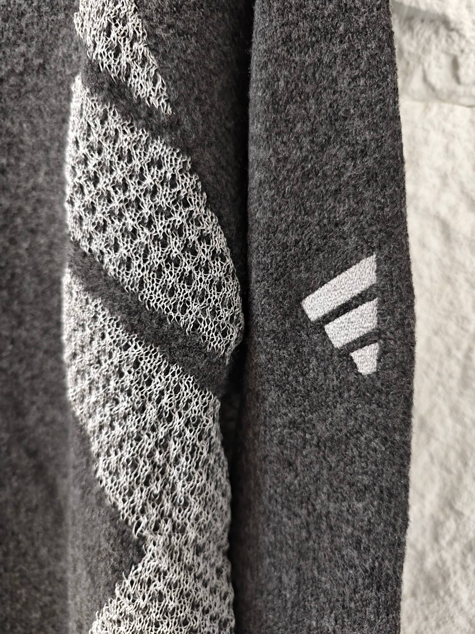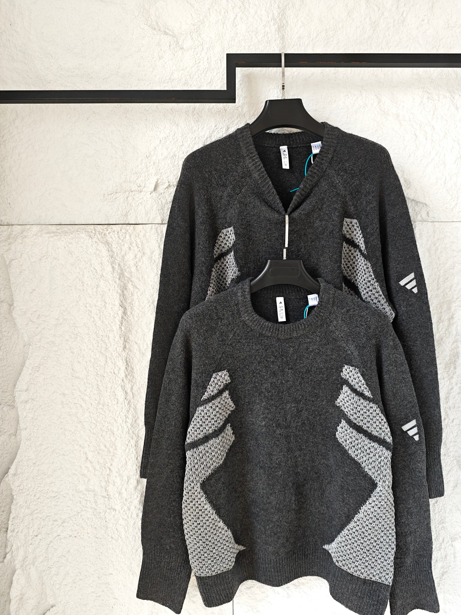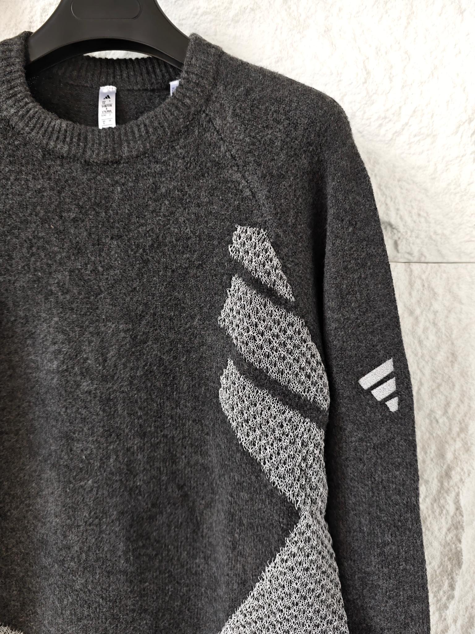 碳黑主调如都市暗夜里的高级注脚 自带 低调却抢镜 的氛围感Buff 侧身银色网眼纹理拼接堪称神来之笔 通透针织与密实面料的碰撞 在简约廓形中凿出建筑感层次 若隐若现的呼吸感 瞬间打破传统针织衫的沉闷刻板 袖臂处标志性三杠标识 以利落线条点睛品牌辨识度 却又克制得恰到好处