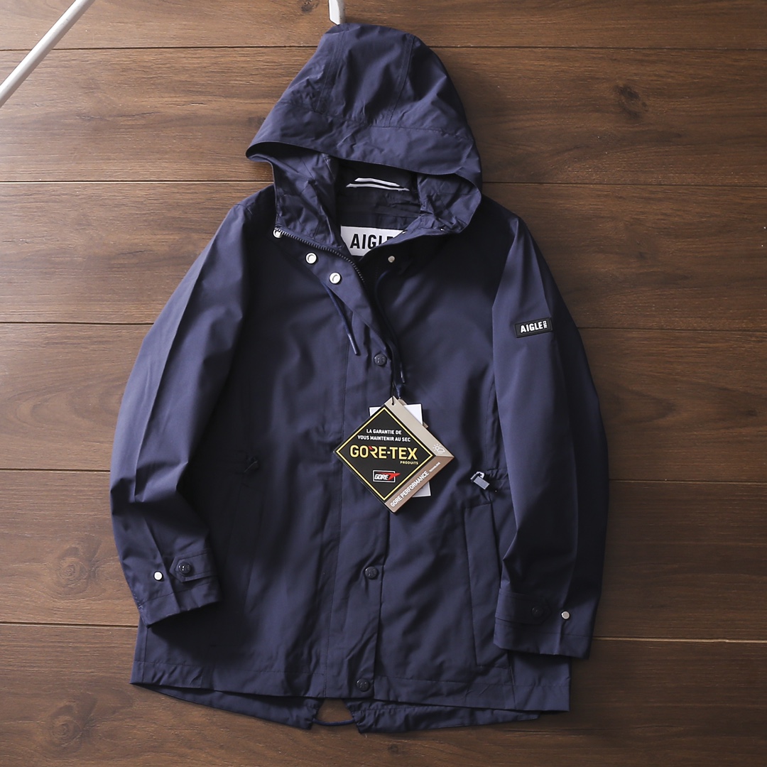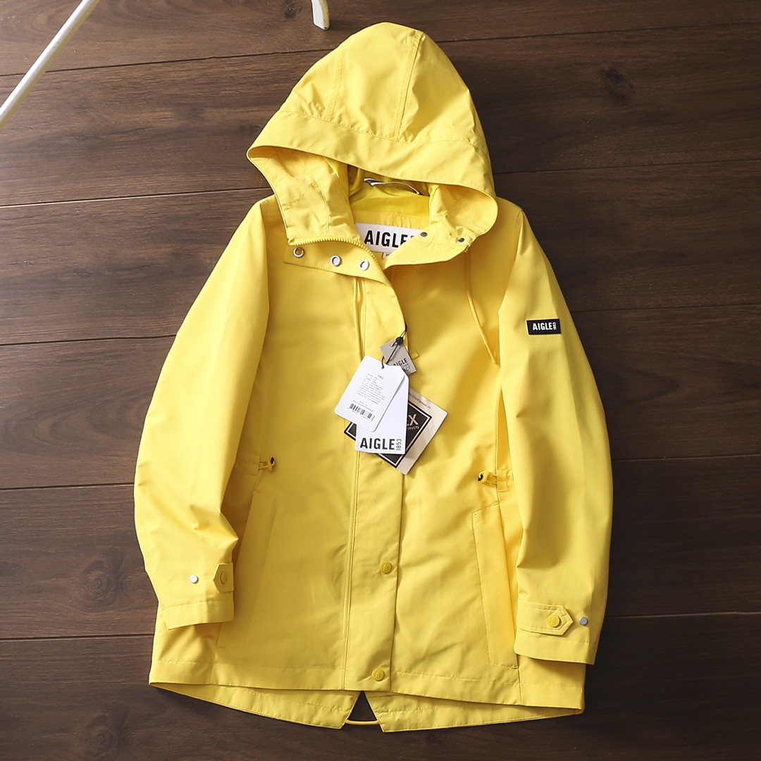 严选好货 艾高Aigle新款女士连帽户外风衣冲锋衣夹克外套 官网同步在售 采用GOTR TEX科技面料 防风防雨而且透气性非常好 内里高密贴合里衬 舒适耐穿 袖臂徽章点缀 腰部松紧抽绳 加长帽檐 原版五金辅料 做工细节都无可挑剔 入手超值 喜欢的不要错过 颜色 藏青色 粉色 黄色 尺码 36一42