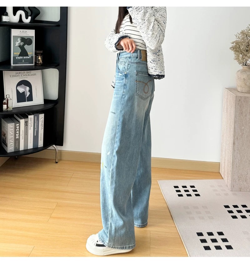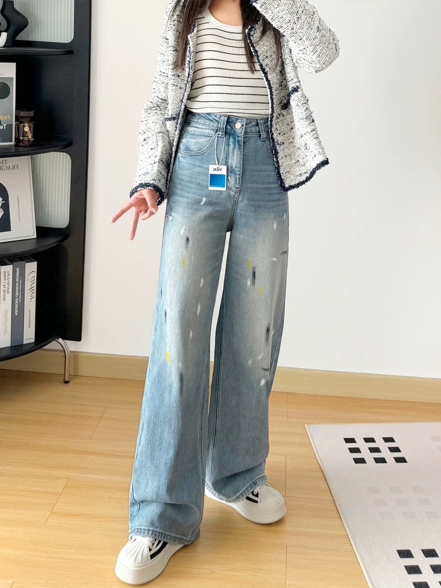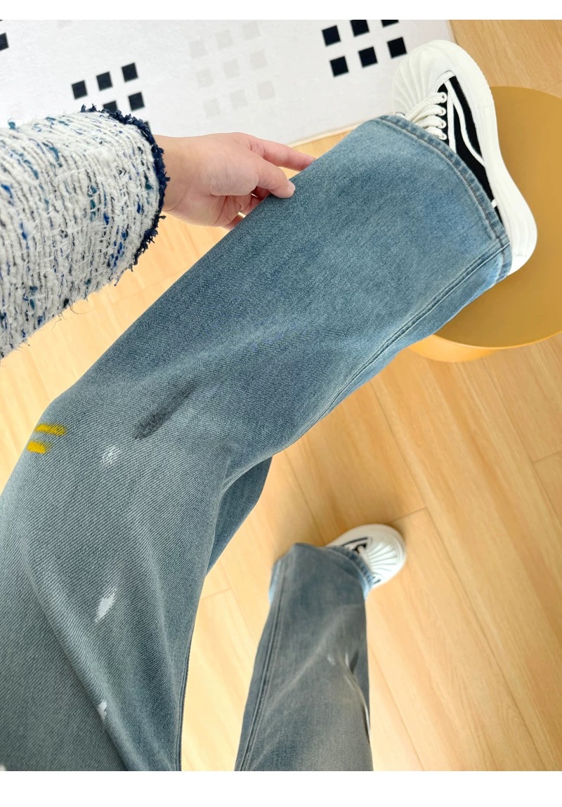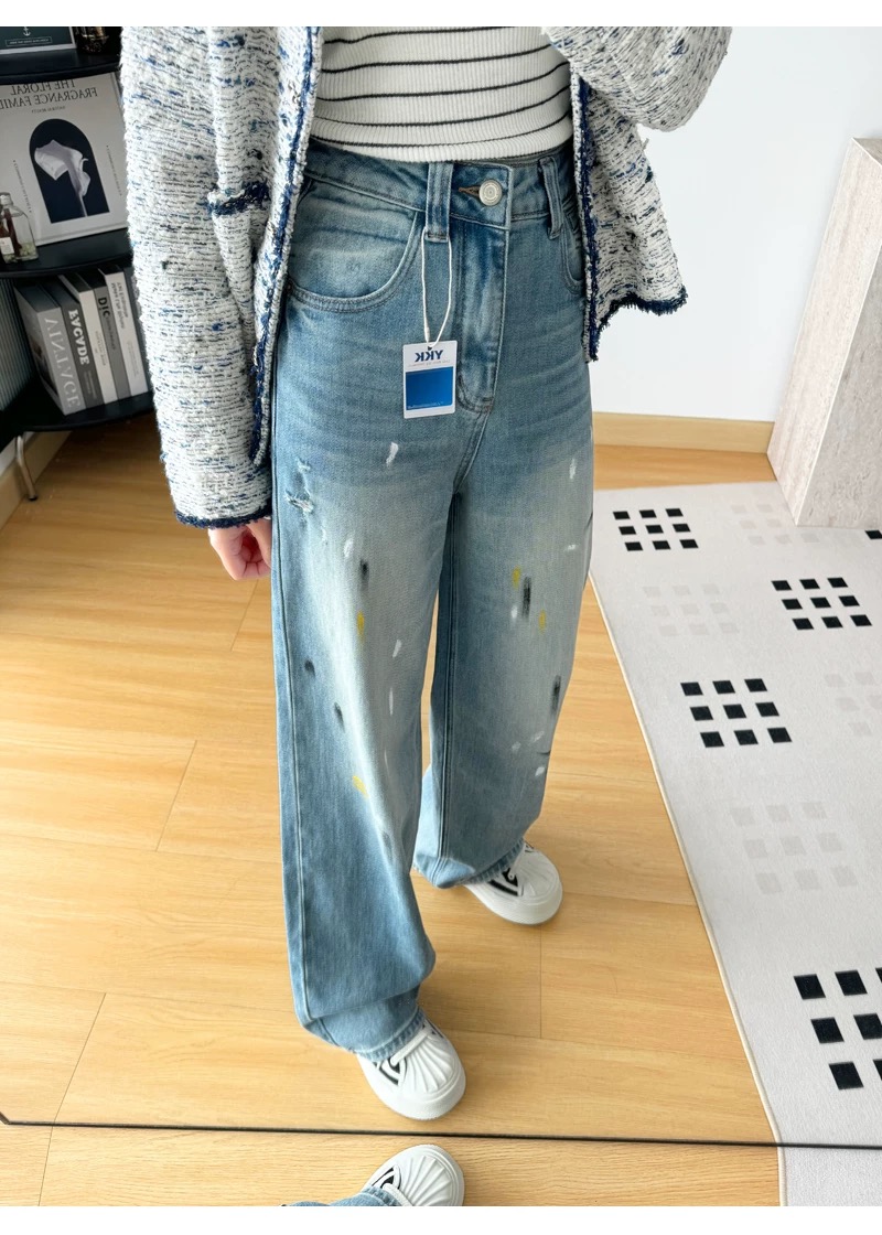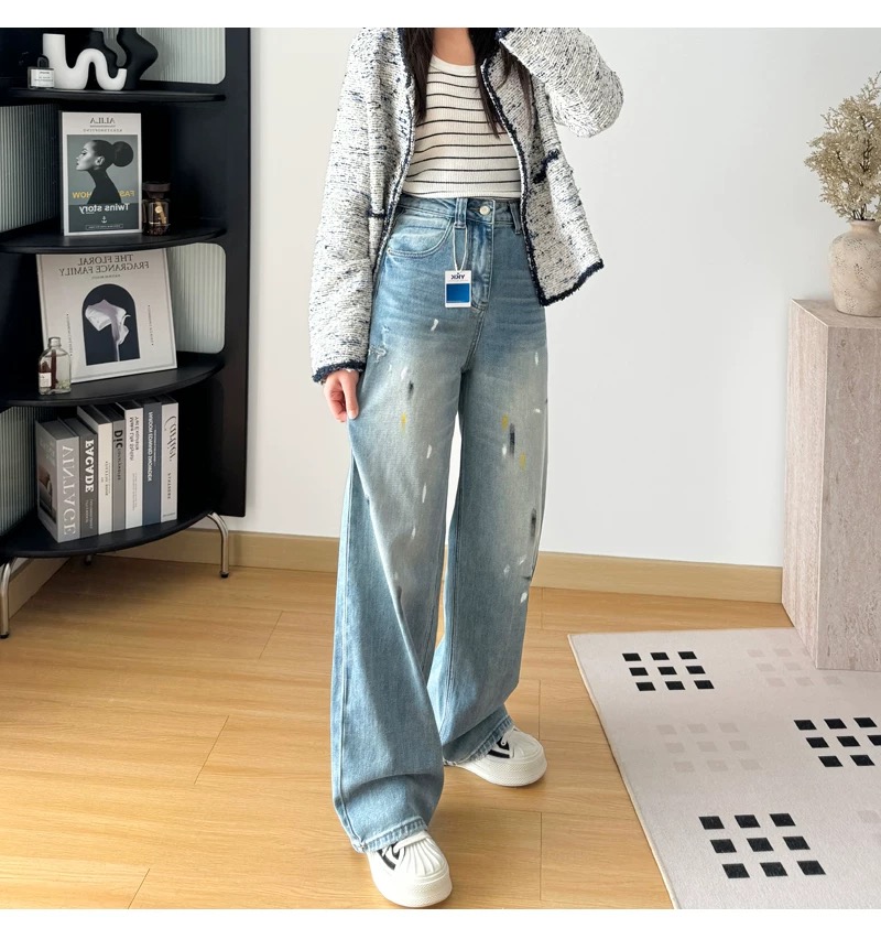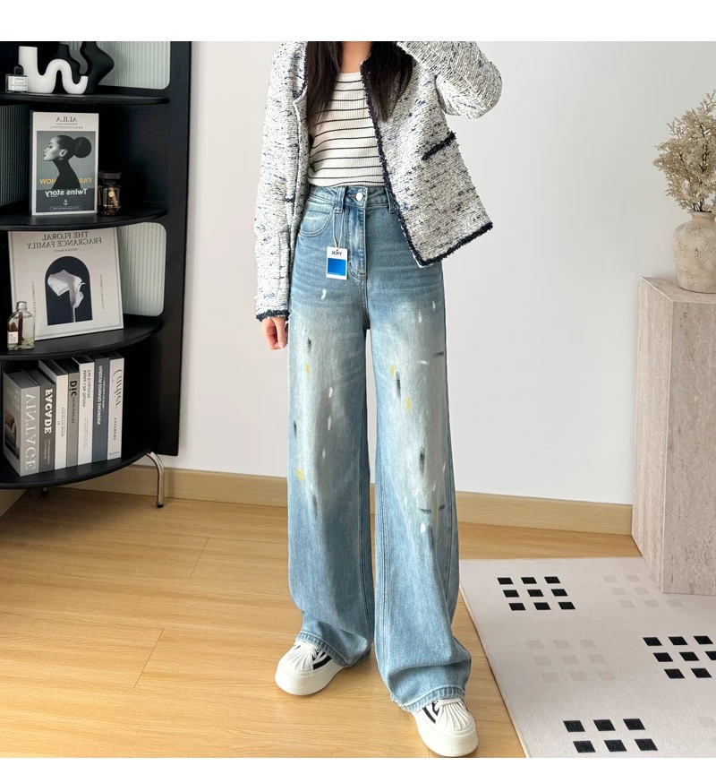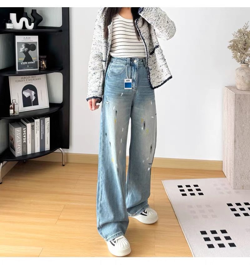 145378848 - 高腰显瘦破洞泼墨涂鸦宽松直筒阔腿裤女春季裤子长裤拖地牛仔裤 576395