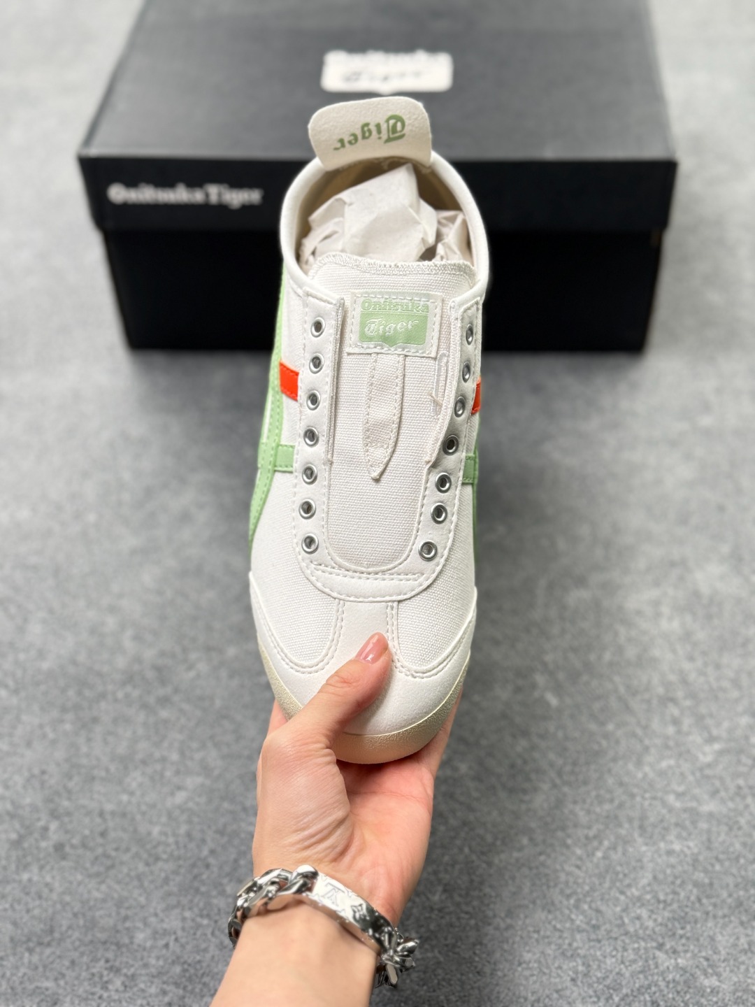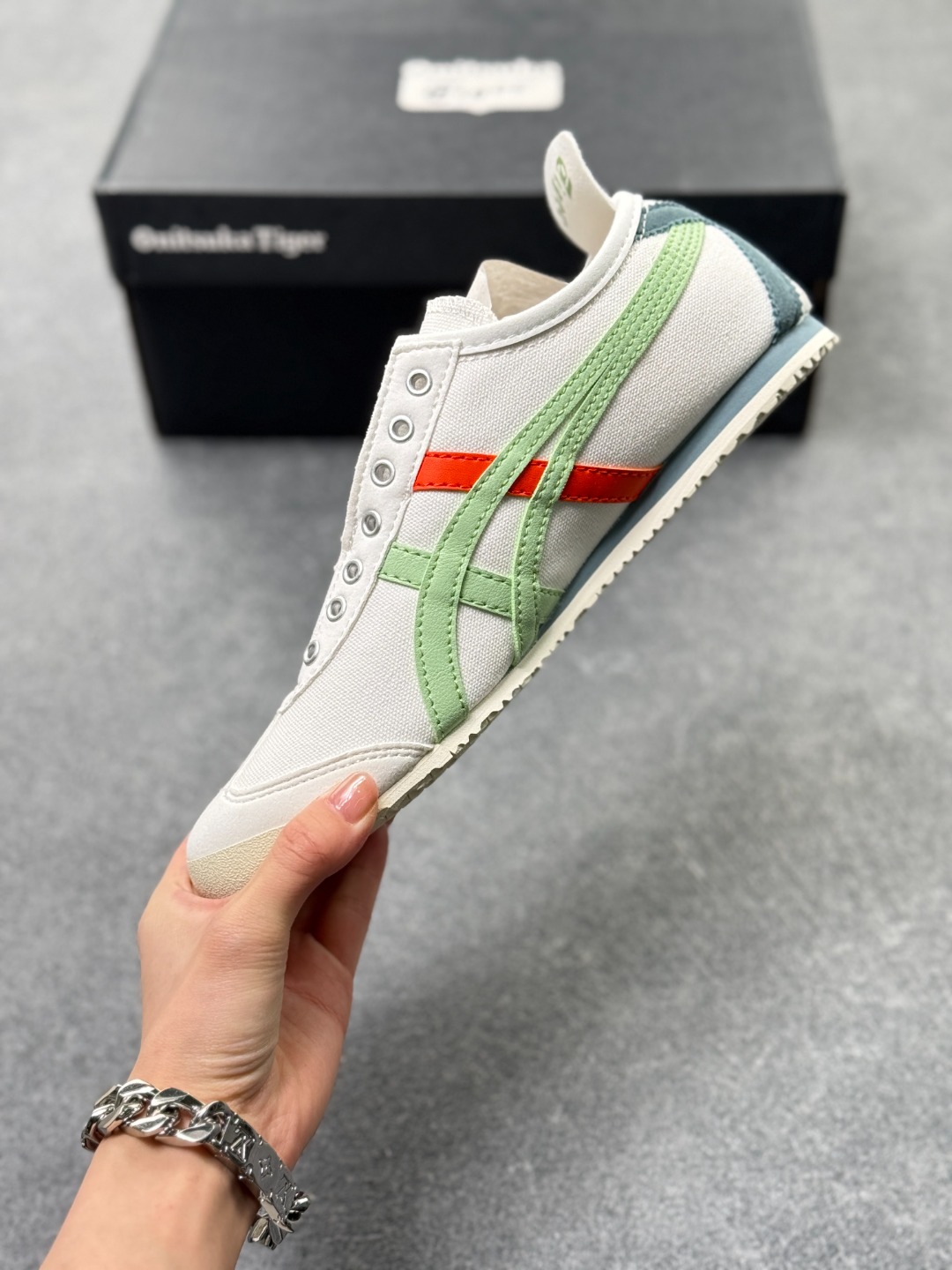 材质与设计 鞋面采用帆布鞋面 部分款式为拼接设计 既保证了透气性 又增强了耐用性 鞋型纤细 基于上世纪60年代的经典跑鞋风格 低帮设计搭配标志性的鬼塚虎条纹 简约时尚 后跟部分通常有X型部件设计 增强稳定性