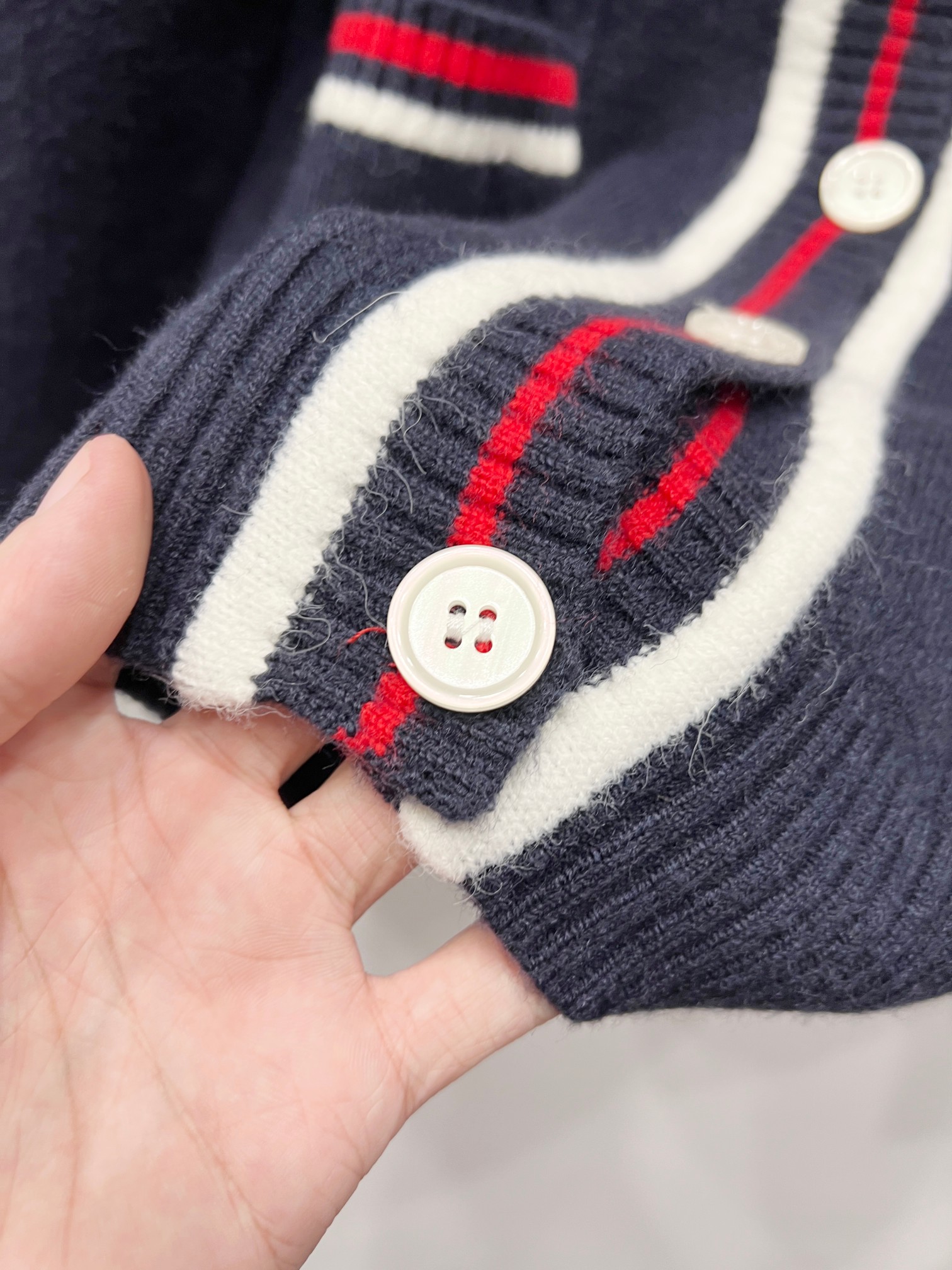 细节与工艺 采用绞花针织工艺 纹理细腻且富有质感 提升了衣服的档次 领口 袖口 口袋边缘的红白撞色条纹设计 不仅增添了视觉层次感 还让整体造型更加活泼灵动 细节处尽显用心
