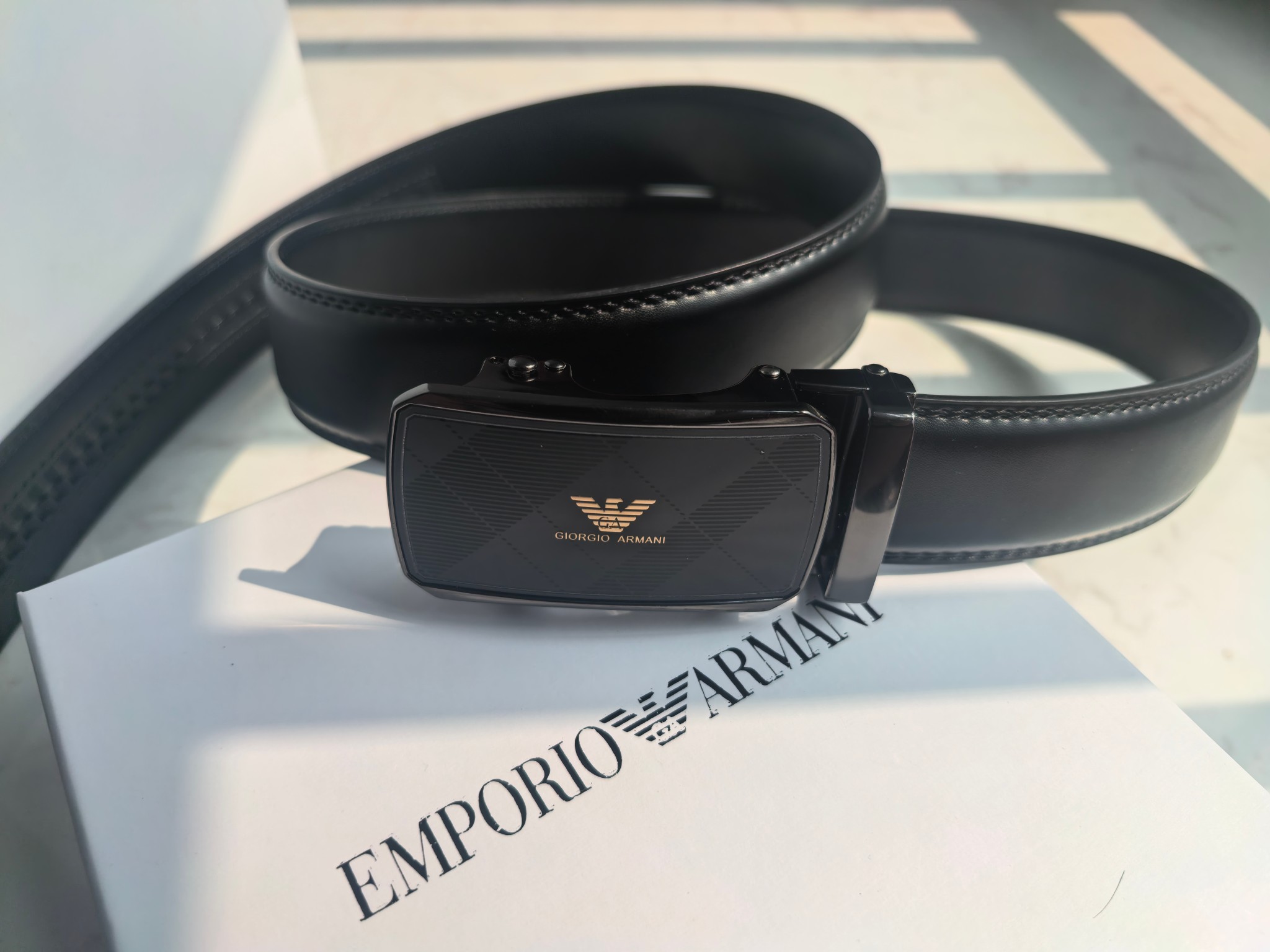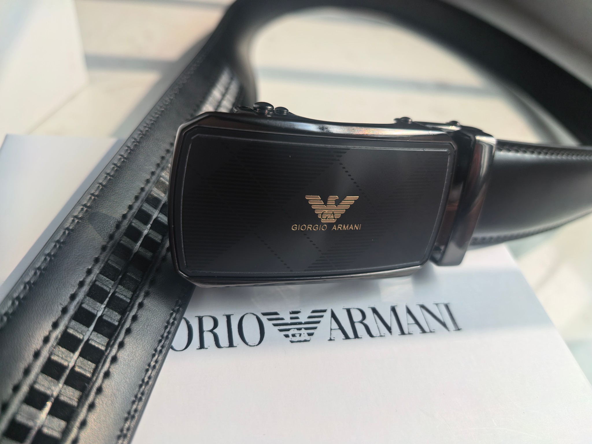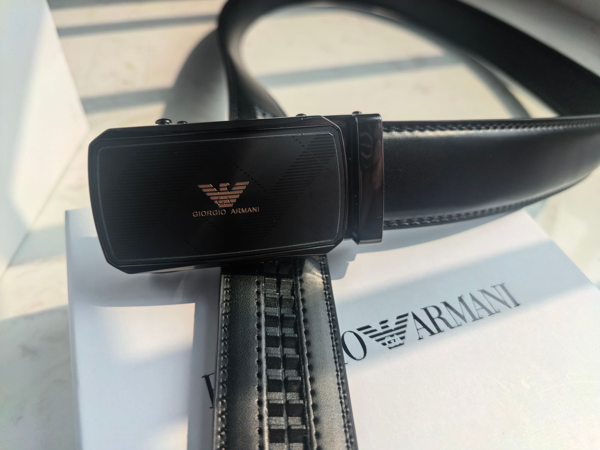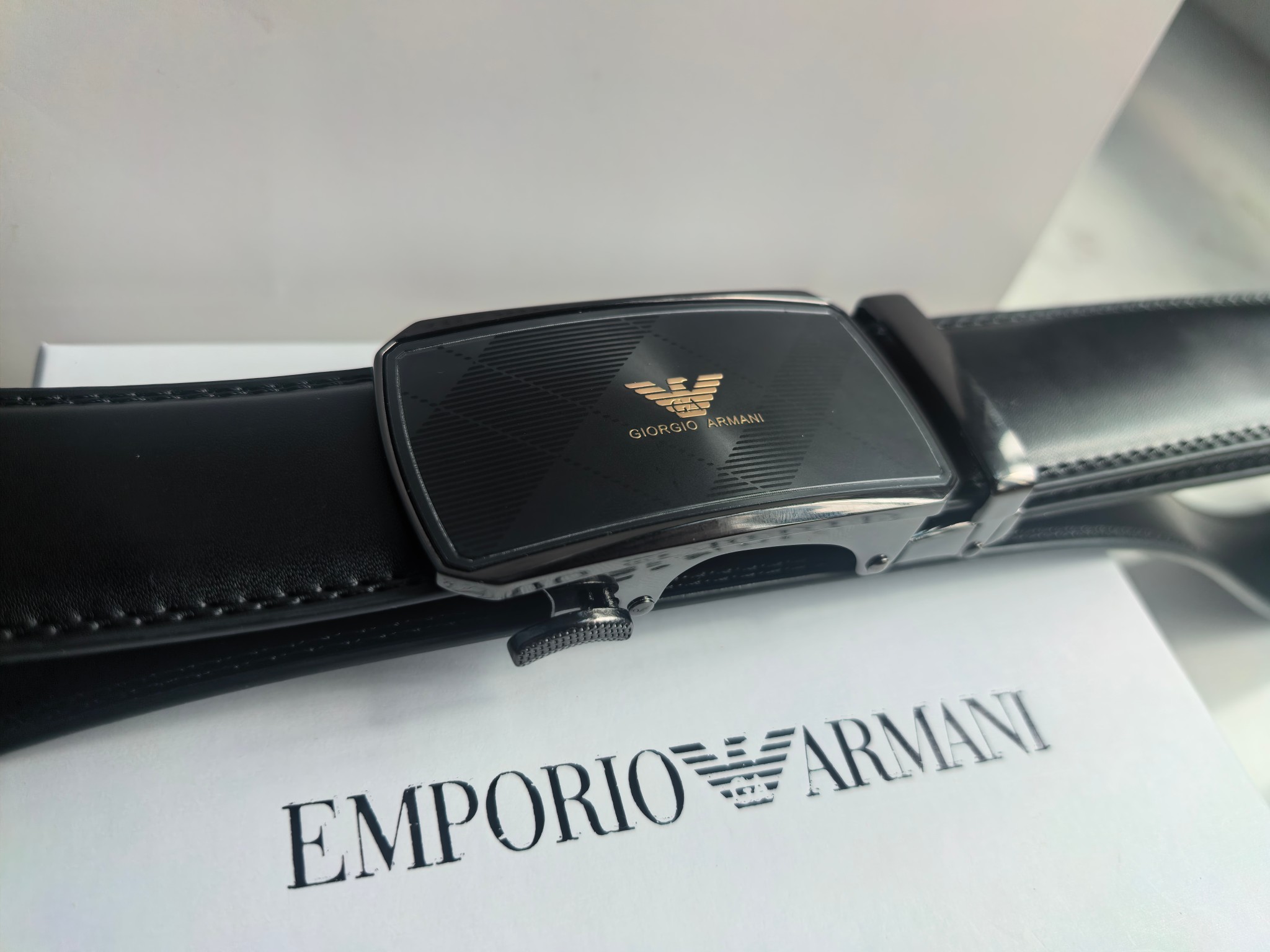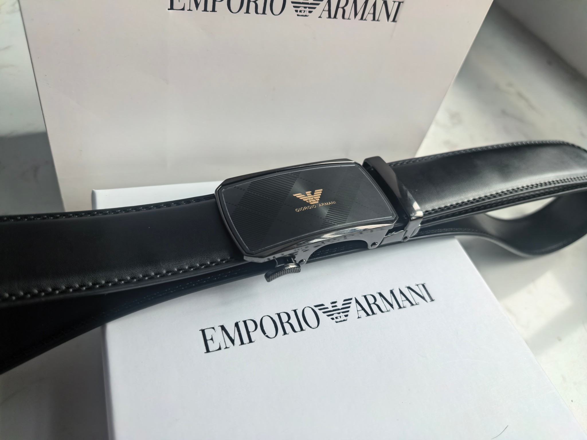 最新款 阿玛尼Armani皮带 磨砂面扣头 真的超级好看 这款皮带一定要搞一条 阿玛尼皮带 今年专柜最新款 真的非常帅 超级百搭款 可商务 可休闲 皮带扣头全部是东莞代工厂出货 非常的有分量 克重足 皮带采用二层牛皮制成 移膜工艺 非常的耐用 两年内绝不会有问题 放心使用 配全套专柜包装盒手提袋 无论送礼还是自用都非常的有档次 尺码 120cm x3 5cm 最大可用到220斤 长短可调节