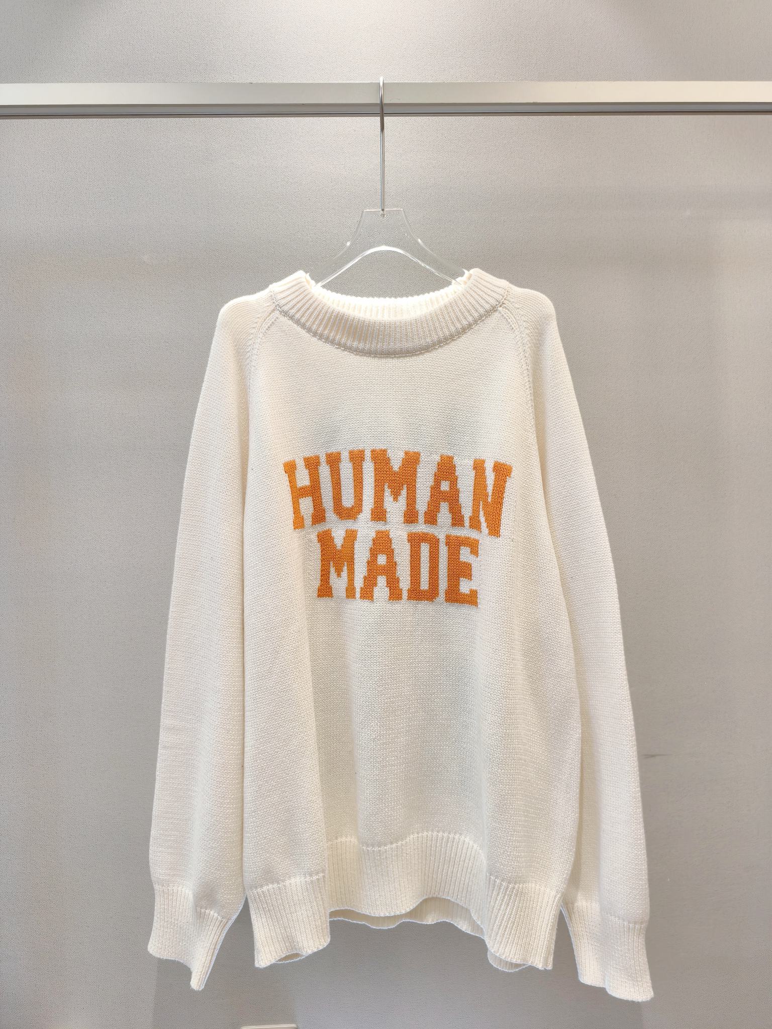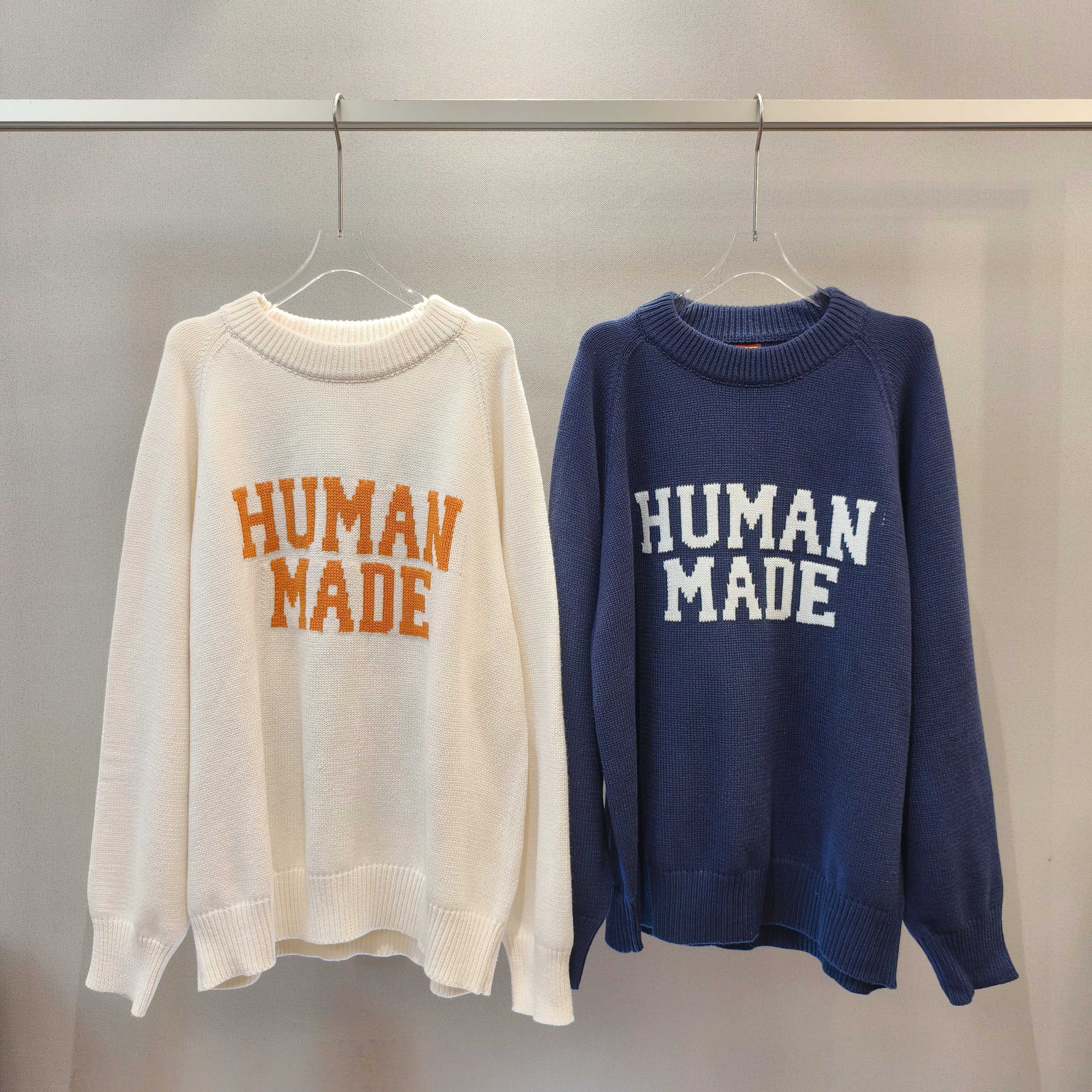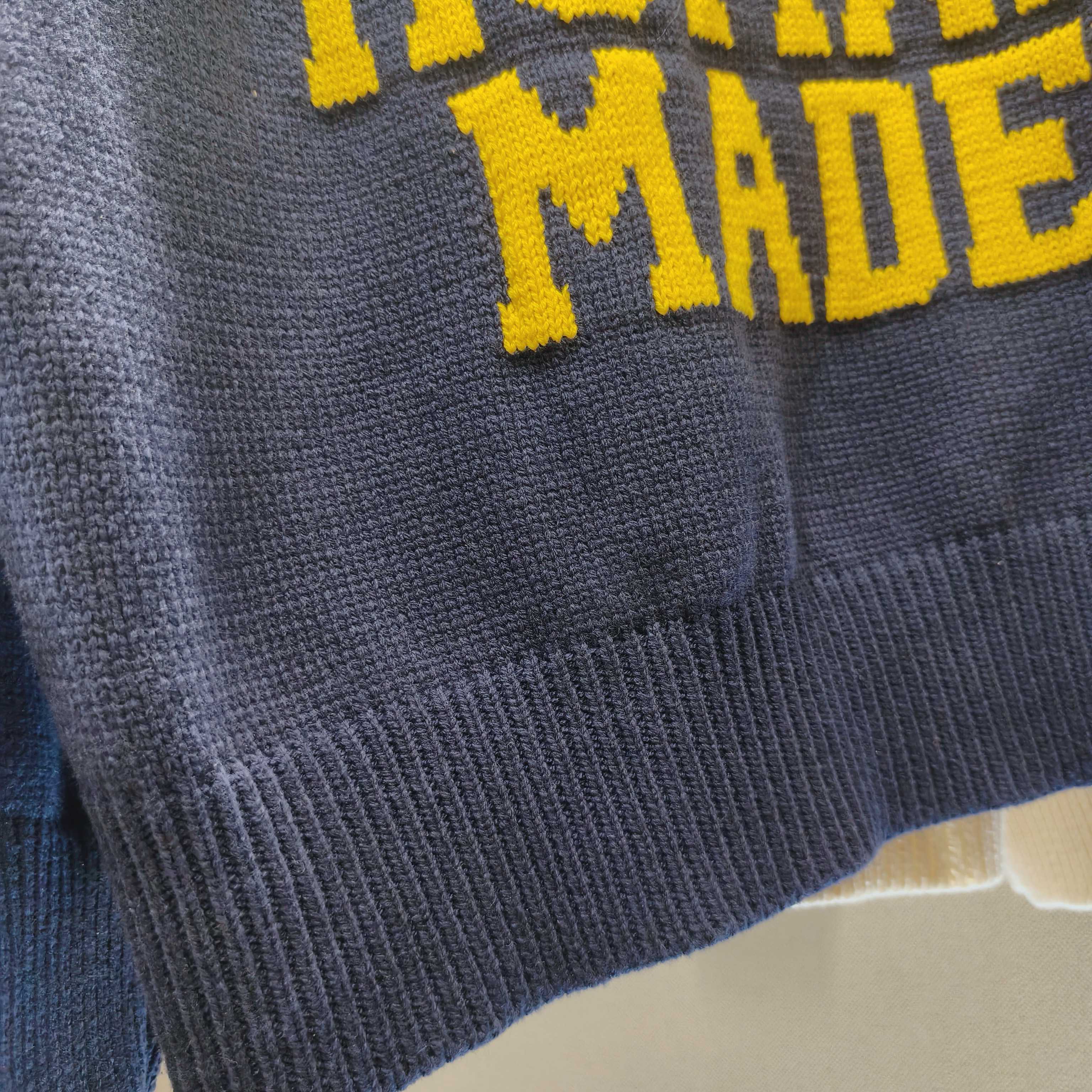 由A BATHING APE首位主理人NIGO打造的另一日本潮流服饰品牌 HUMAN MADE 以Vintage风格的复古感设计而闻名 HUMAN的毛衣款式已经完全拿捏了 攻克最难引塔夏织法 半手工提花的字母及图案以保证不漏线 平整度细节也完美原了 大身与袖子缝合处采用正反双针无缝缝合 纯手工缝制 定织定染的毛线 10 羊毛 30 腈纶 60 棉 三种纱线混纺而成 袖口24股罗纹针收口设计 紧致到位 短款毛衣 搭配图可以看模特图