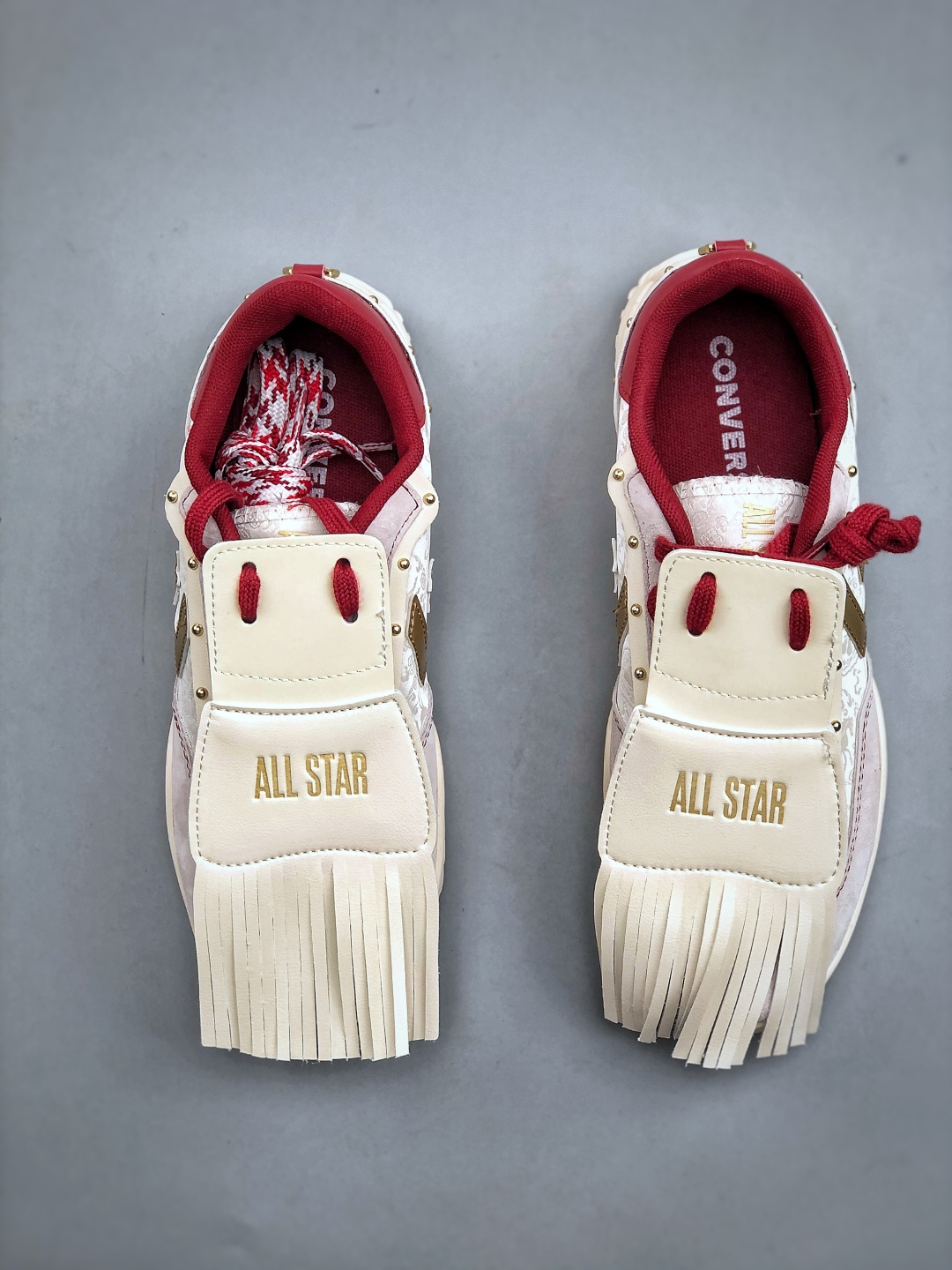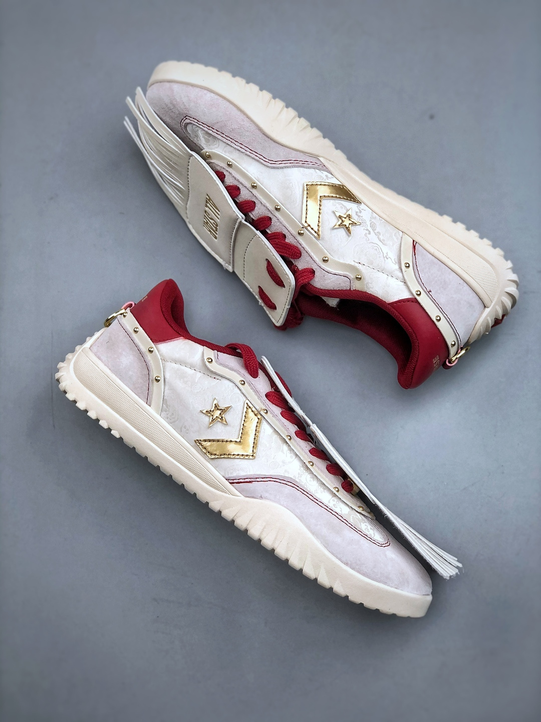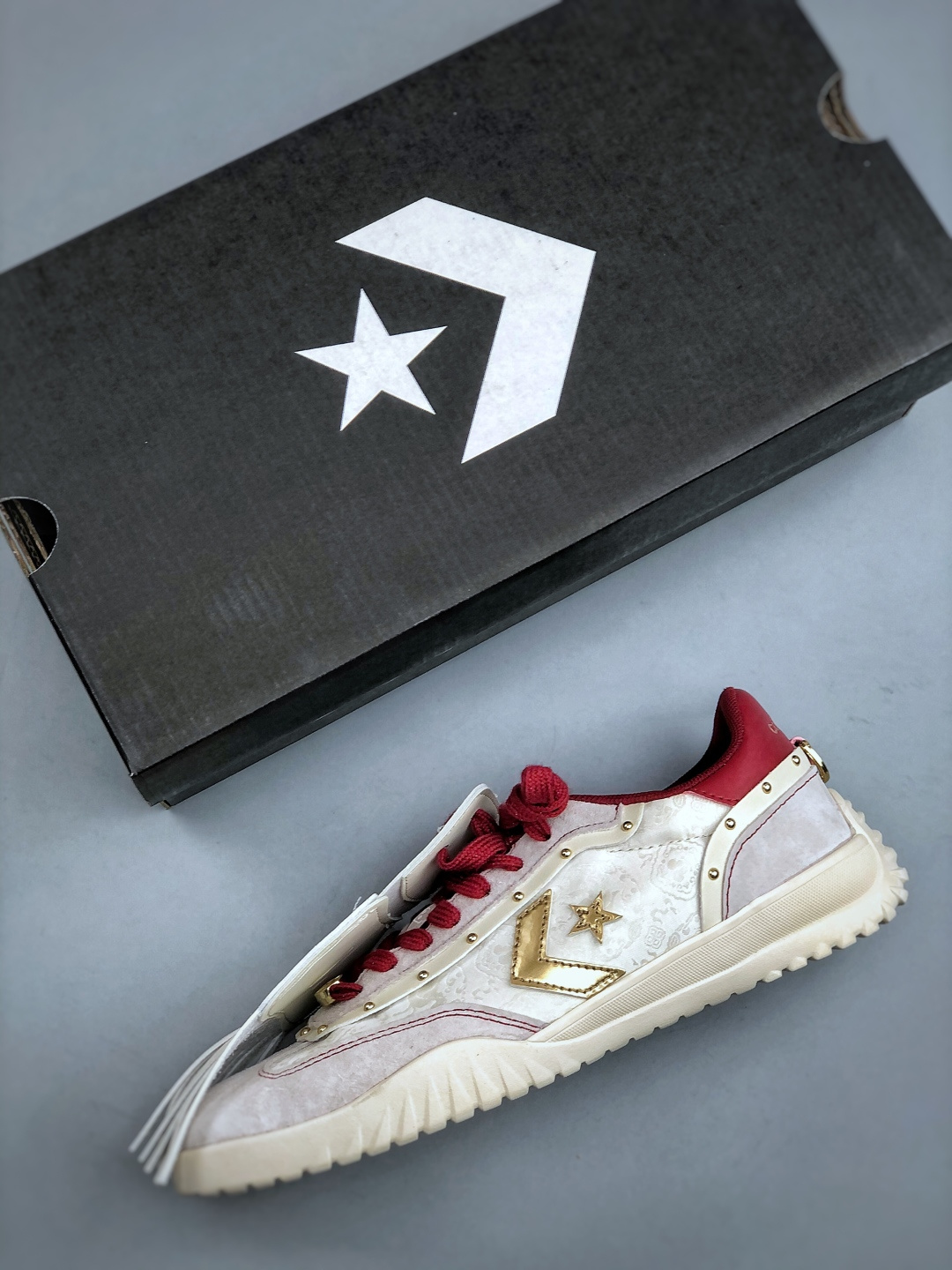 龙马精神 踏新而行 匡威马年限定款惊艳登场 经典 1970 鞋型披上新年战袍 白底赤纹交织祥瑞 金色铆钉点缀鸿运 左牵酒红沉稳 右系彩带飞扬 每一步都踩出传统与潮流的交响 是鞋 更是开年好礼 穿上这双 马到功成 尺码 35 44 半
