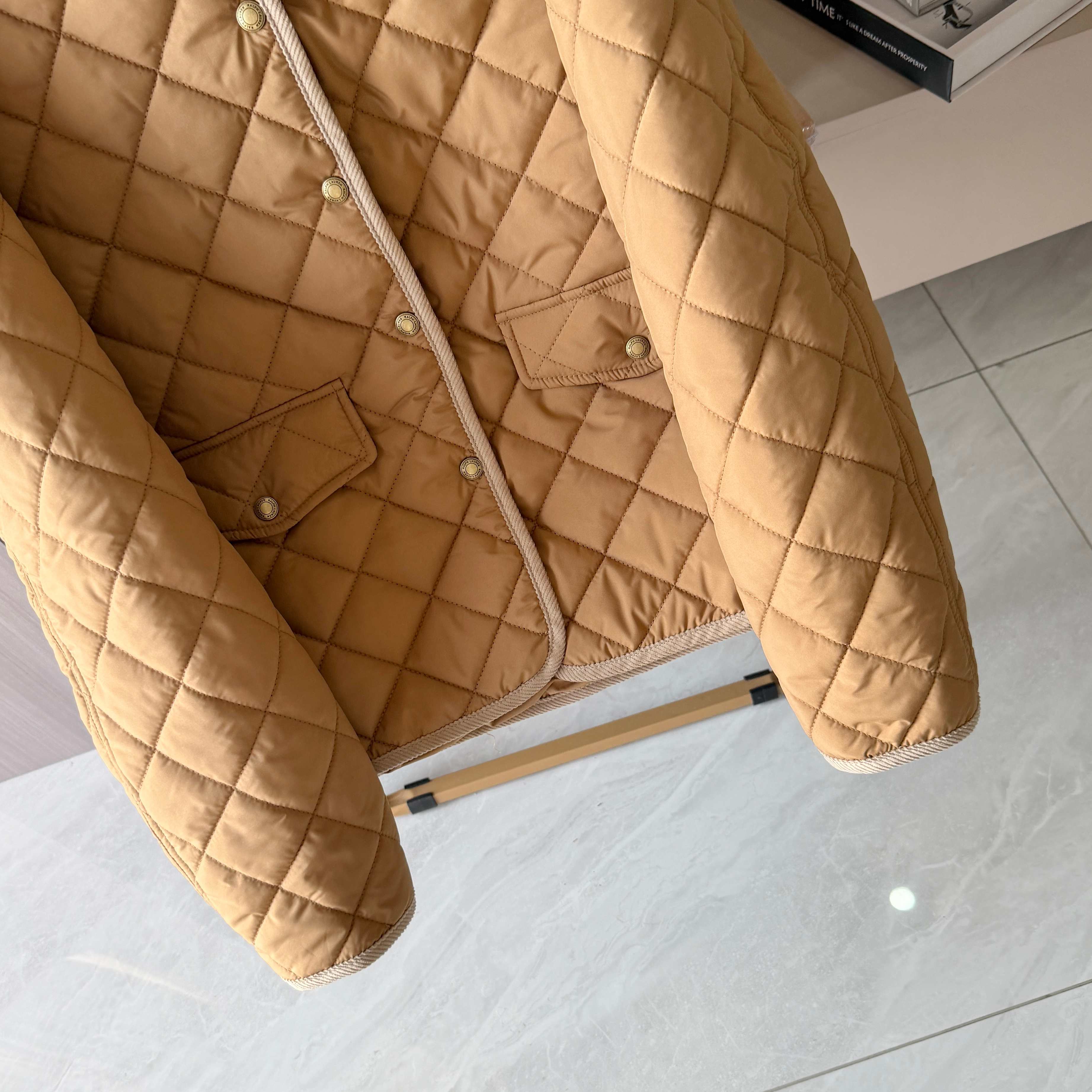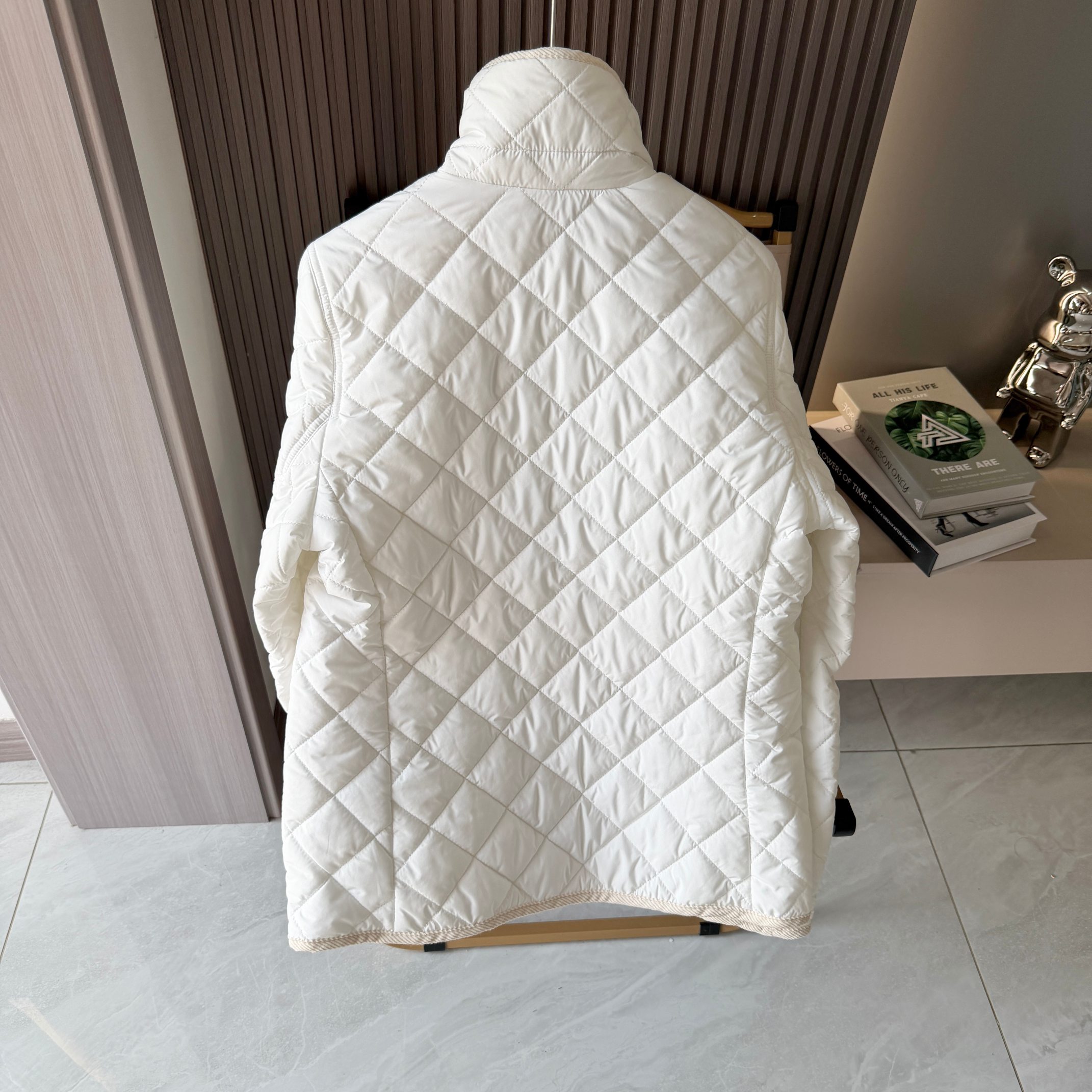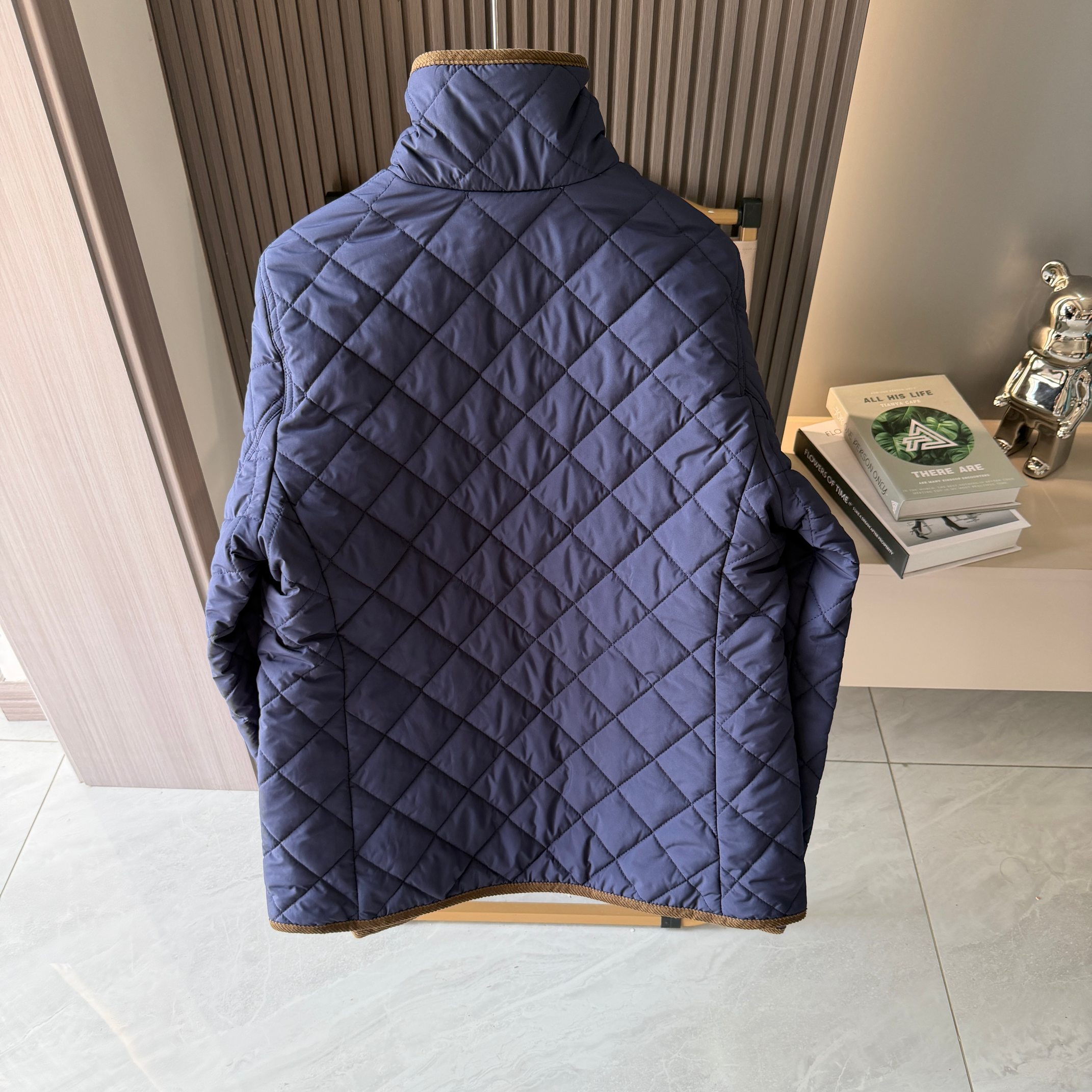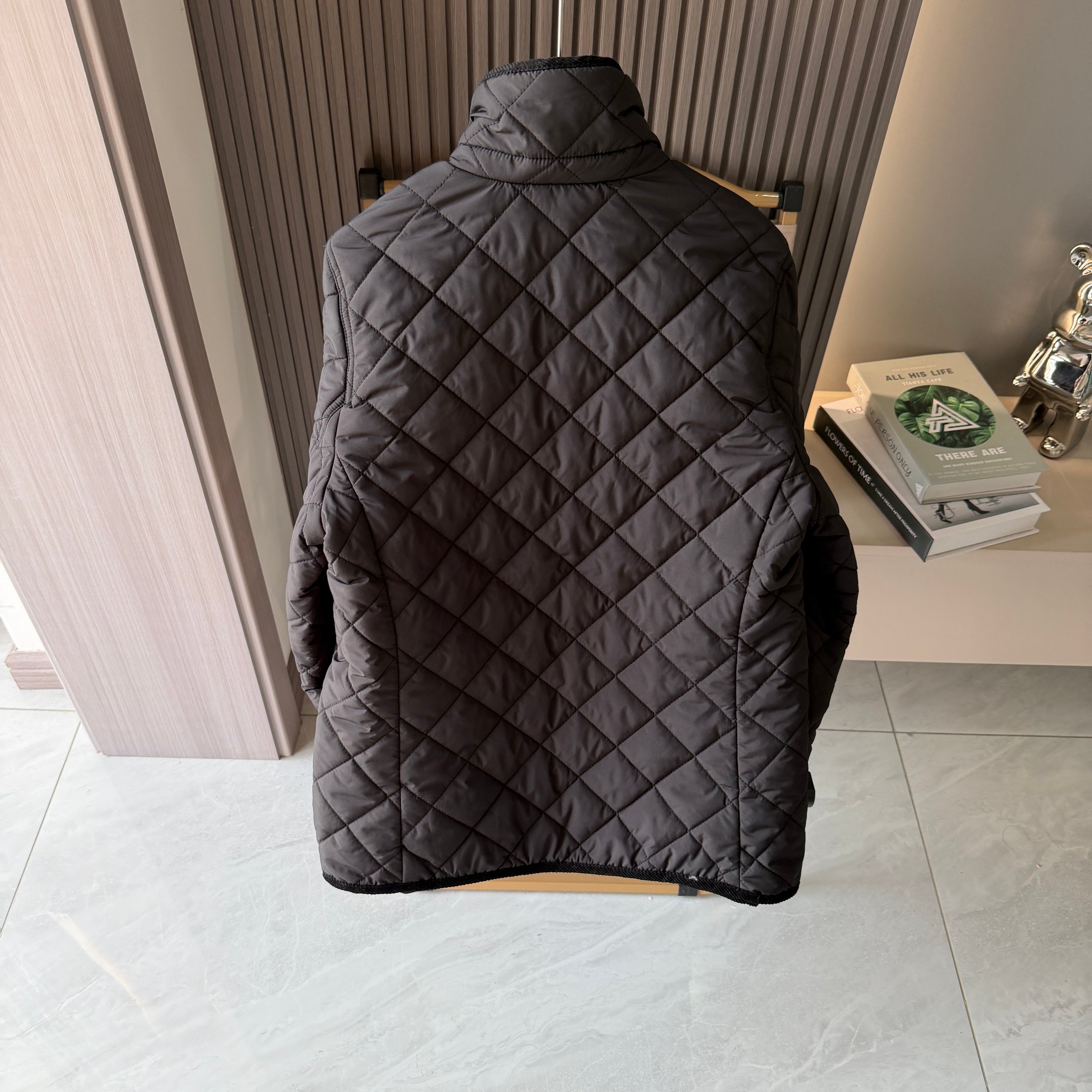 官网同步发售 经典菱格亨利领夹薄棉外套 简约不失格调 绣花机必须是进口的高密百灵达绣花机 在绣花前每一件裁片都是裁剪前做好了花位定位格裁剪 做绣花时做好了白线定位才能保证每一件衣服的绣花都是在格子的中间 版型大差不差 菱格纹理削弱了棉服的膨胀感让版型挺括立体