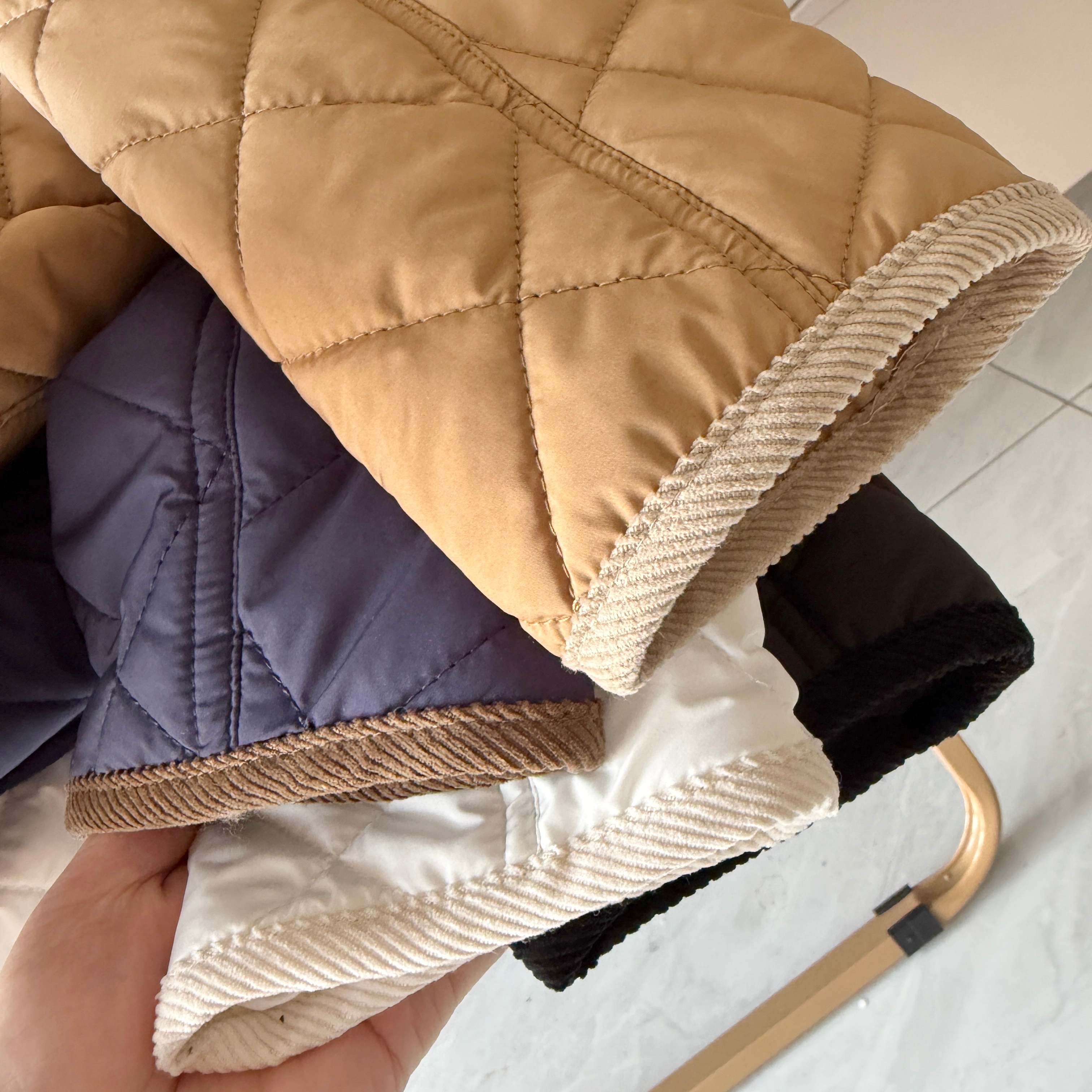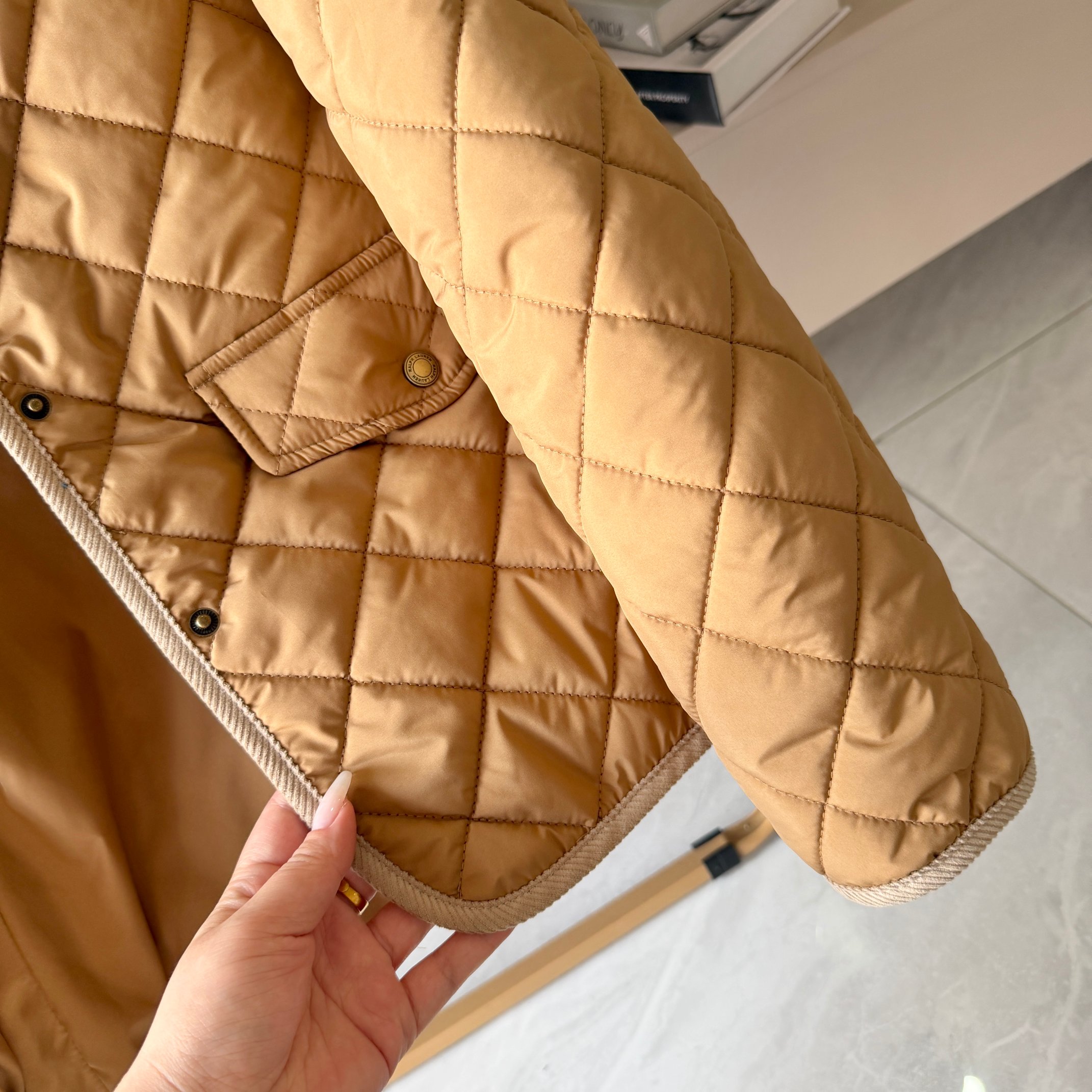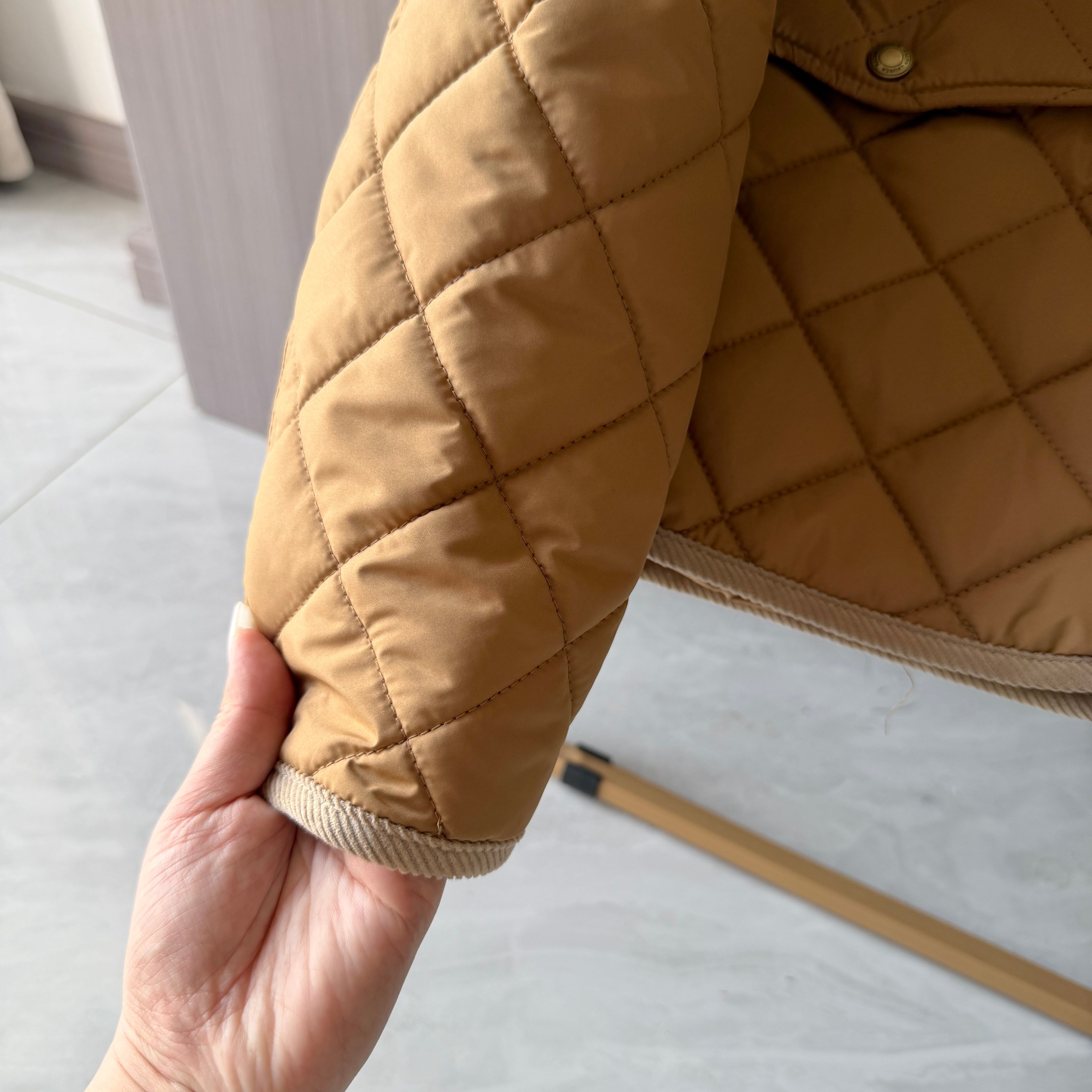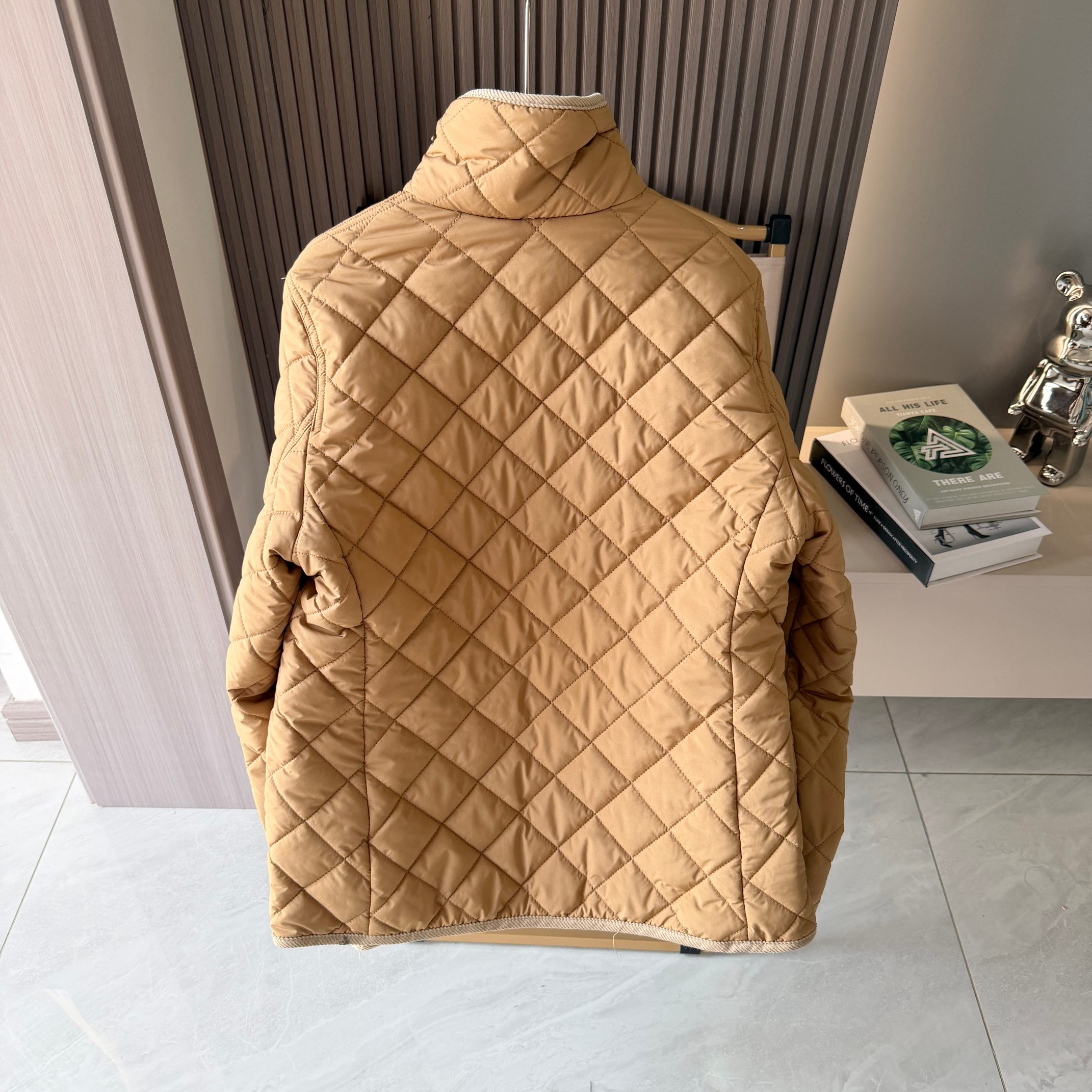 官网同步发售 经典菱格亨利领夹薄棉外套 简约不失格调 绣花机必须是进口的高密百灵达绣花机 在绣花前每一件裁片都是裁剪前做好了花位定位格裁剪 做绣花时做好了白线定位才能保证每一件衣服的绣花都是在格子的中间 版型大差不差 菱格纹理削弱了棉服的膨胀感让版型挺括立体