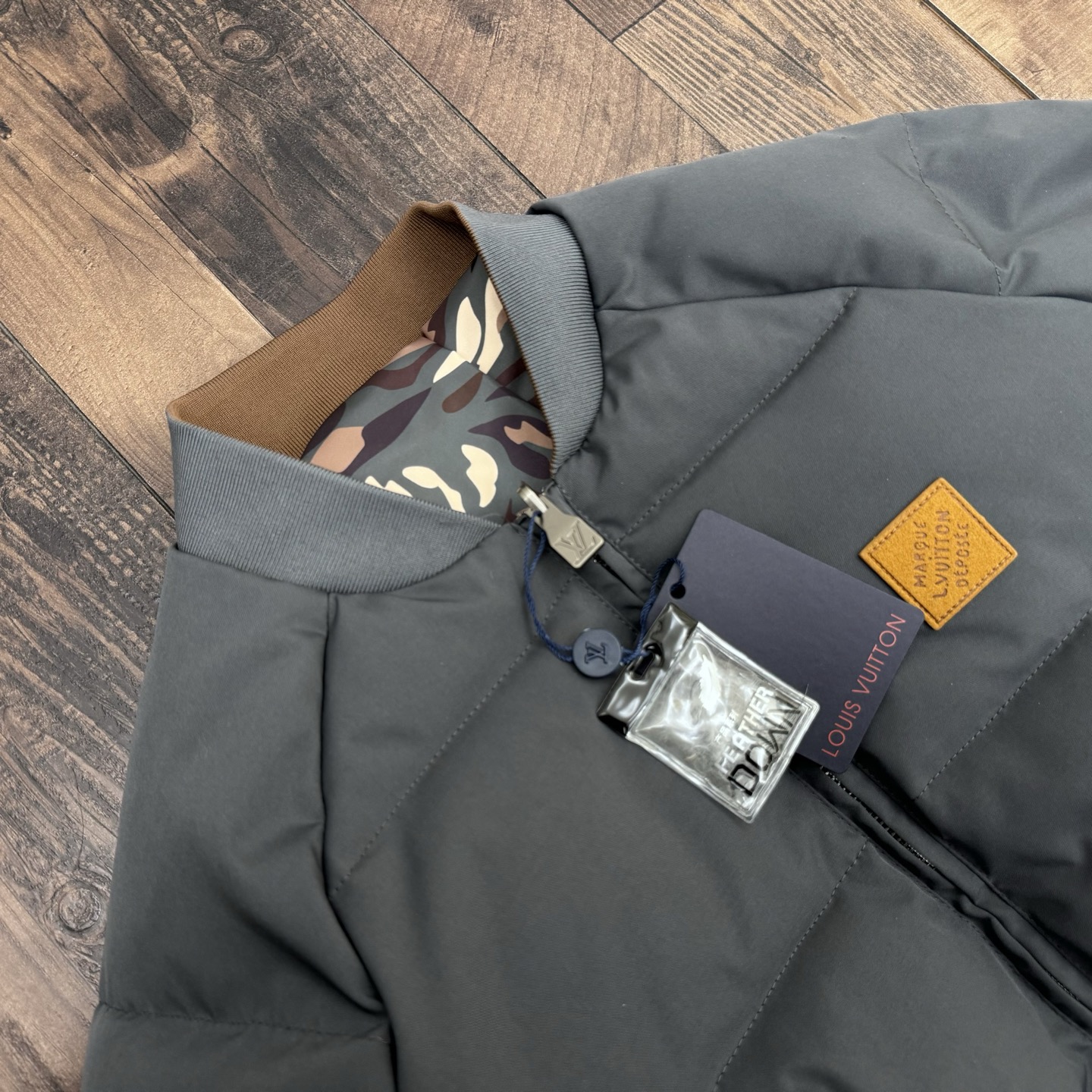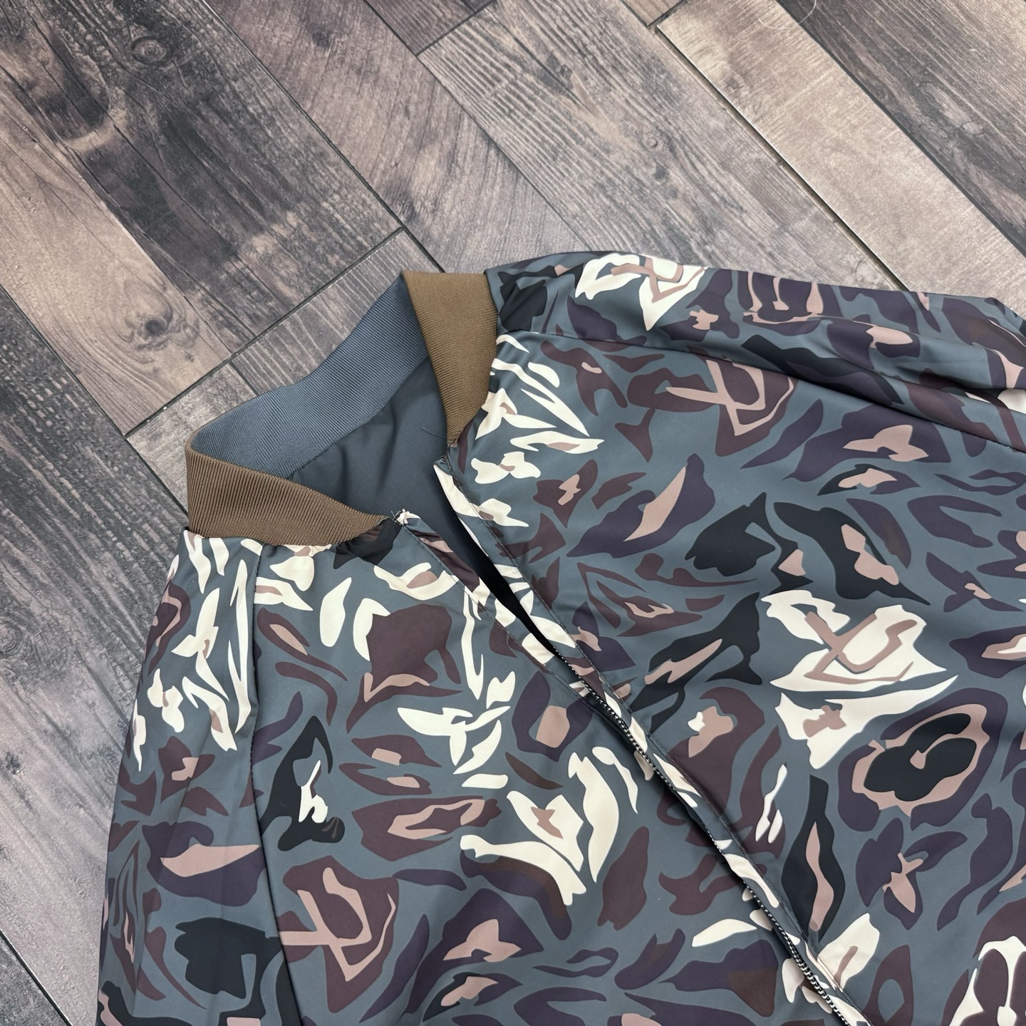 采用优质面料精心制作 一面灰色一面迷彩老花图案 另一面是活力四射的亮面反光材质 运用了反了藏肉显瘦的巧思 落肩设计通过精确的剪裁弱化肩线 使得肩部线条看起来更加柔和自然 同时也能修饰肩部的不足
