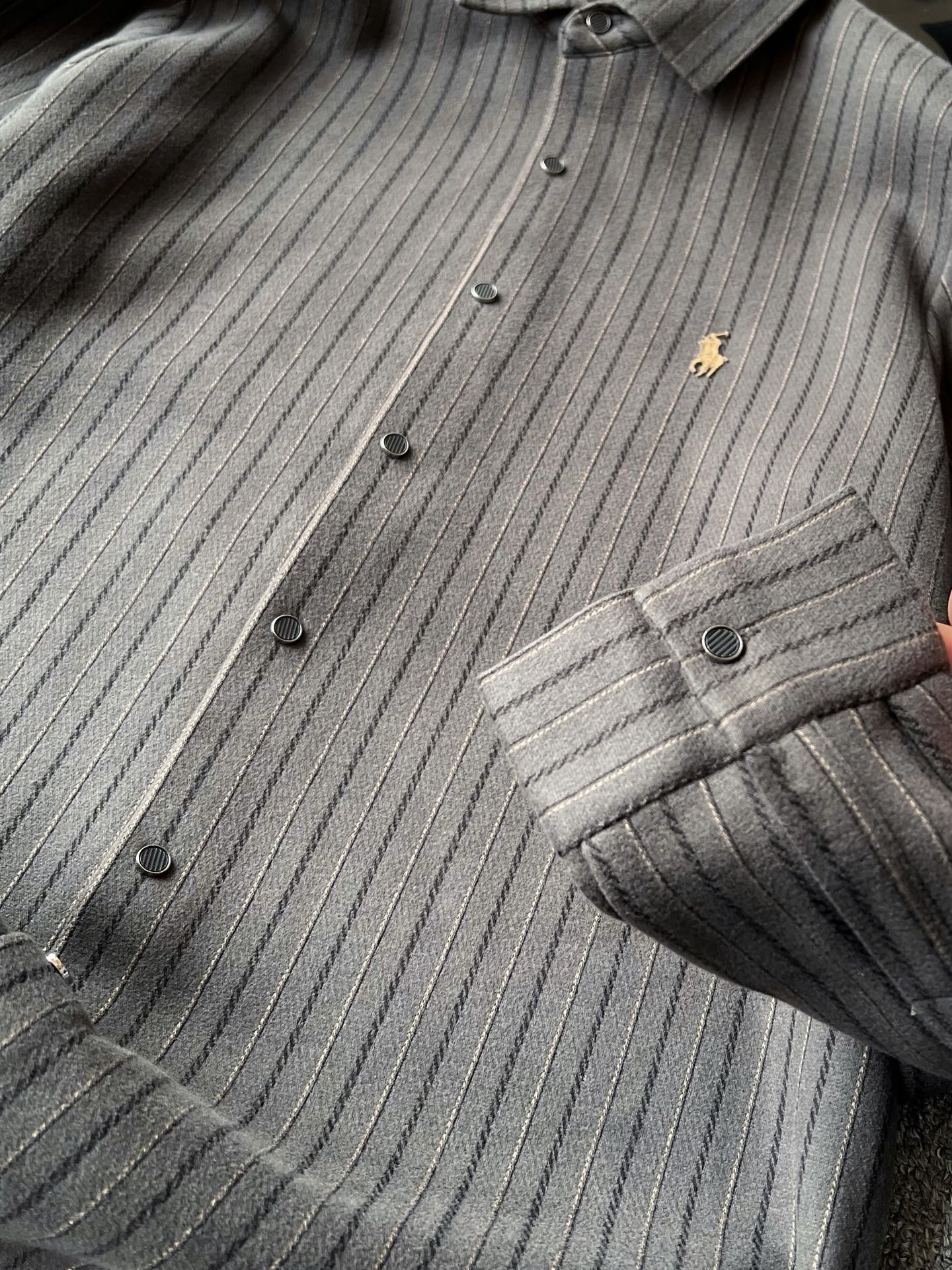 细节细节再细节 Ralph Lauren家商场新品一体色织竖条纹超柔羊毛蚕丝衬衫外套 胸前立体拉夫劳伦Polo棕标 手绘线条肌理 十分精致 高端定制浮雕五金纽扣细节 外穿内搭高级感拉满