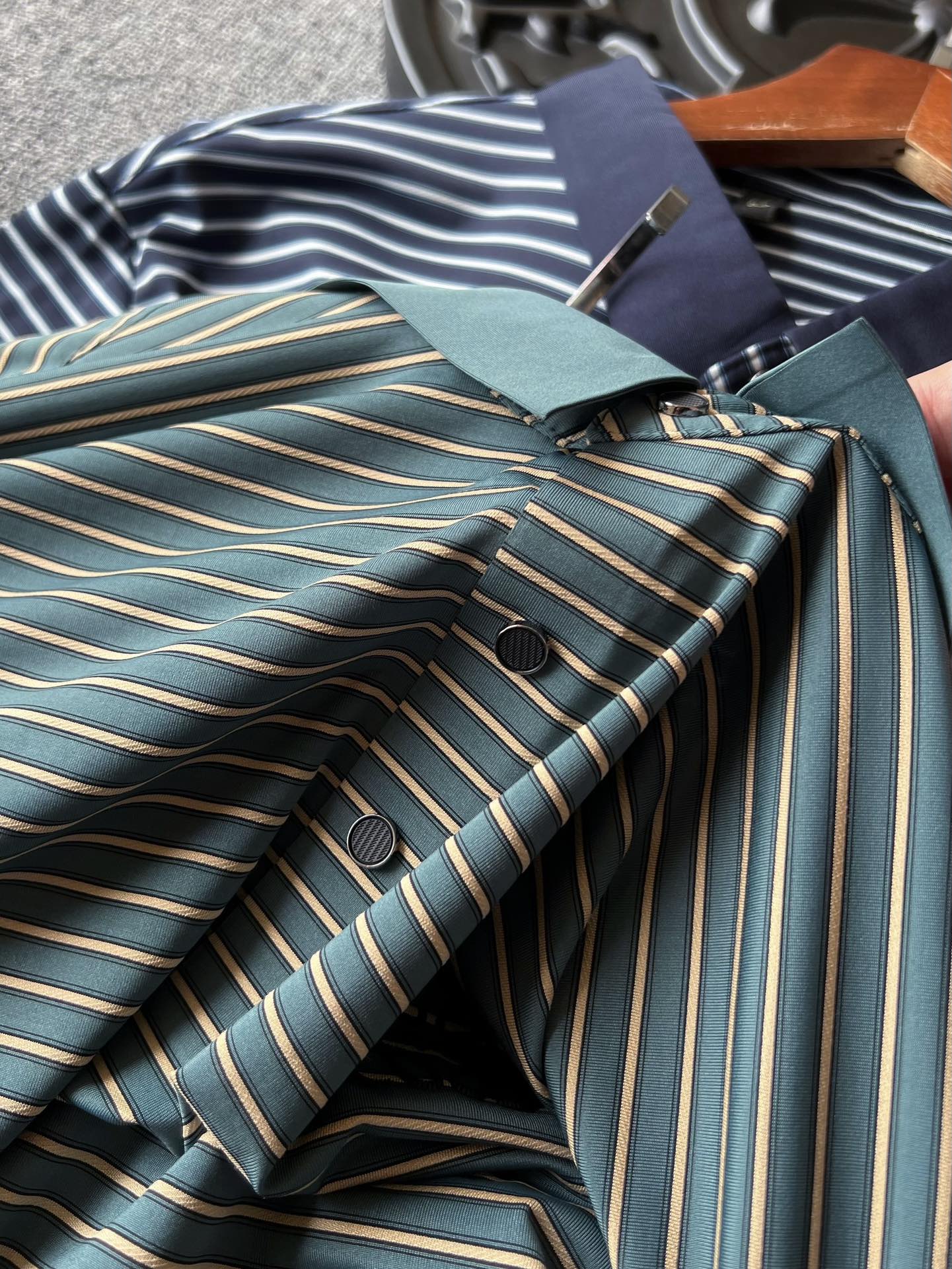 罗意威家今年最新冰氧锦棉面料 这种面料特别珍贵 宽窄双色提花色织工艺 窄条轮廓还做双线条细节 十分精致 上身特别爽肤 做到极致SPA滋润肌肤的同时 极强透气排汗功效