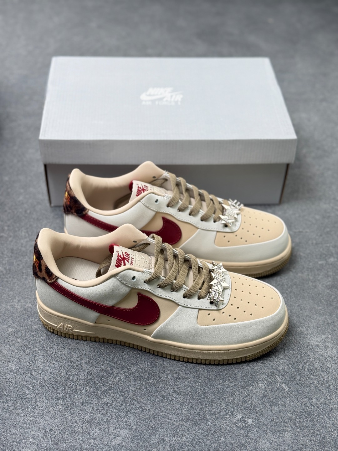 米白与浅卡其的温柔底色 搭配酒红勾子点缀 自带复古氛围感 鞋头的金属星星挂饰更是点睛之笔 甜酷感直接拉满