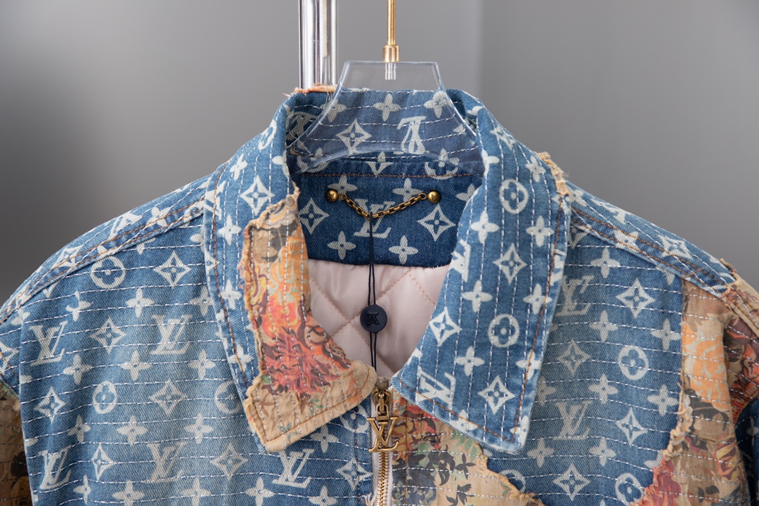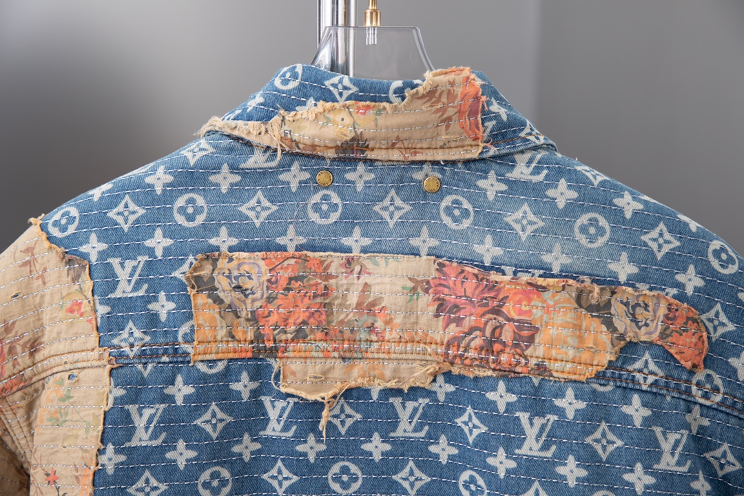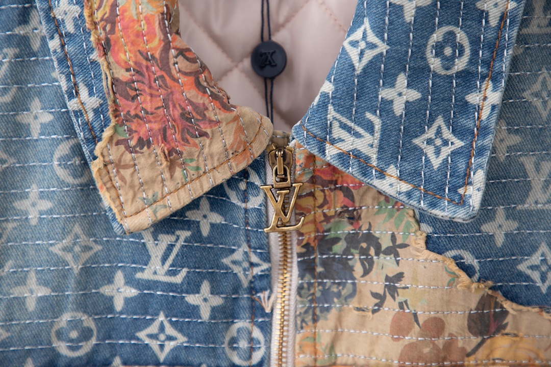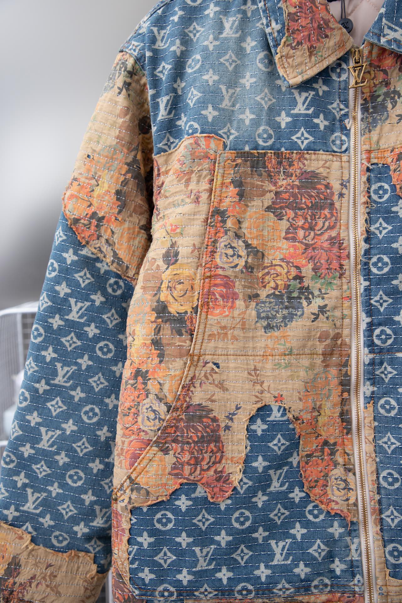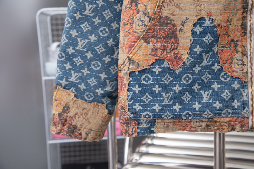 本款工装牛仔夹克呈现仿佛历经沧桑的破坏效果 与高定风格廓形碰撞鲜明对比 丹宁帆布铺陈 Monogram 图案 花卉嵌饰采用日本 Boro 技法手工打造 LV 拉链头完善细节 内里夹棉标准版型