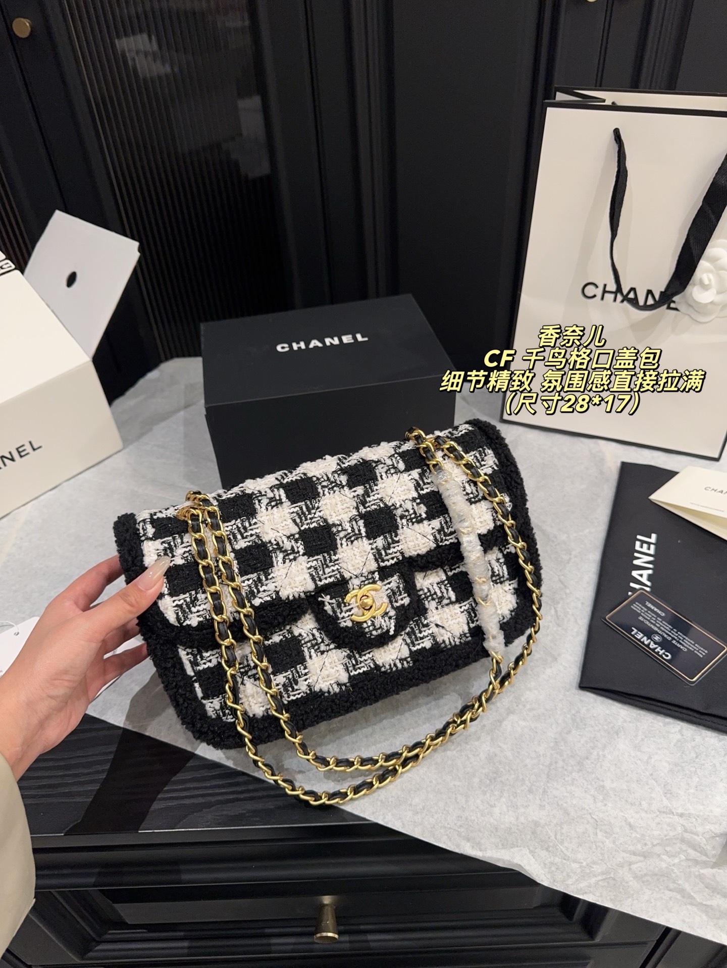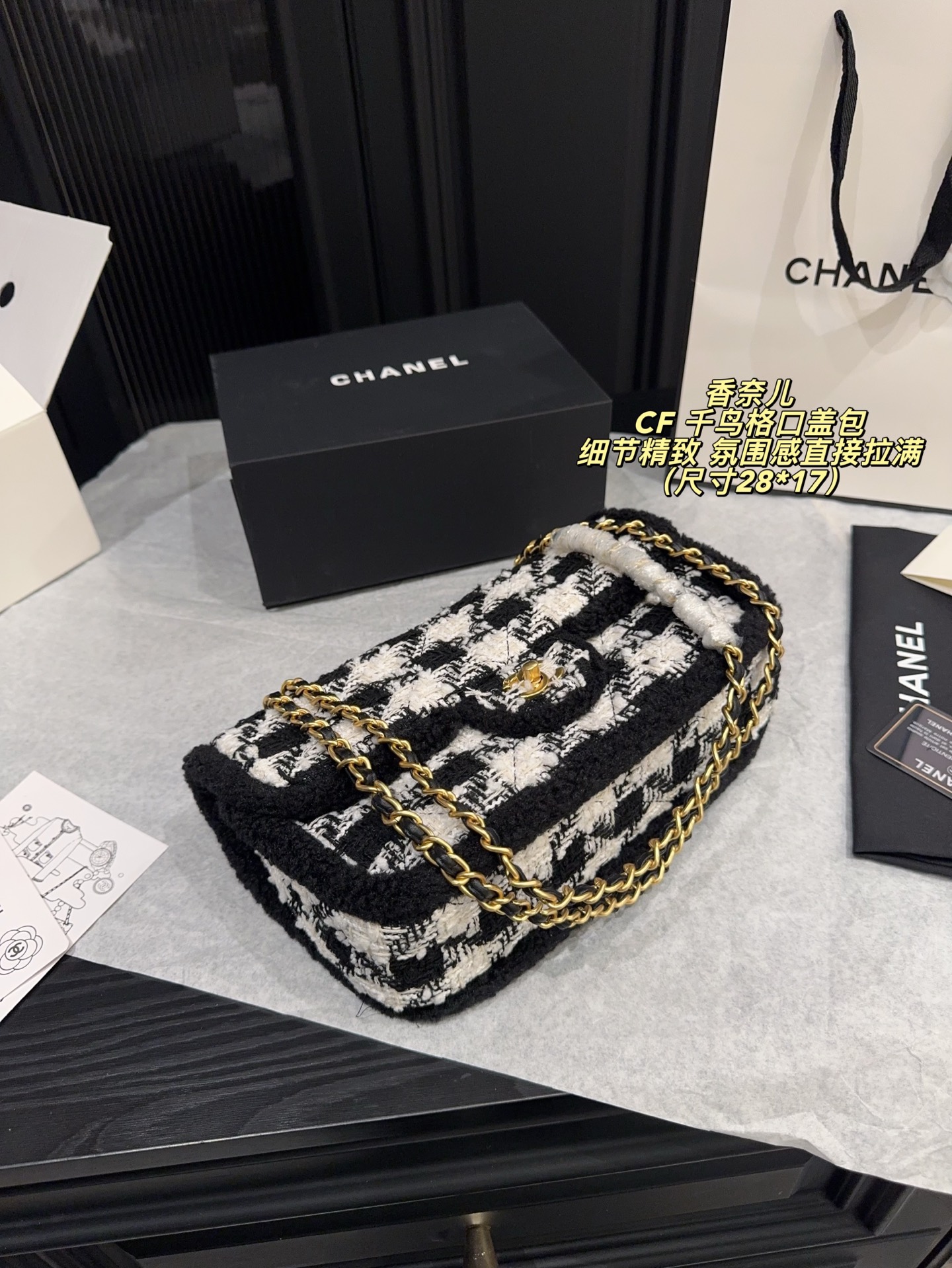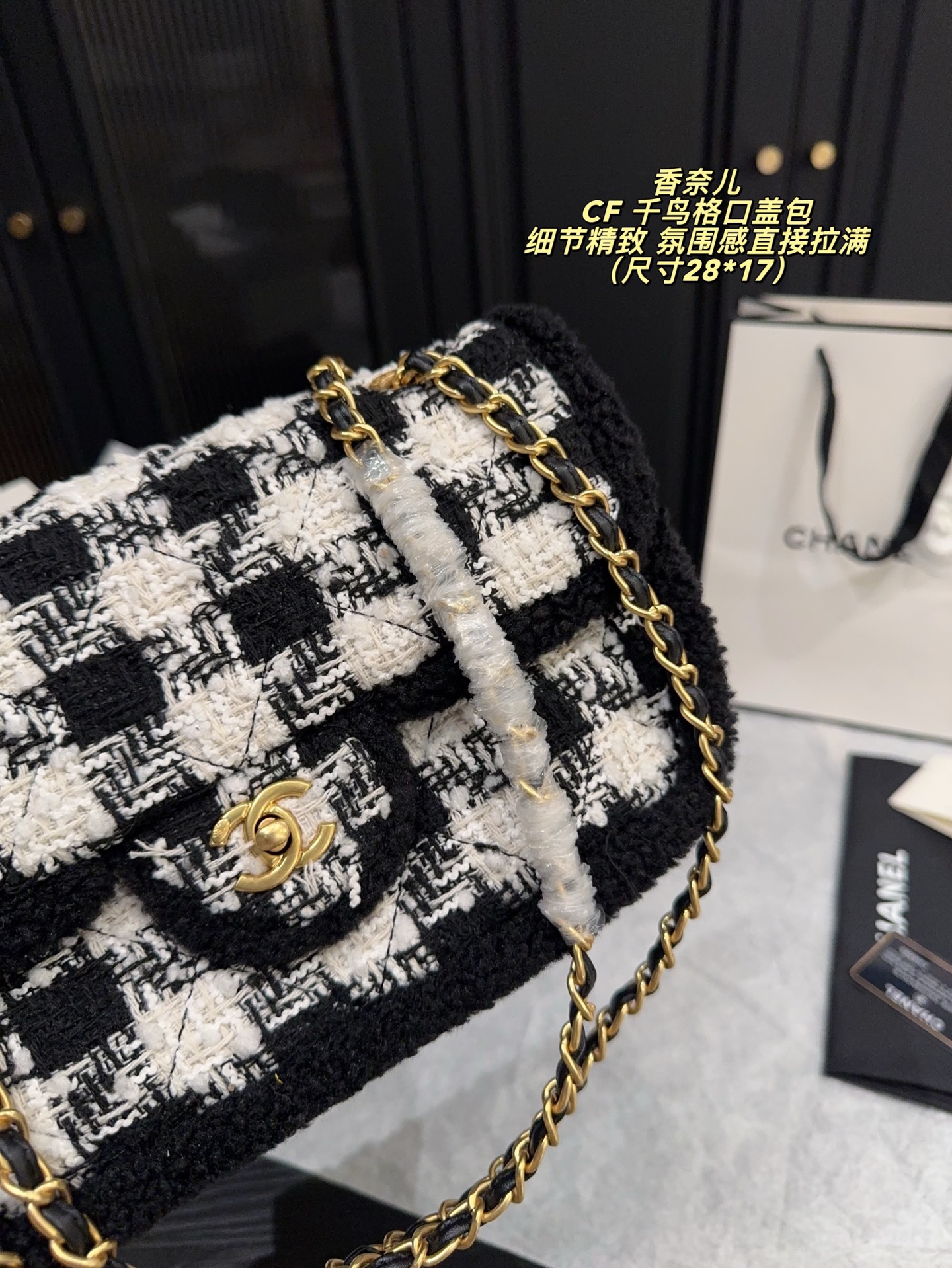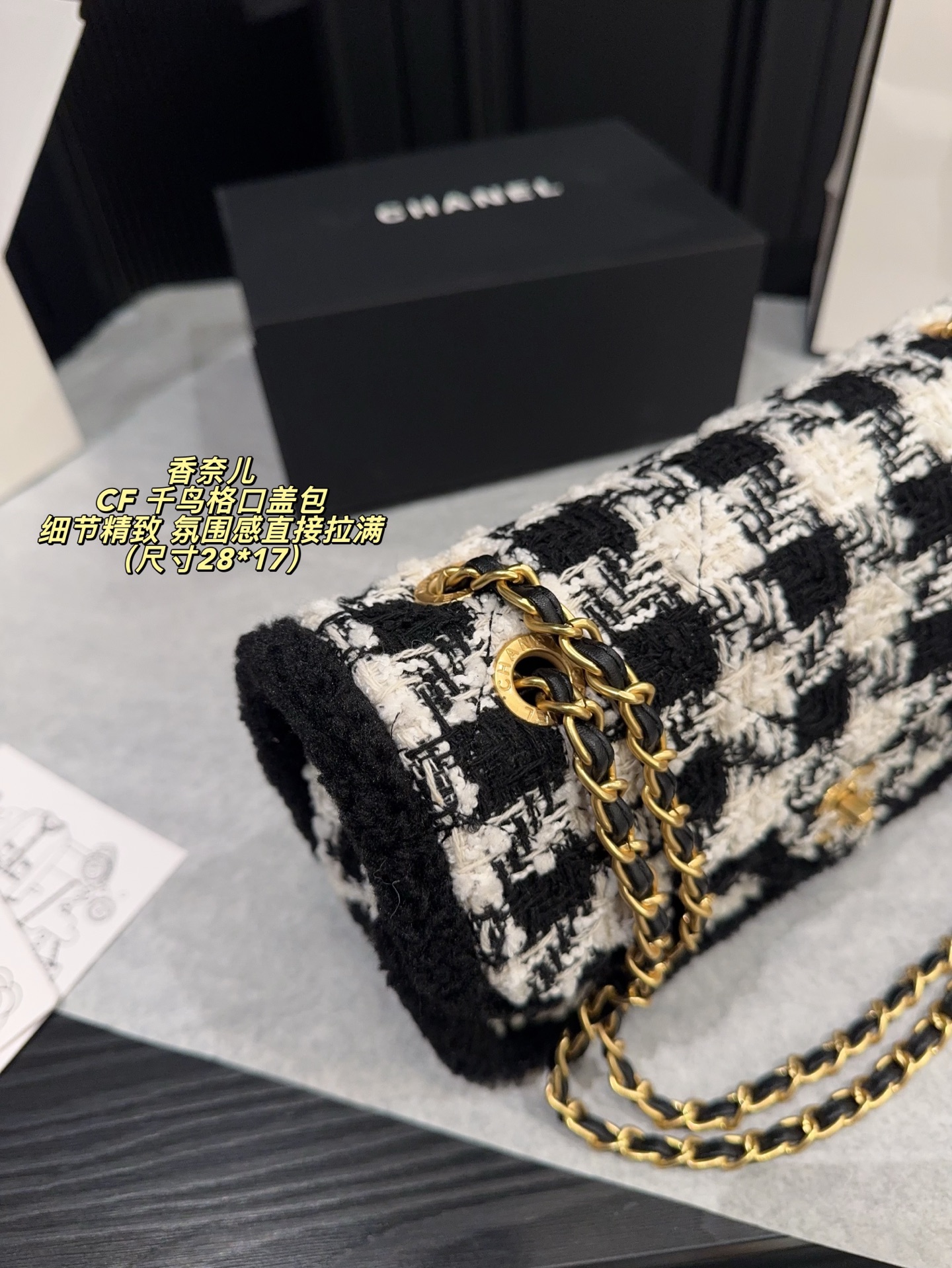 无盒尺寸28 17 Chanel 香奈儿CF 千鸟格口盖包 经典千鸟格纹 黑色粗花呢边 优雅复古气质满分 金属链条肩带 双CLogo 细节精致 品牌辨识度超高 日常通勤 休闲都能轻松驾驭 实用又时髦 千鸟格纹是香奈儿标志性元素 秋冬搭配大衣毛衣 氛围感直接拉满