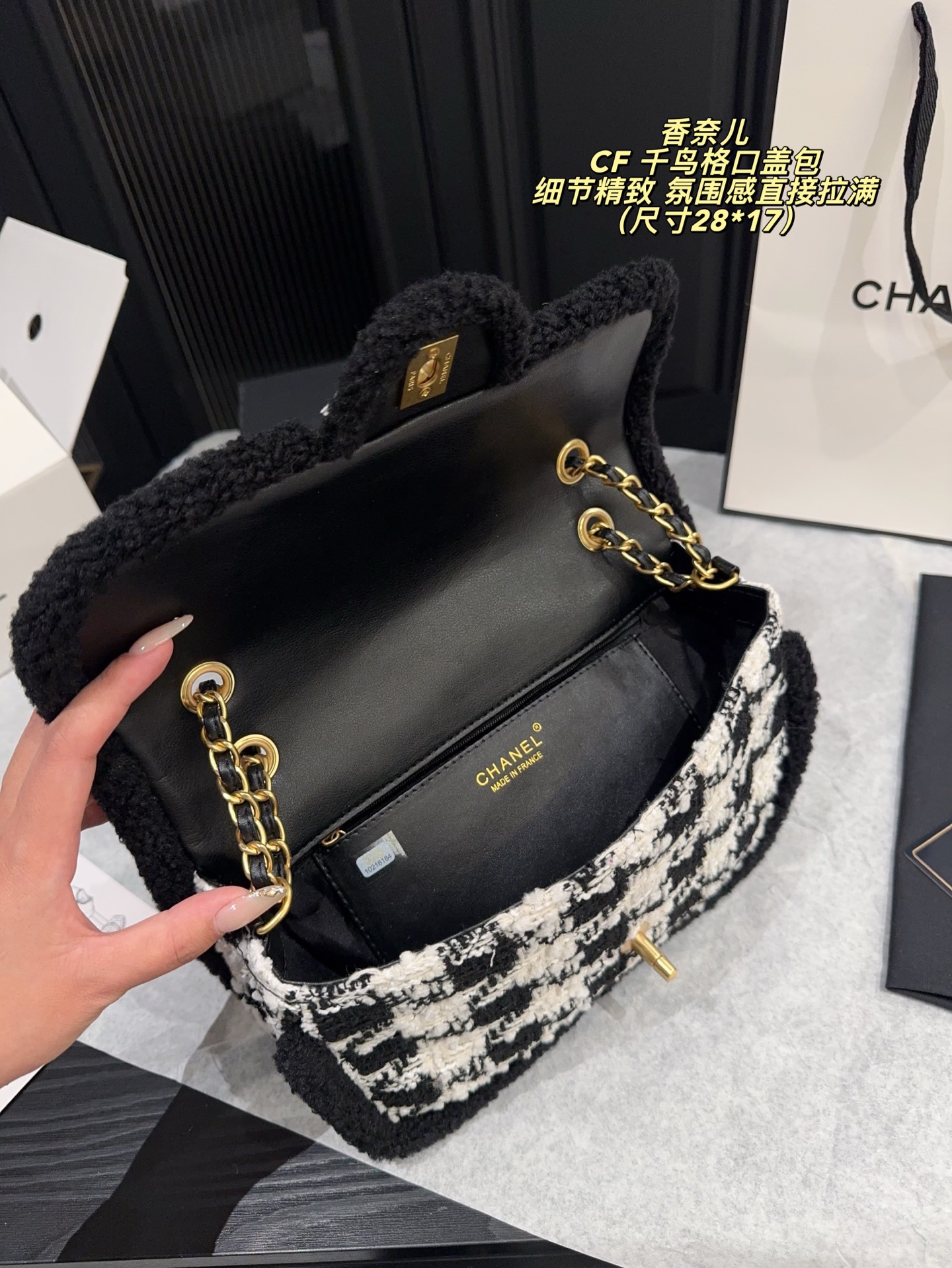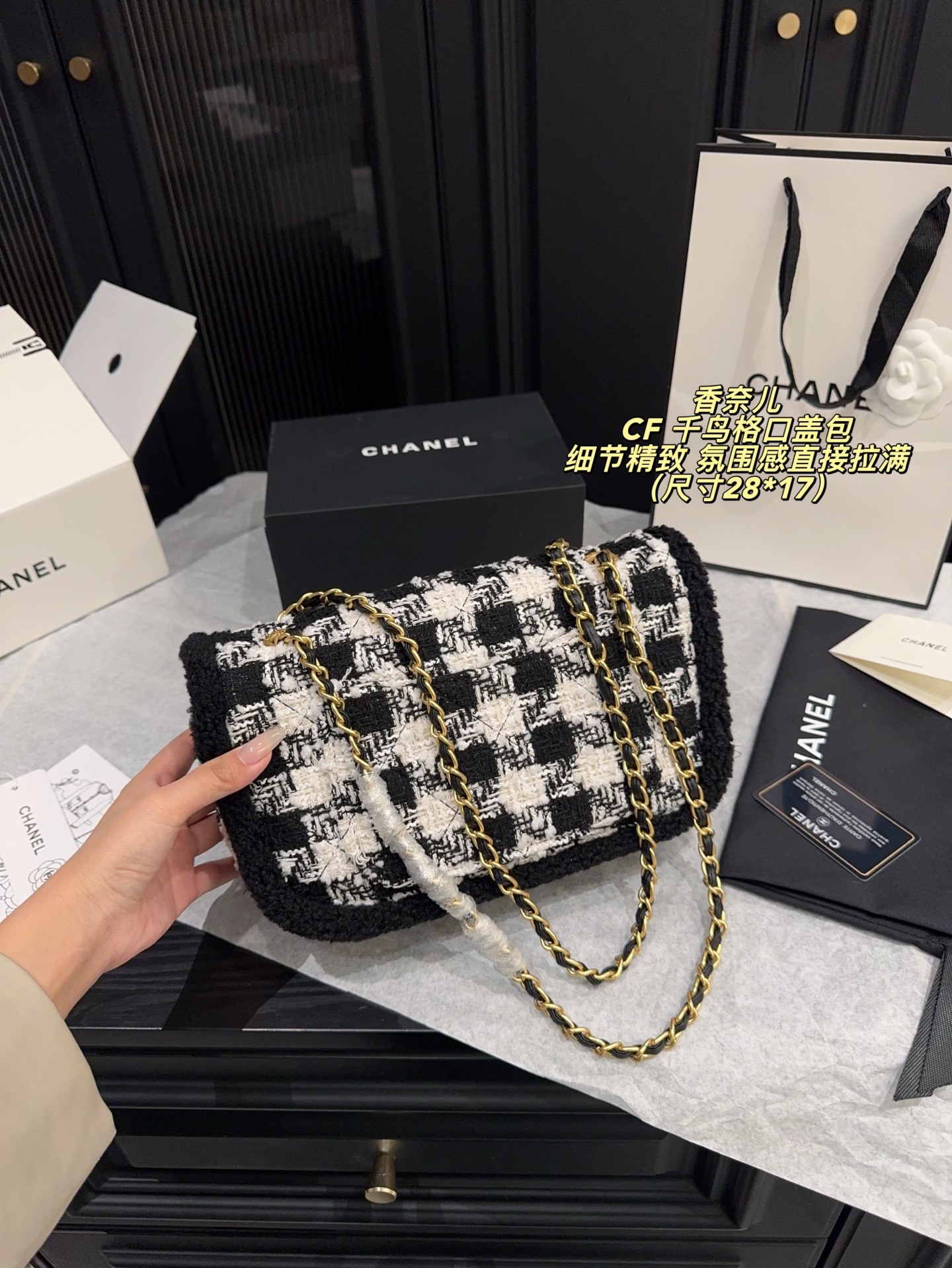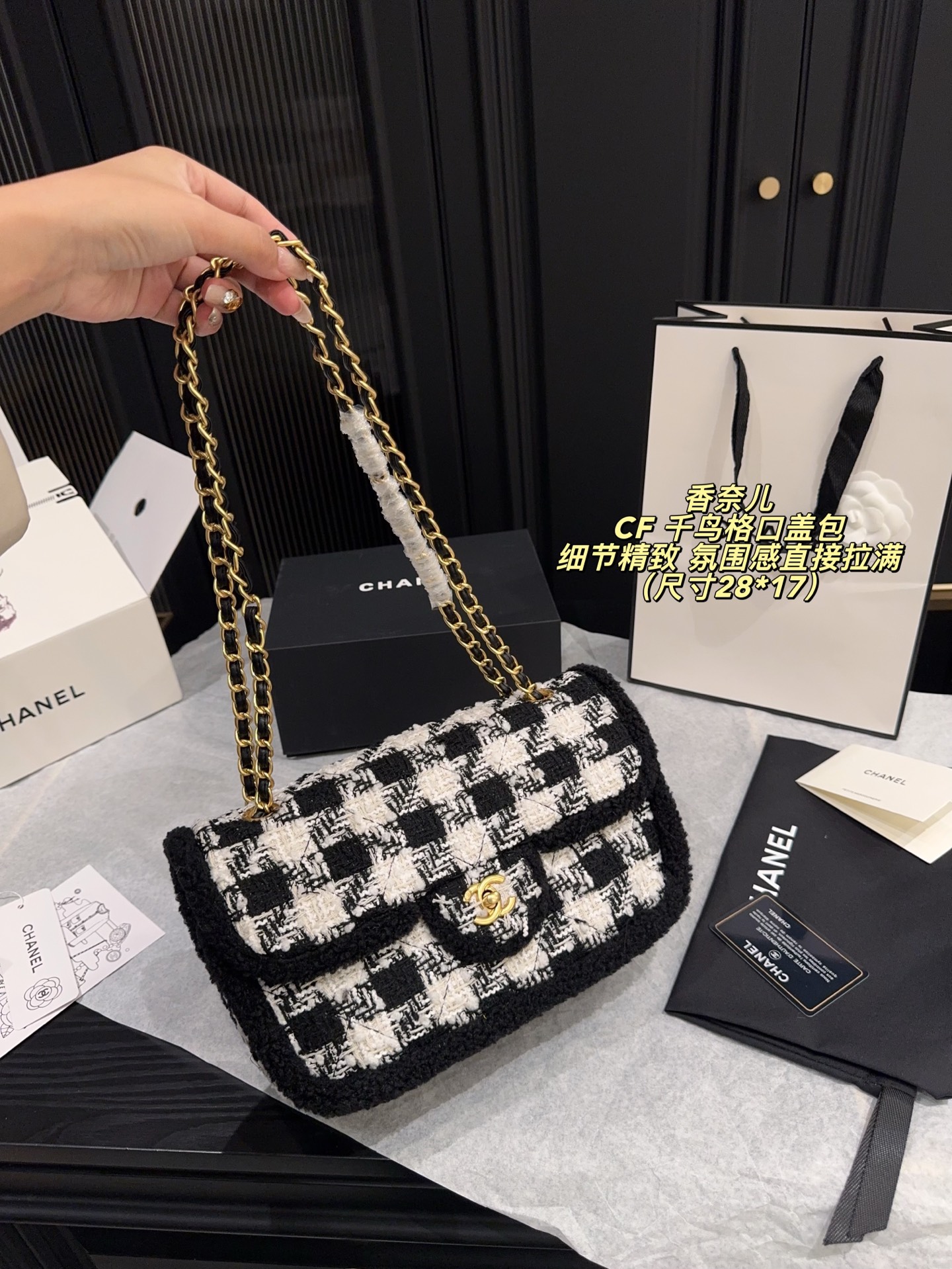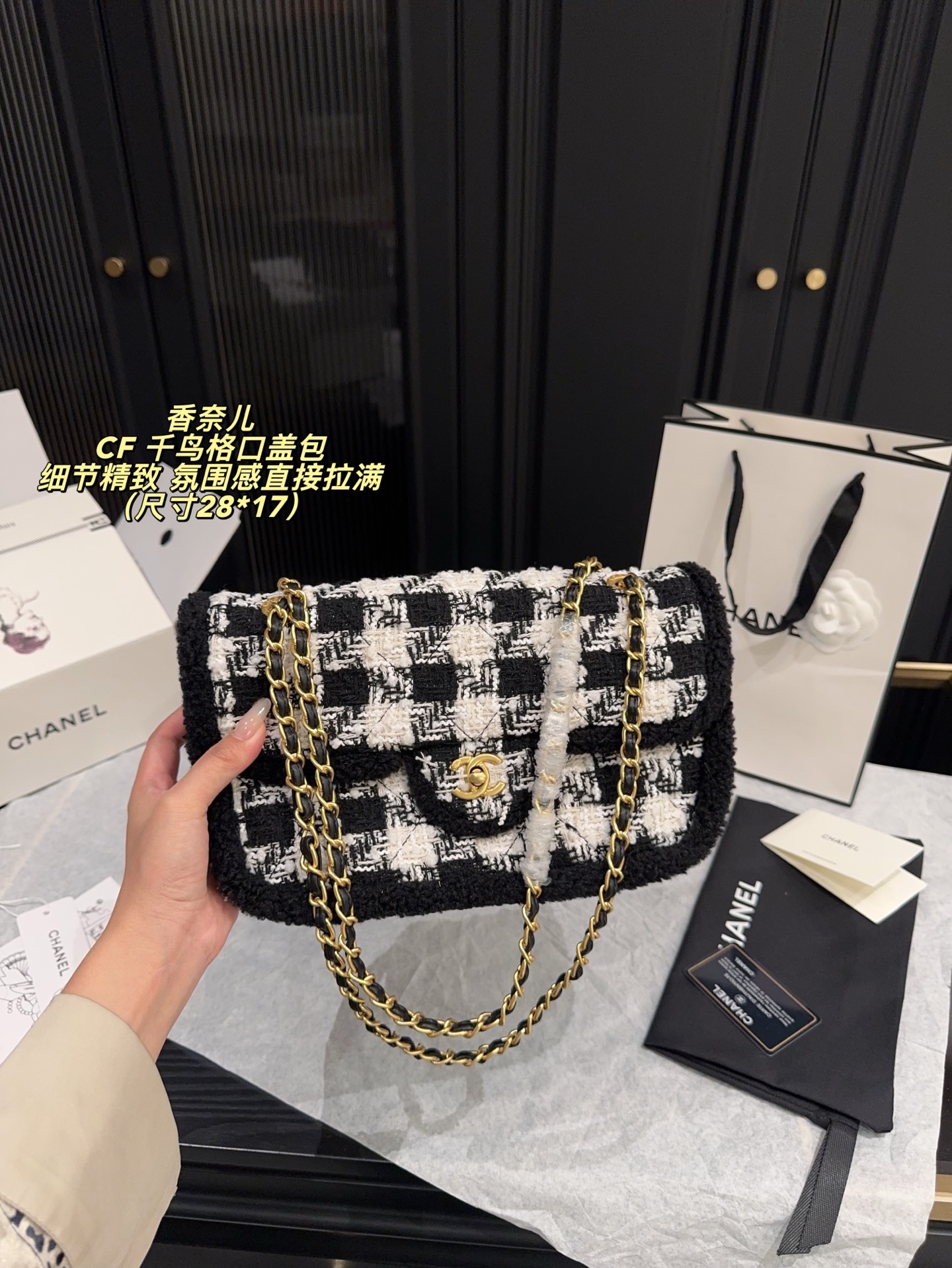 无盒尺寸28 17 Chanel 香奈儿CF 千鸟格口盖包 经典千鸟格纹 黑色粗花呢边 优雅复古气质满分 金属链条肩带 双CLogo 细节精致 品牌辨识度超高 日常通勤 休闲都能轻松驾驭 实用又时髦 千鸟格纹是香奈儿标志性元素 秋冬搭配大衣毛衣 氛围感直接拉满