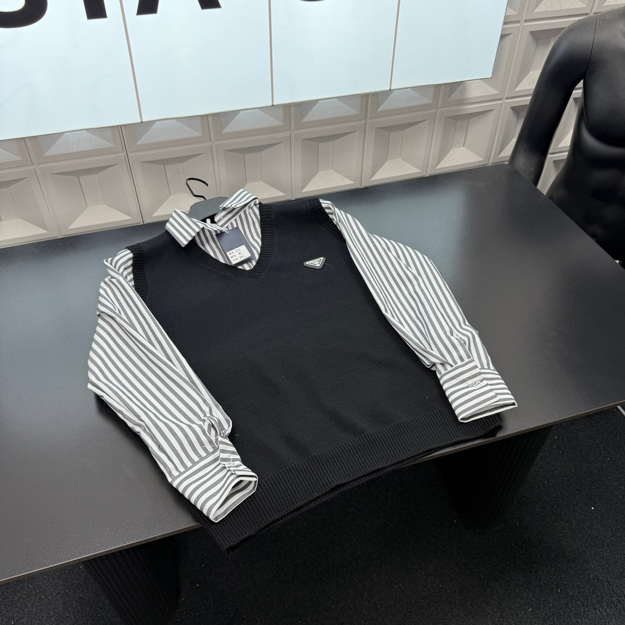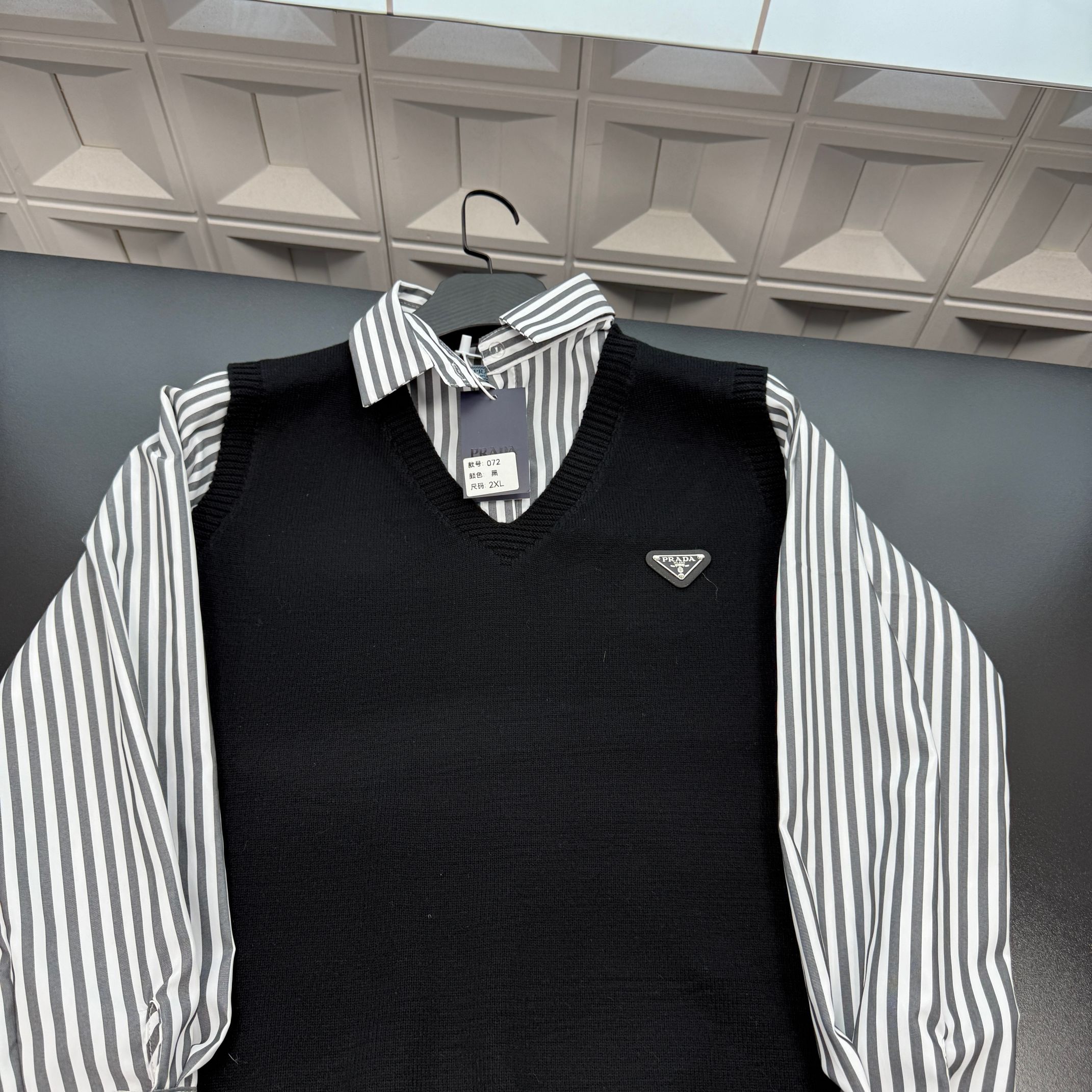 冬季热销爆款网红博主推荐款Prada普拉达假两件翻领毛衣 金属三角牌 条纹内搭 纯色针织背心假两件 三标齐全官网一致 放大看细节原相机实物拍摄 颜色 黑色 尺码 L 4xl L 80 105斤 XL 105 120斤 2XL 120 140斤 3XL 140 160斤 4XL 160 180斤