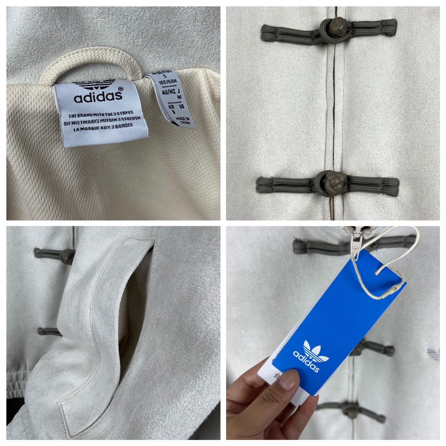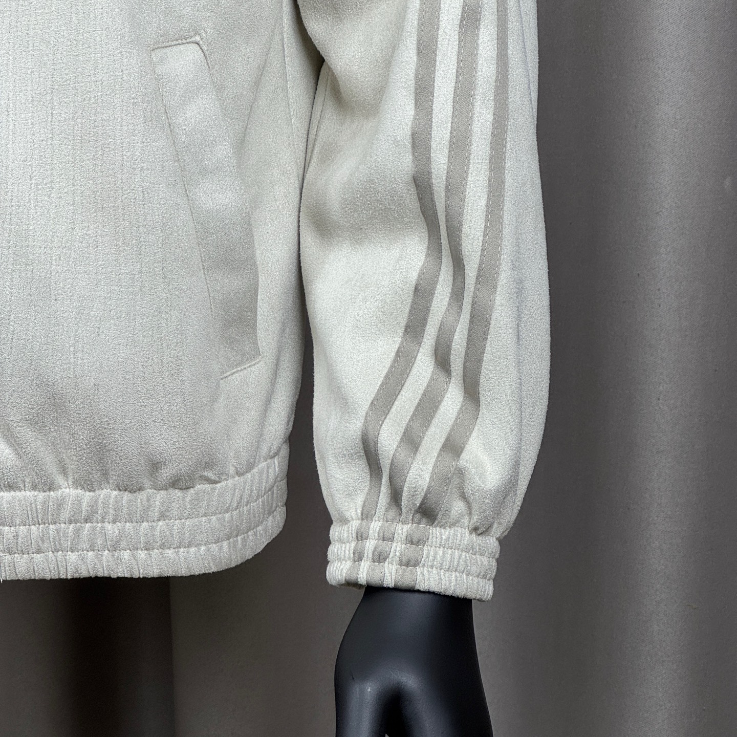 面料采用定染软麂皮 搭配网眼内里 垂坠感十足 上身柔软舒适 胸前经典刺绣三叶草logo 纯手工滴胶盘扣加上拉链门襟 袖子上三条杠压条从领口一直到袖口 两侧有口袋 下摆和袖口采用松紧收口 防风保暖的同时也增加了整体造型感 五个颜色上身都好看 男女都可以轻松驾驭