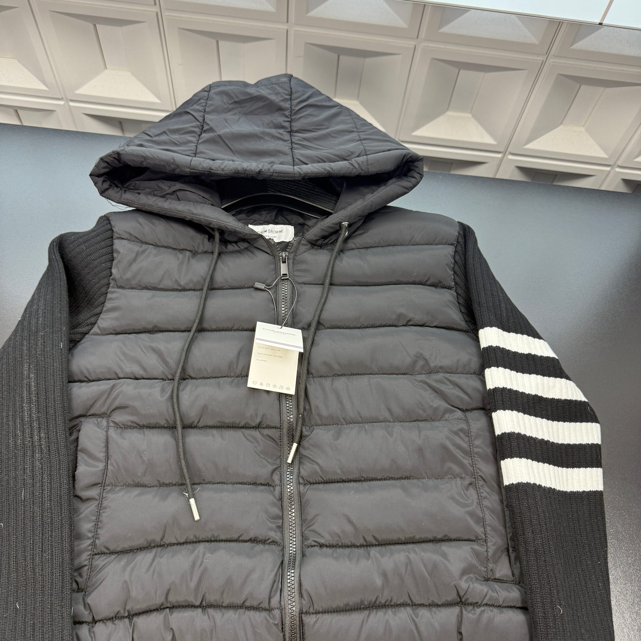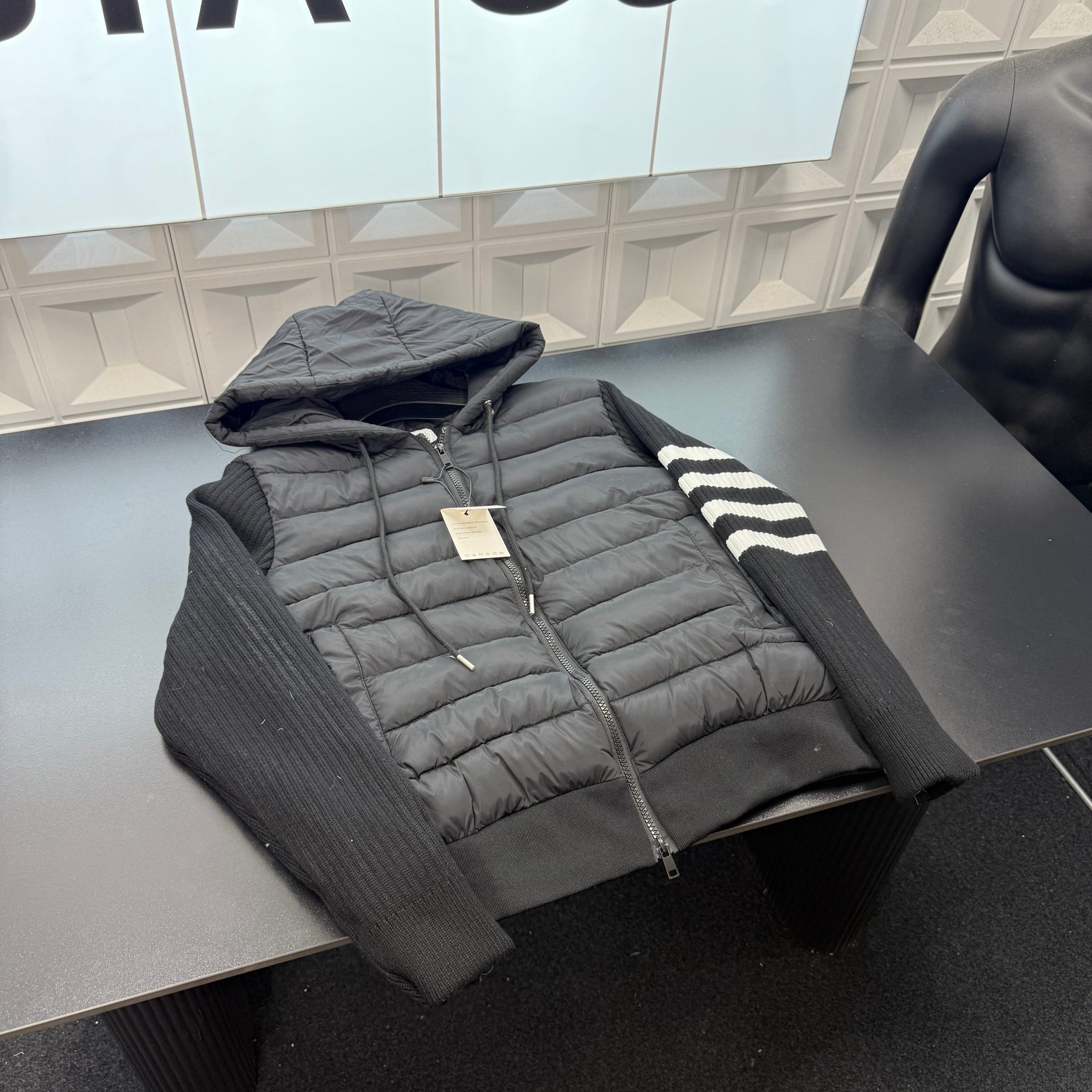 冬季热销爆款网红博主推荐款TB连帽羽绒棉服 拼接针织袖 袖子四道杠 排骨服 三标齐全官网一致 放大看细节原相机实物拍摄 颜色 黑色 尺码 L 4xl L 80 105斤 XL 105 120斤 2XL 120 140斤 3XL 140 160斤 4XL 160 180斤