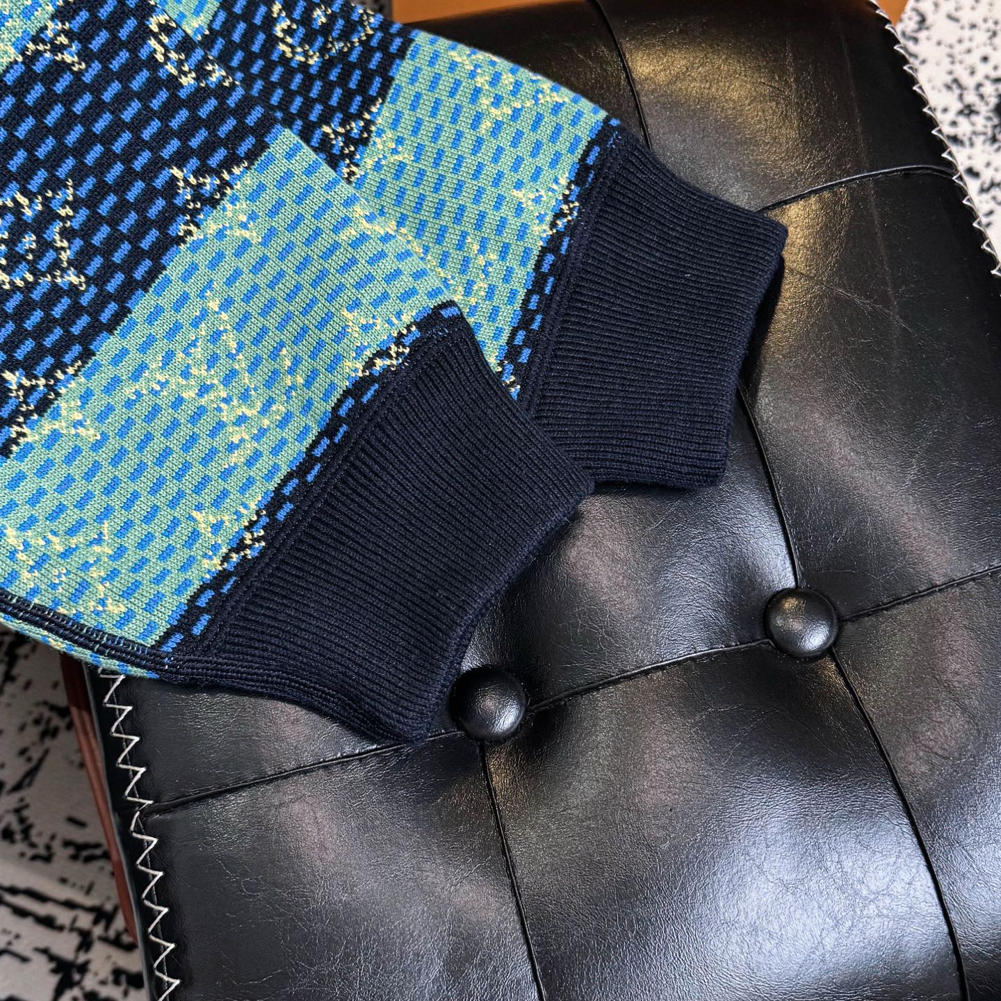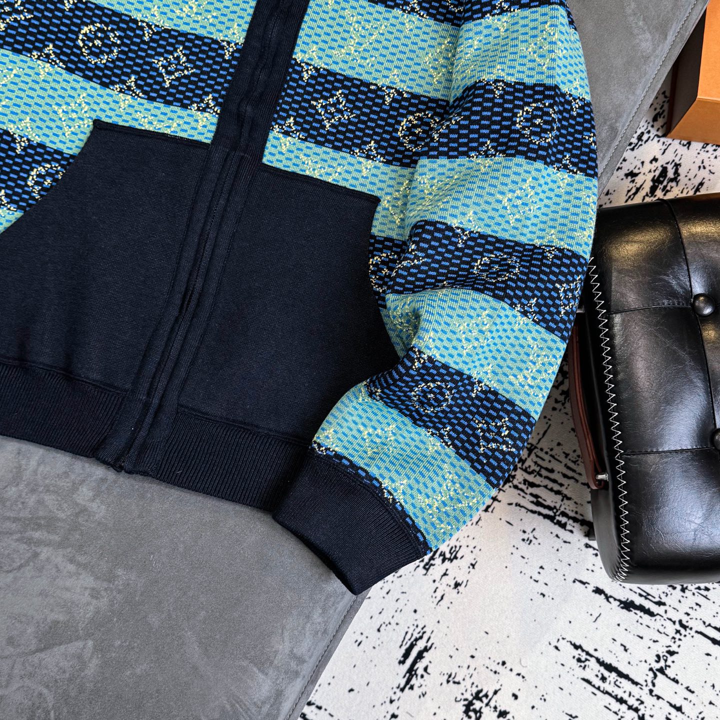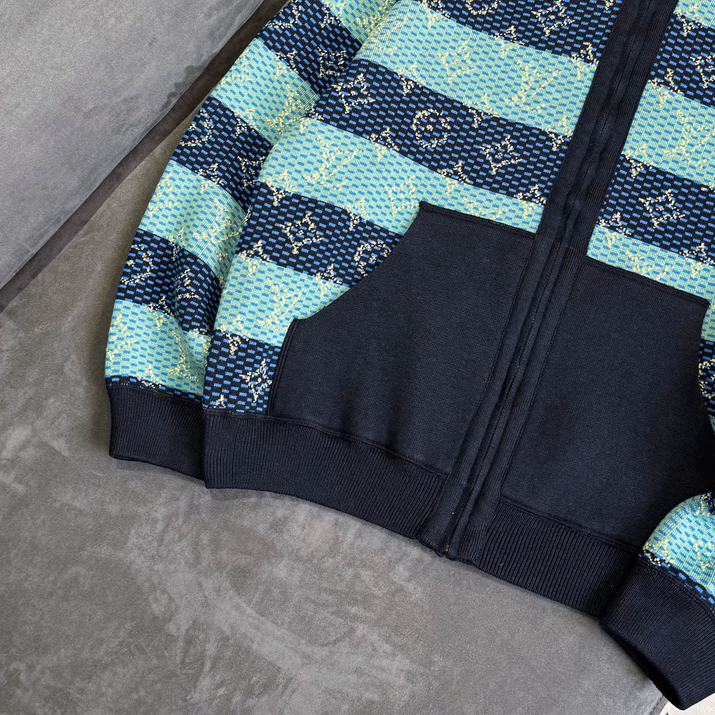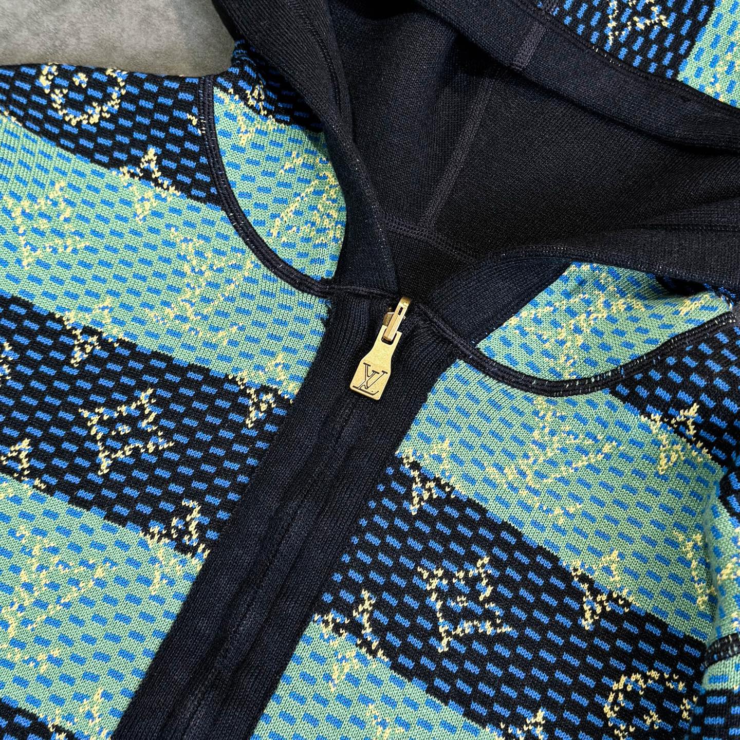 LV 2025秋冬男士针织连帽外套 深蓝 绿色拼接 经典Monogram老花 星形图案 辨识度超高计 柔软针织面料 保暖又舒适 拉链开合 连帽设计 休闲实用 袖口和下摆深蓝罗纹收口 细节满分 校园风 青春感 秋冬日常或轻运动都很适合 搭配牛仔裤 运动鞋 轻松get时髦造型