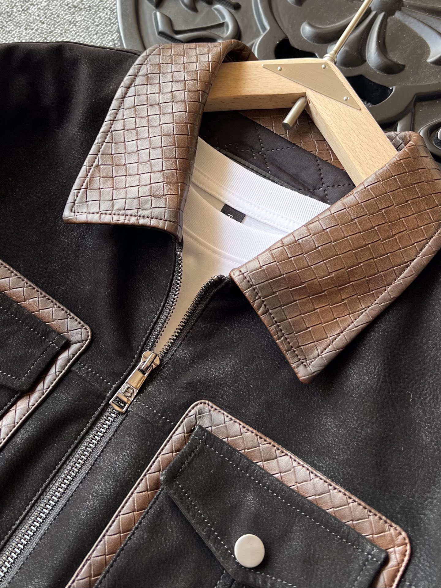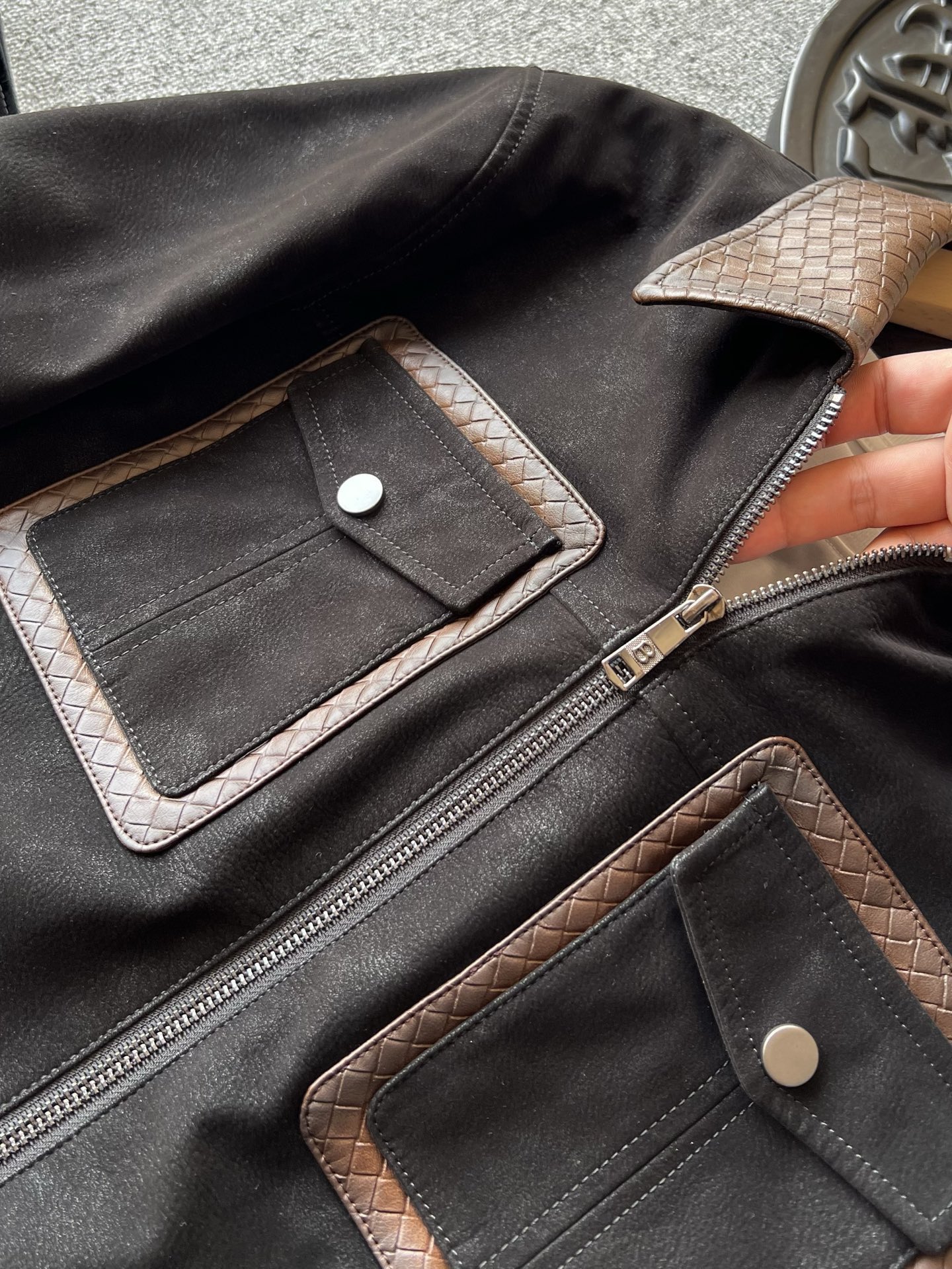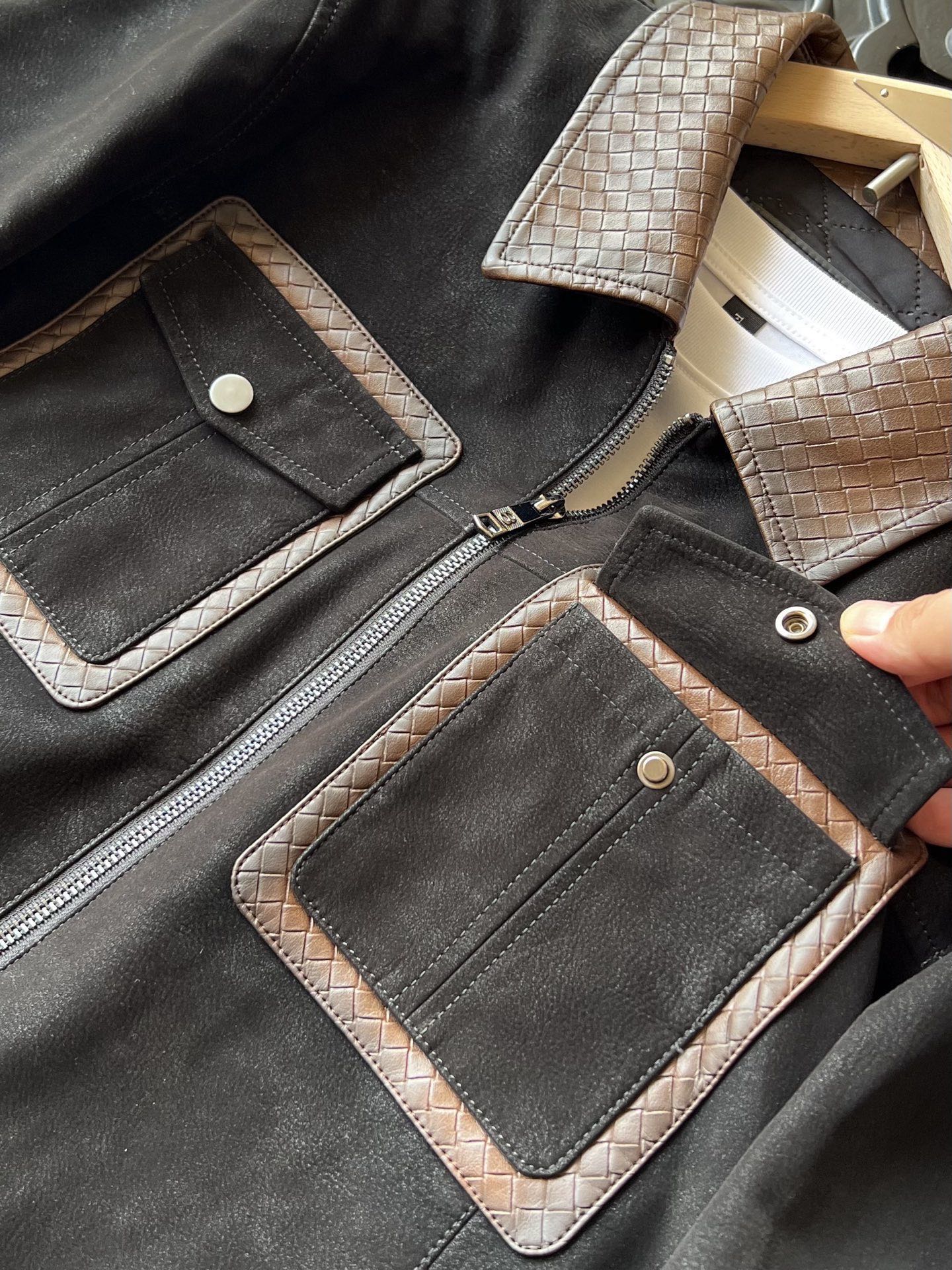 细节细节再细节 Zegna家商场新品三色羊皮加厚外套翻领皮衣 胸前双工装口袋设计 做了双层拼接工艺 领口钢印压花肌理 和口袋轮廓形成很好的立体感 内里做了热熔加固棉层设计 具有很好的锁温以及单向透气排湿性