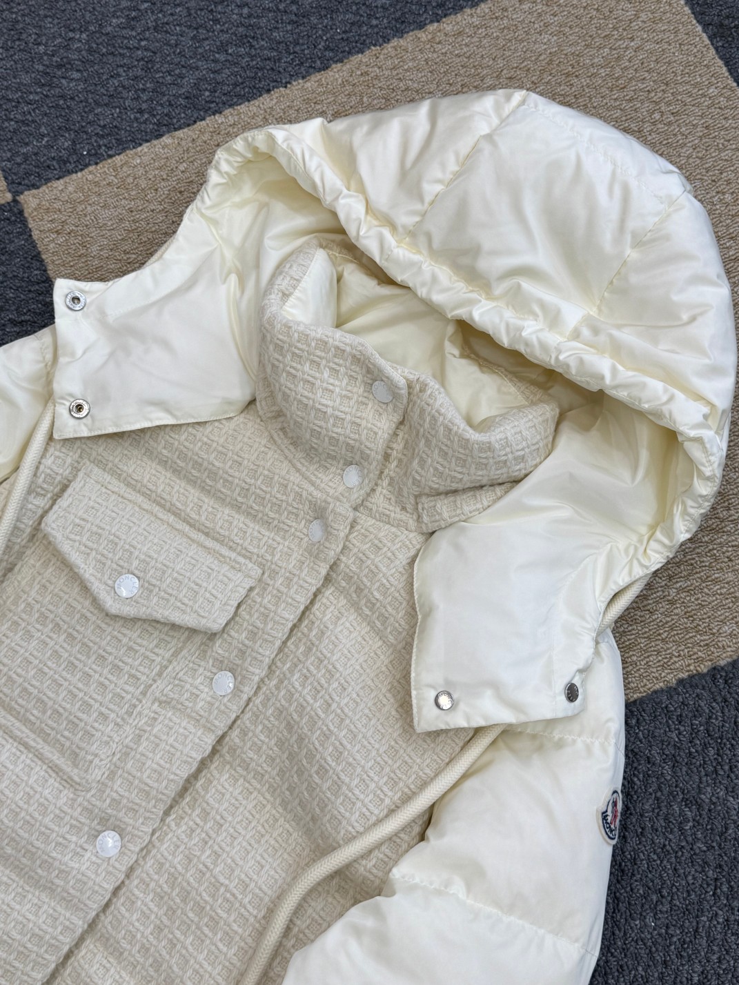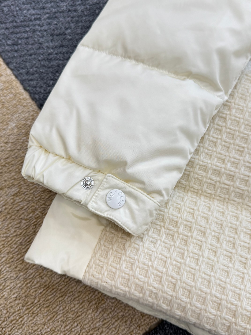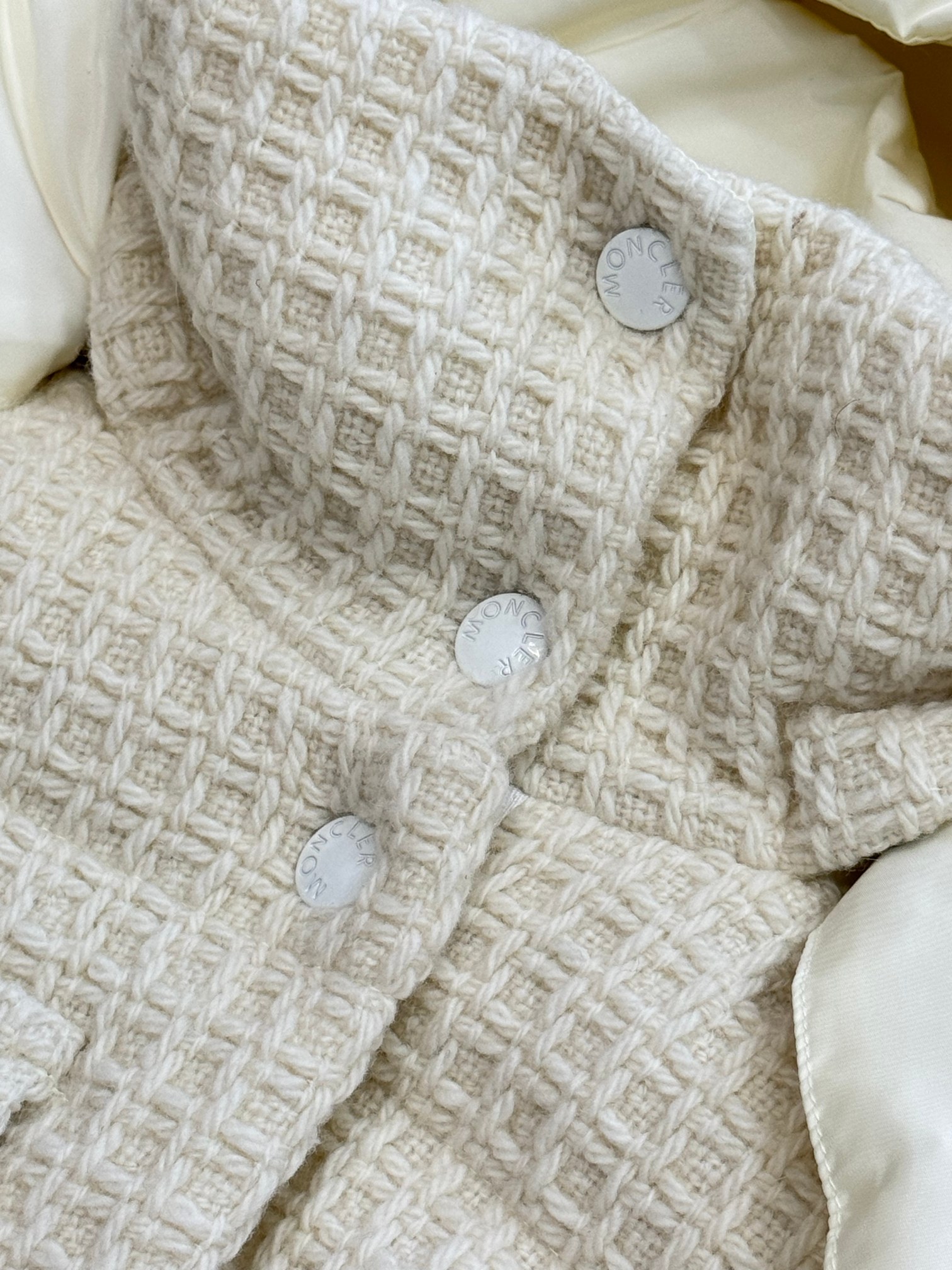 高端货 Moncler 蒙口女士拼接羊毛收腰中长款羽绒服 外贸公司订单货 区别市场货 拼接针织部位100全羊毛成分 帽子 袖口可脱卸 90白鹅绒 充绒量152克 水洗标内带防伪码 颜色 米白色 尺码0 1 2 3