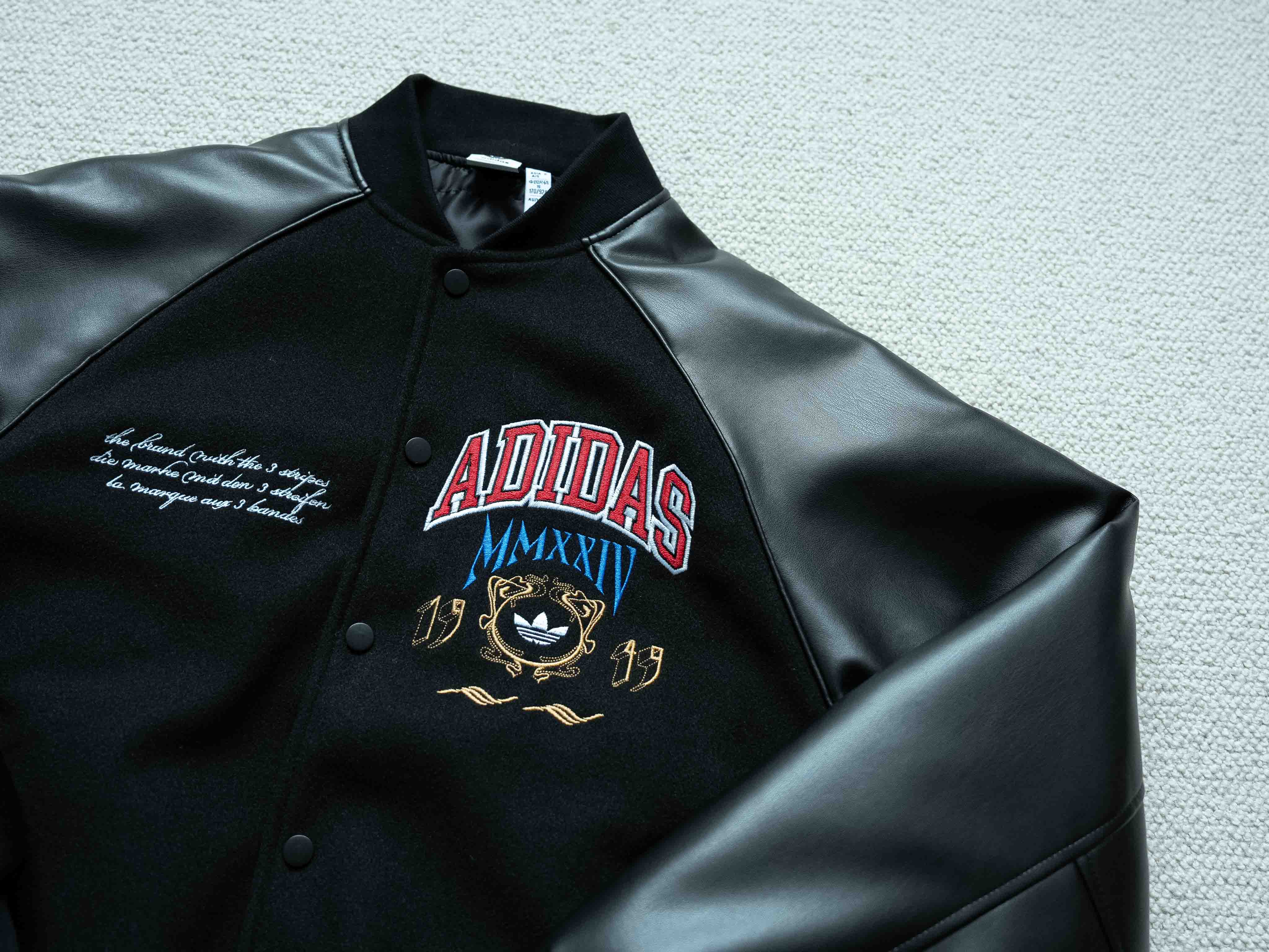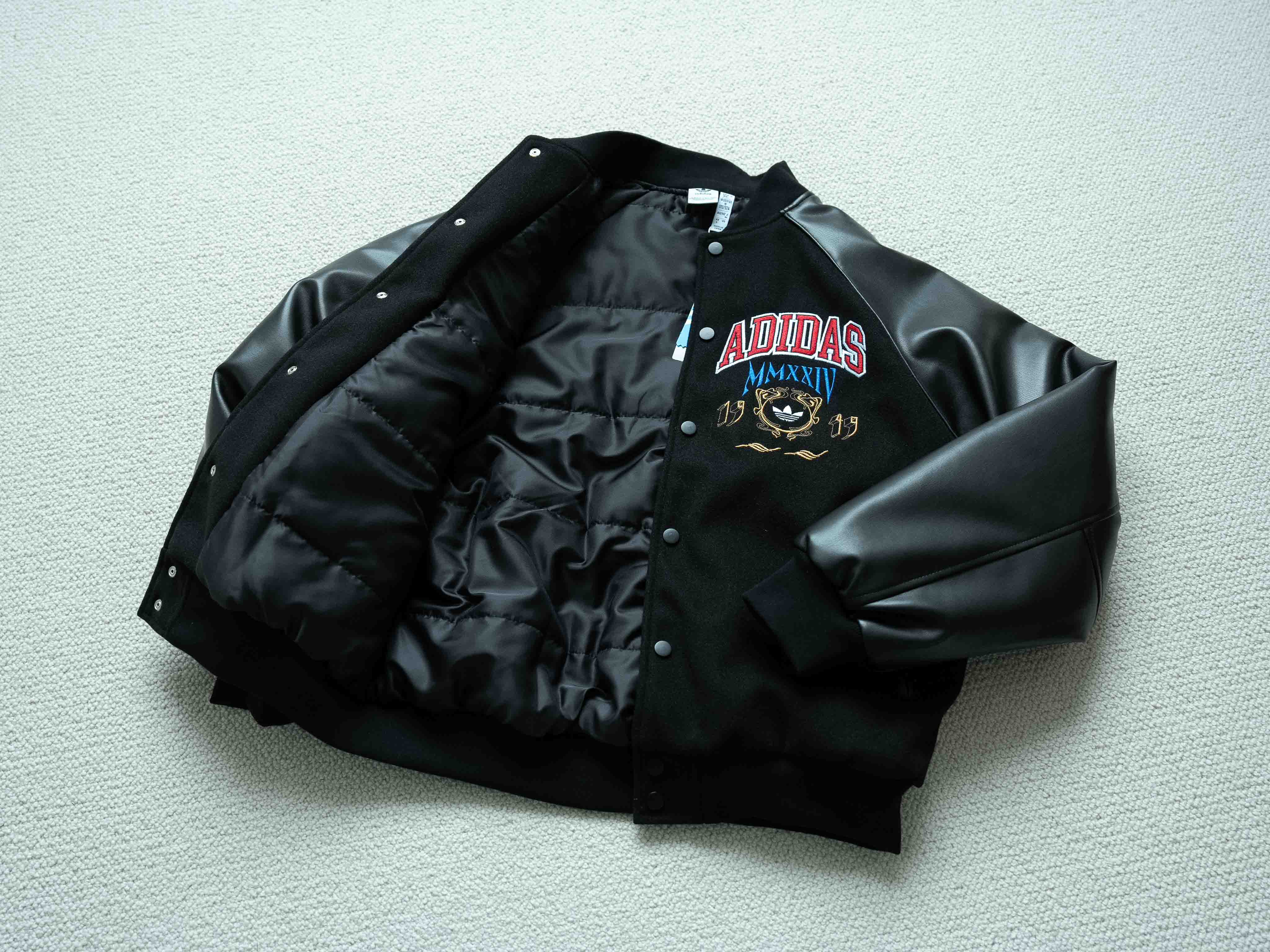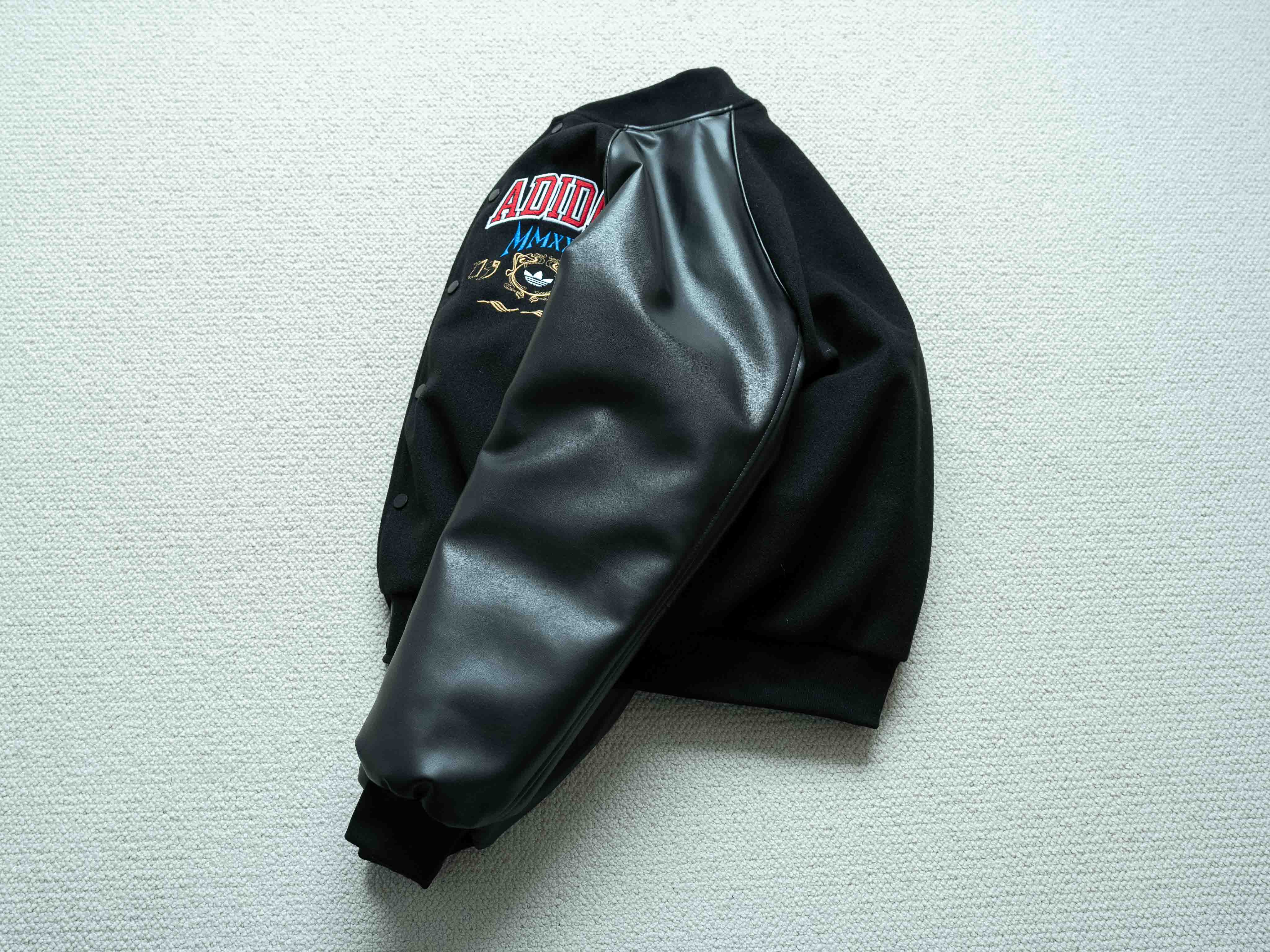 宝藏棒球服推荐 今年官方认证的热门款式 胸口大幅品牌缜密刺绣标识 重工细节饱满 开模刻字三叶草logo拉链头 刺绣细腻没有连针 袖子为进口PU皮 手感软天气凉也不会硬 内里填充P棉 兼具保暖性能 黑色皮革材质搭配红蓝黄刺绣 内里薄棉 这个季节穿完全不会冷 全套洗唛辅料配齐 十星强推