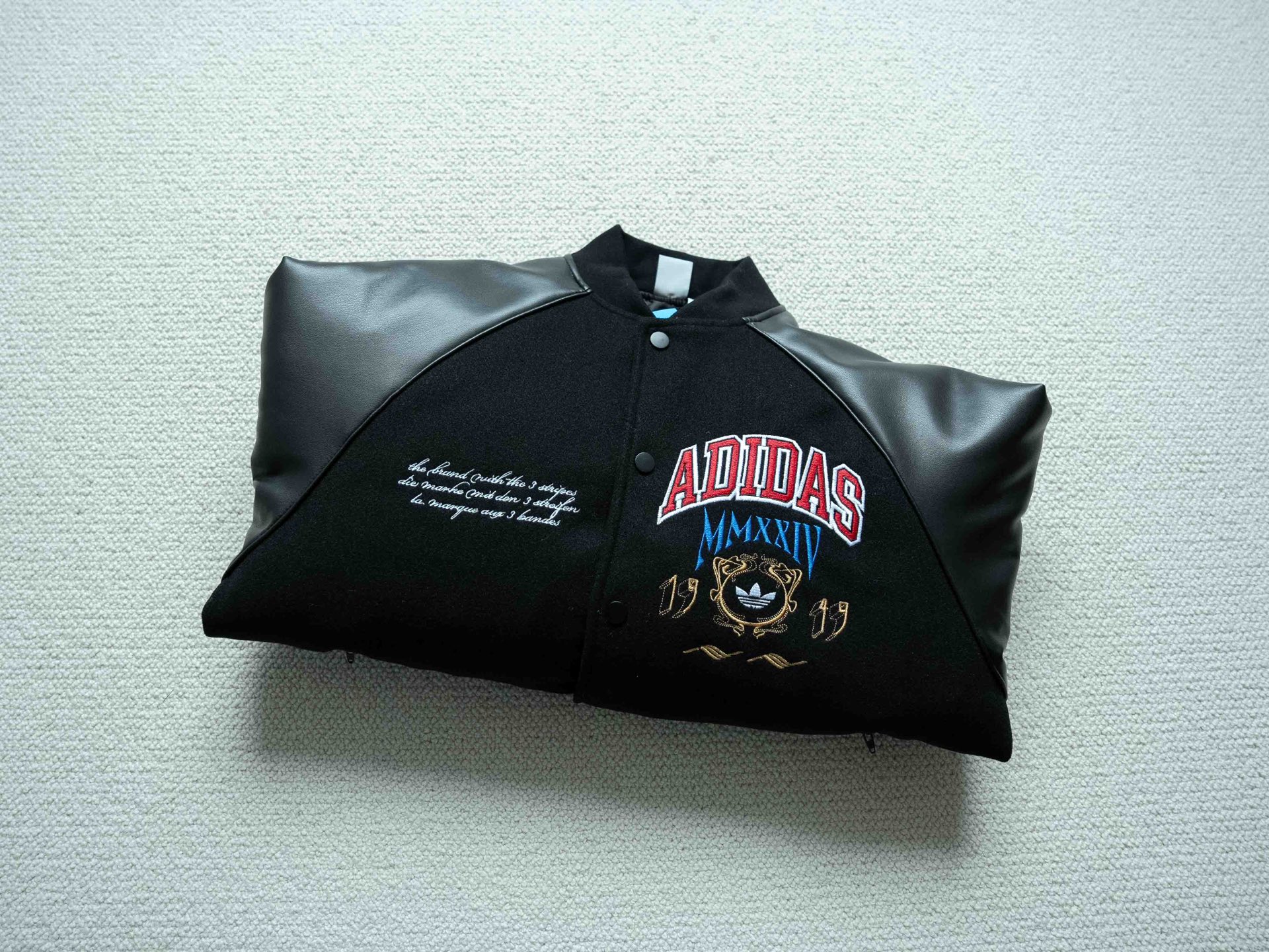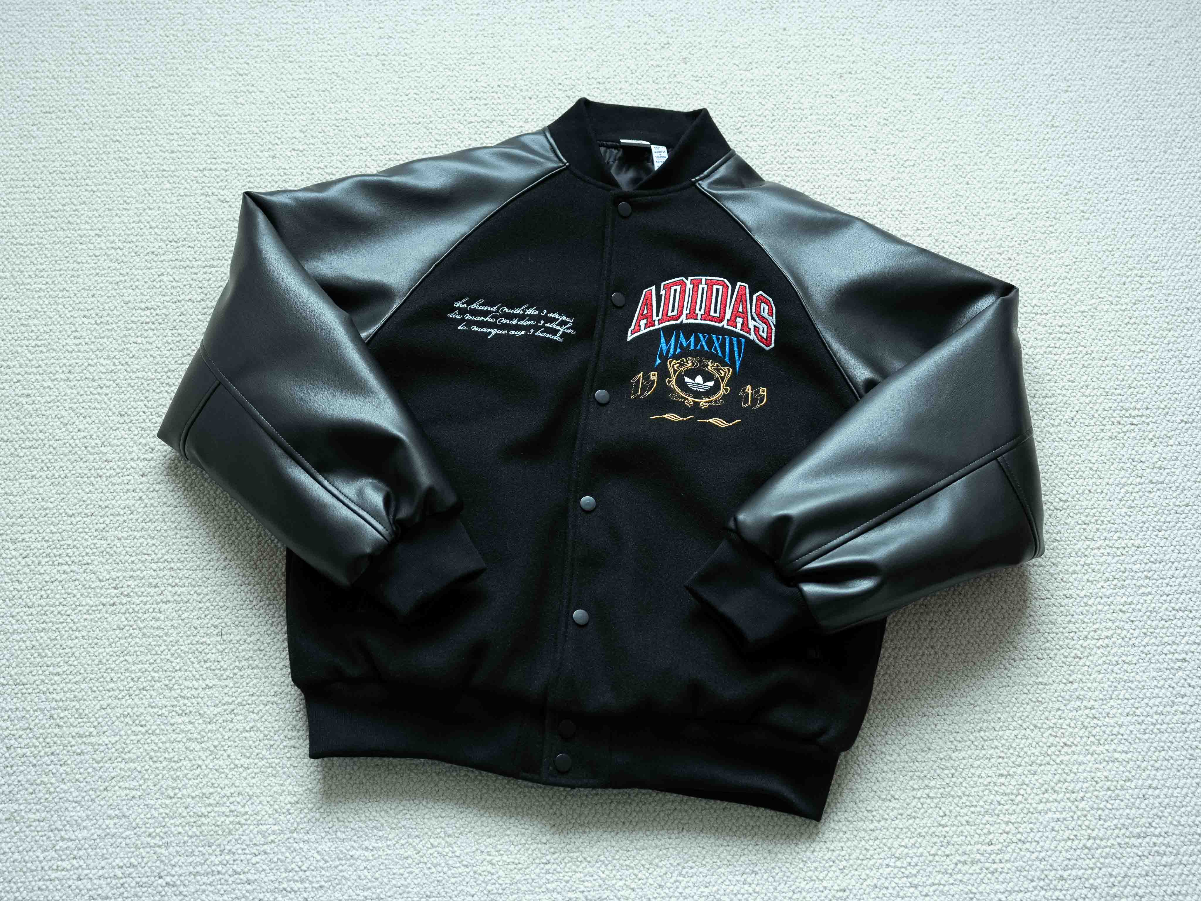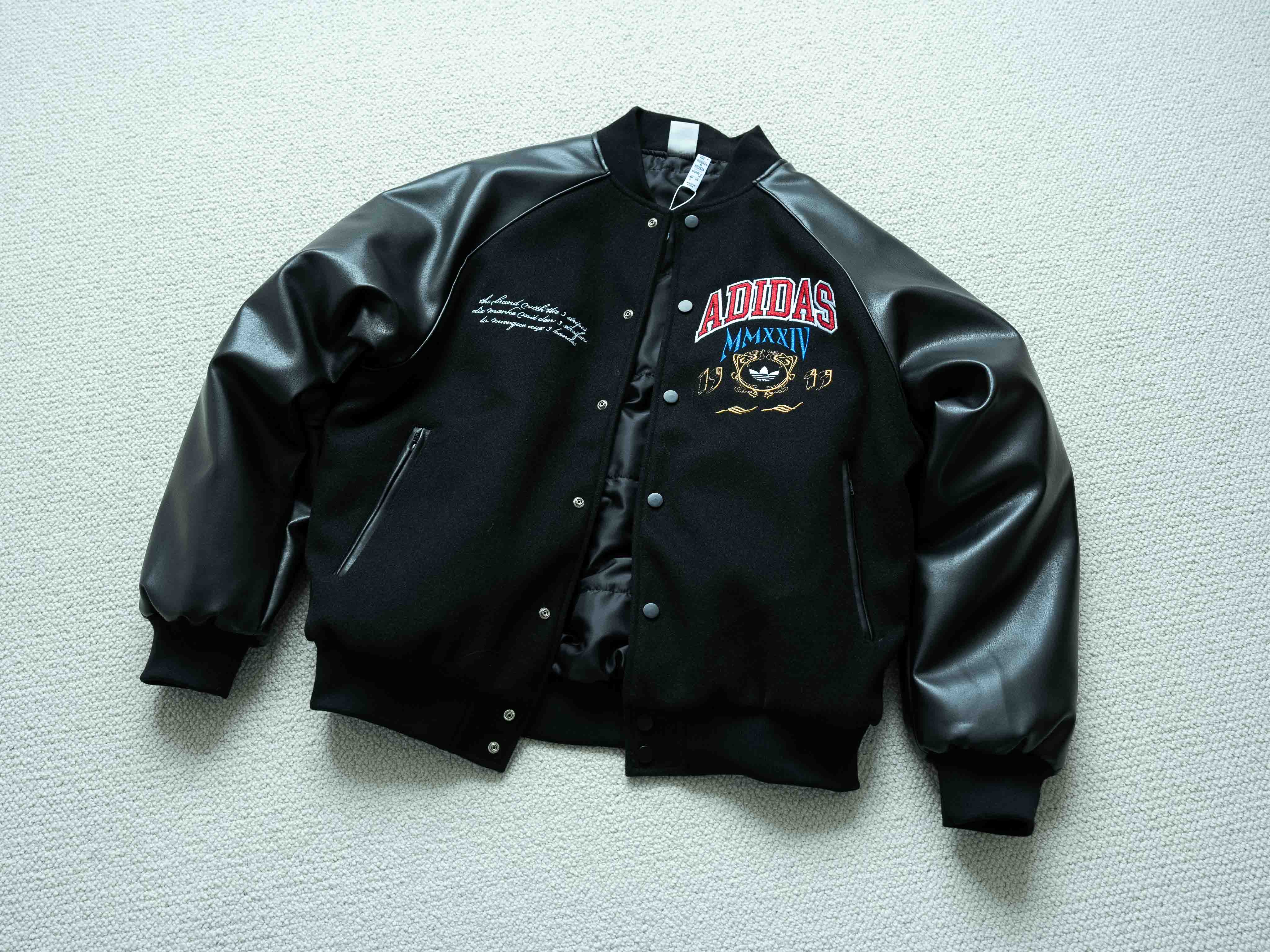 宝藏棒球服推荐 今年官方认证的热门款式 胸口大幅品牌缜密刺绣标识 重工细节饱满 开模刻字三叶草logo拉链头 刺绣细腻没有连针 袖子为进口PU皮 手感软天气凉也不会硬 内里填充P棉 兼具保暖性能 黑色皮革材质搭配红蓝黄刺绣 内里薄棉 这个季节穿完全不会冷 全套洗唛辅料配齐 十星强推
