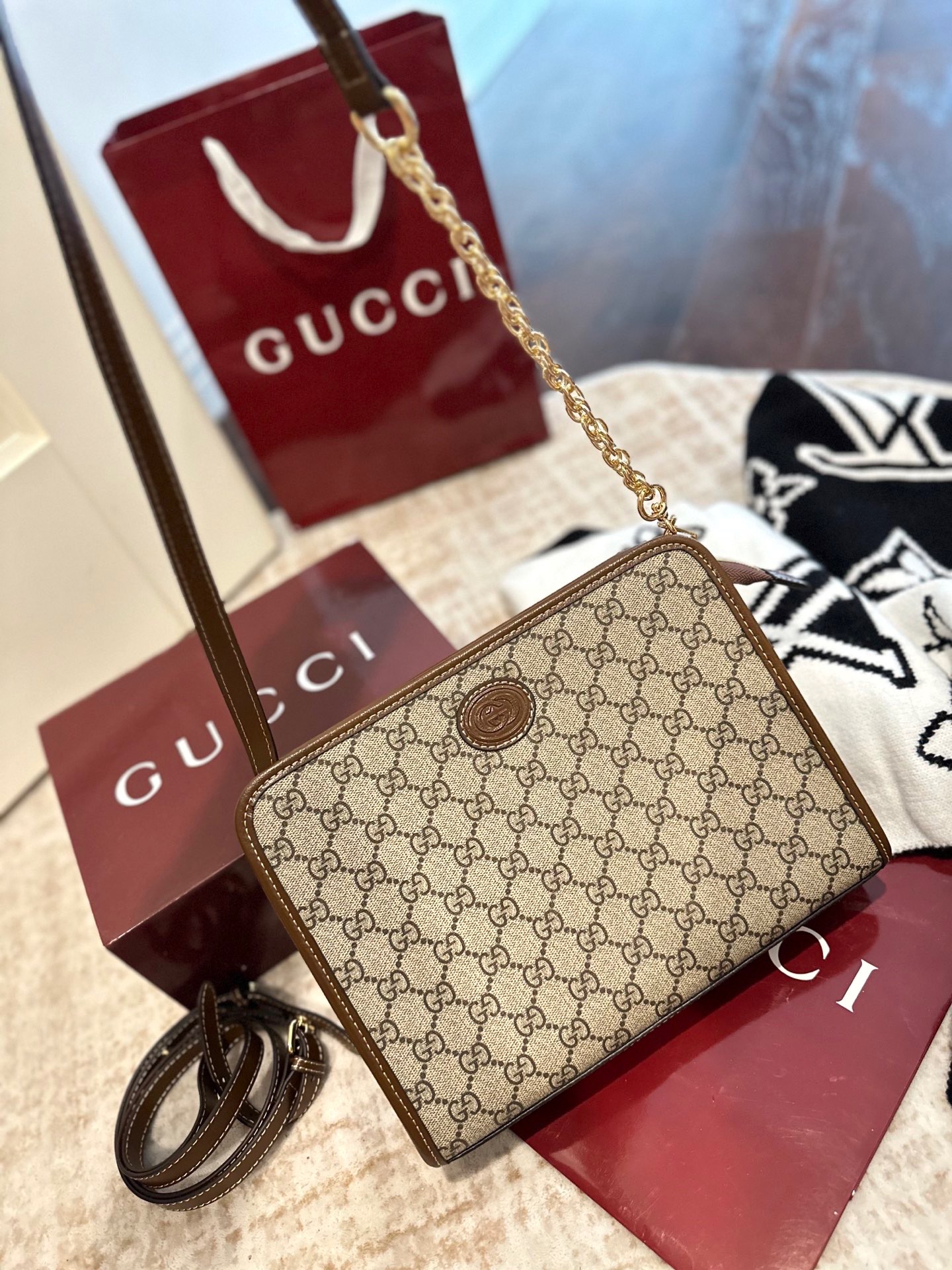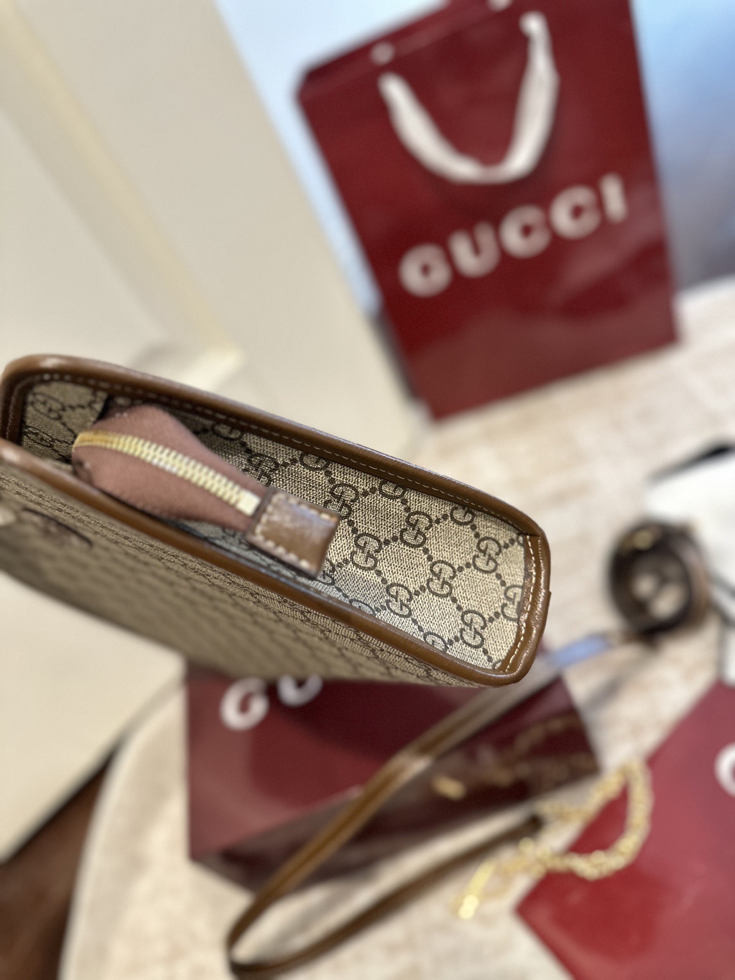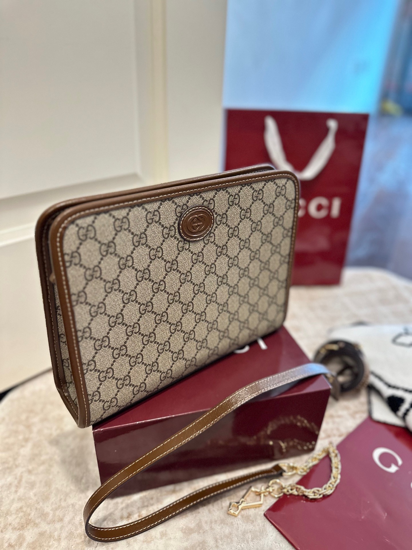 芯片版 官网双盒包装 搭配两条肩带 古驰老花手拿包 洗漱包 真的绝绝子了 盥洗包是老花包里面时尚寿命最长的一款包包 从戴安娜王妃就开始用它了 到现在呢 依旧非常的 这款包的容量蛮大的 宝宝们基本上要用的东西都可以装进去 而平时就可以把它当做手包来用 尺寸 27 7 20 5cm
