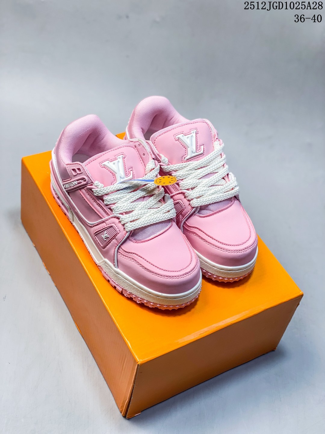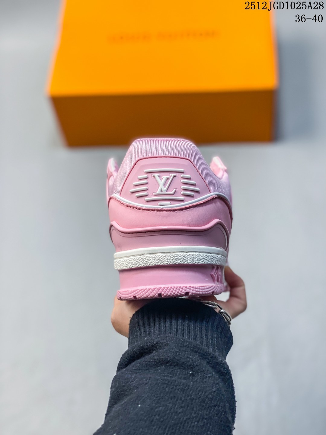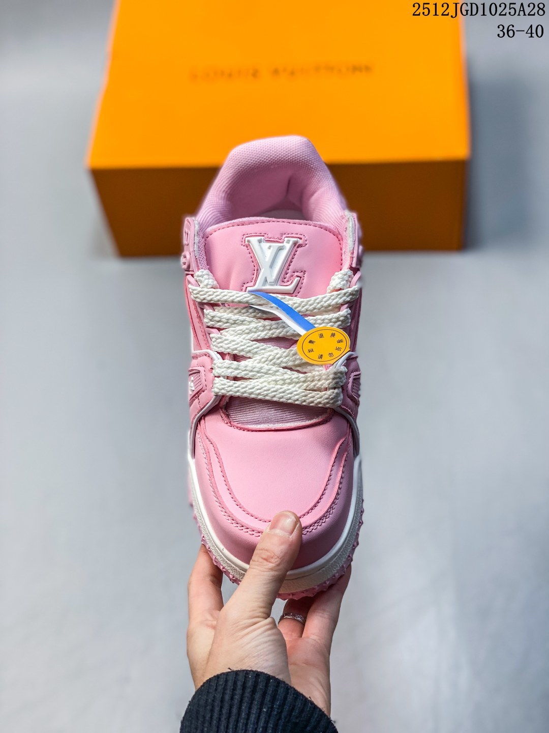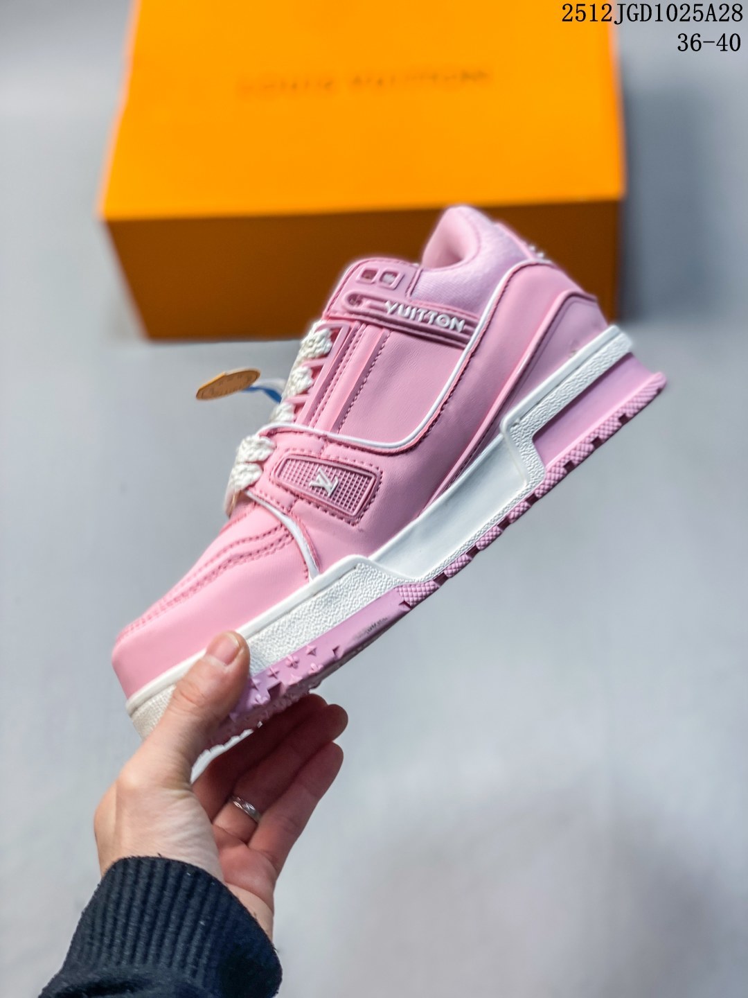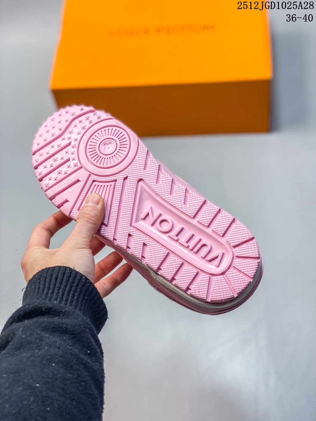 全新 Sneaker Lo 公司级路易威登板鞋 胖丁 经典款 官方一比一版本 新款 LV Tyler x LOUIS VUITTON Trainer 帆布拼接皮面 圆头系带 低帮 板鞋 圆头系带低帮生活休闲鞋男女款 LV Trainer最新配色 L家 篮球鞋风格运动鞋 该鞋由艺术总监 VIRGIL ABLOH设计 垫脚聚米微料加透气英伦风 细节原版一致 Size 36 45
