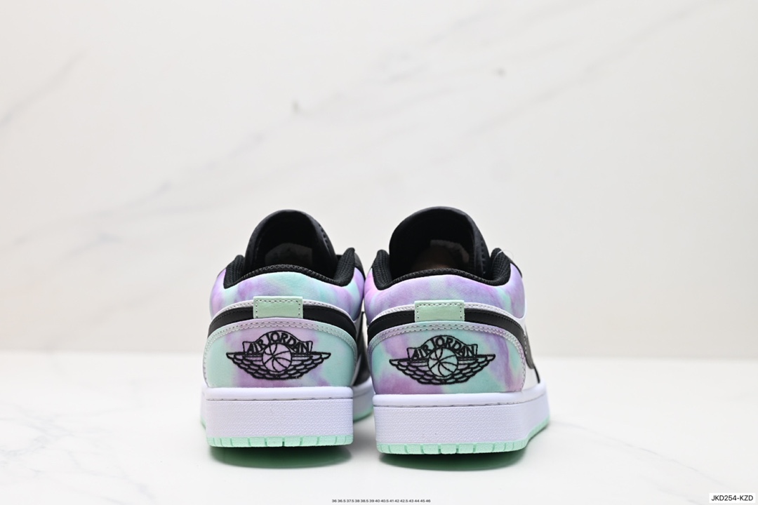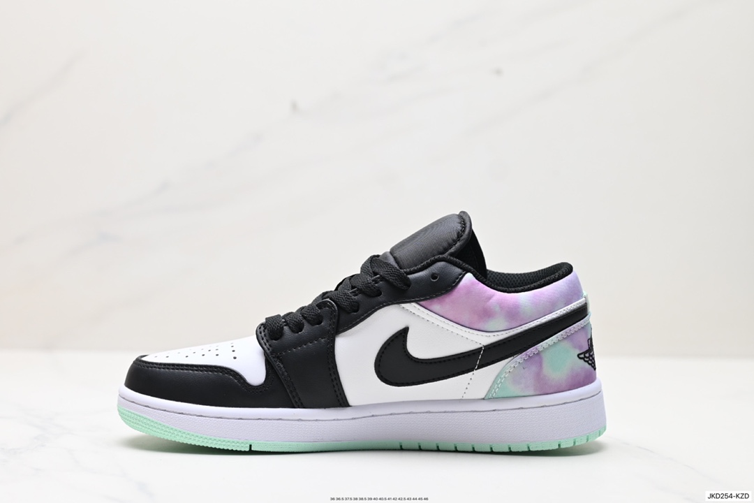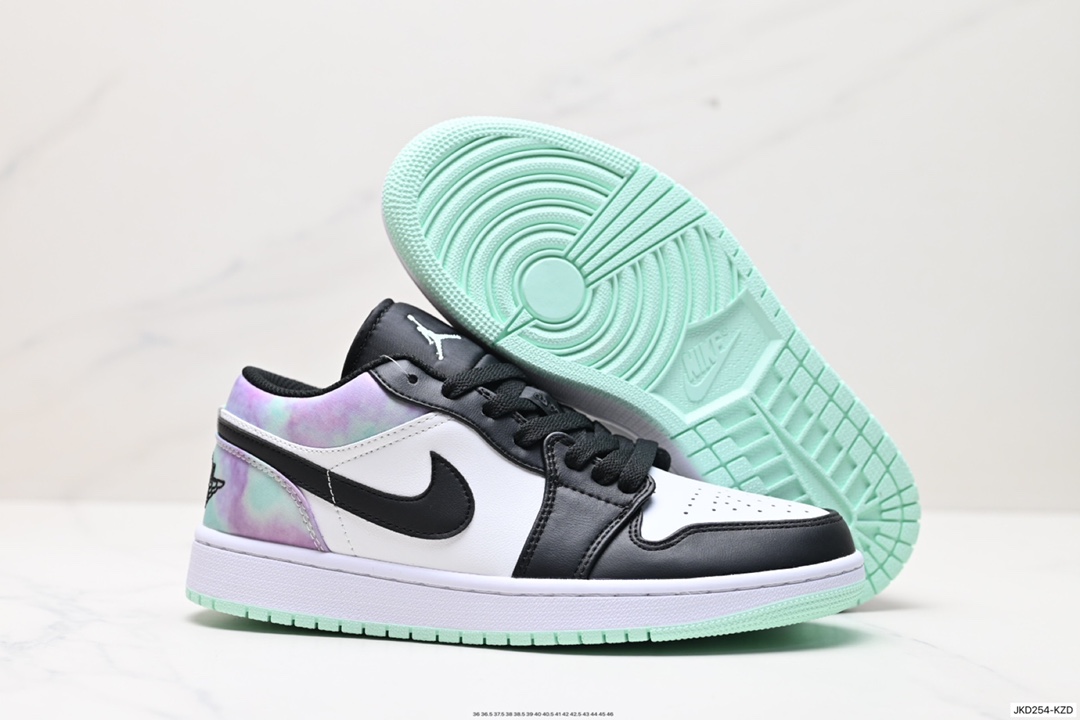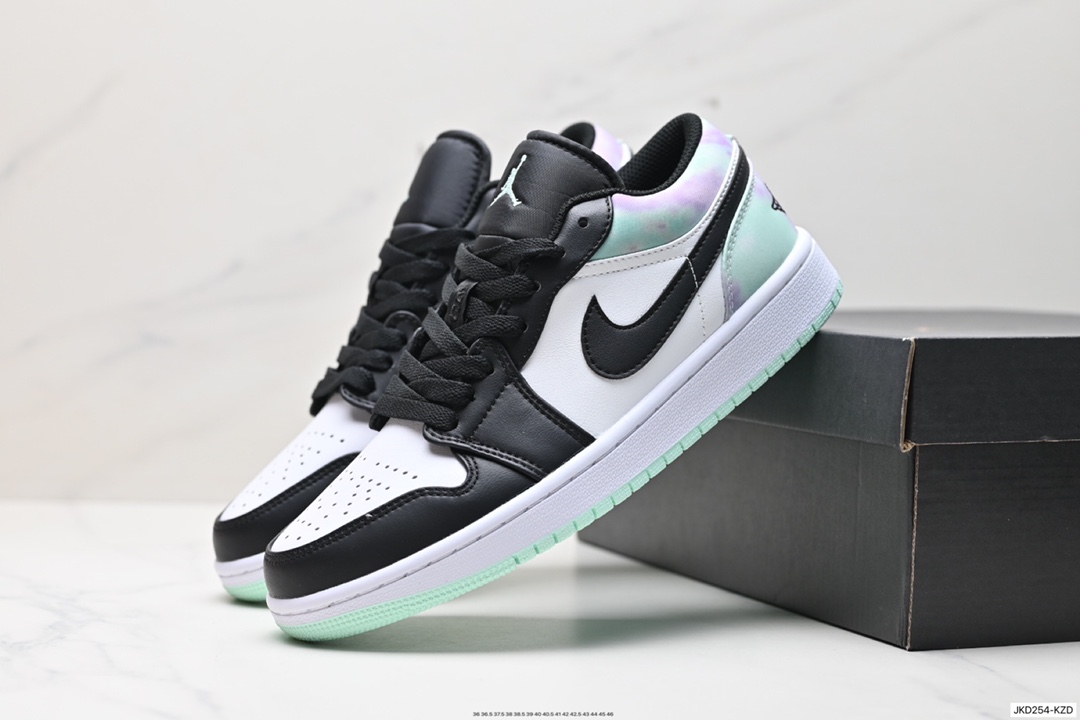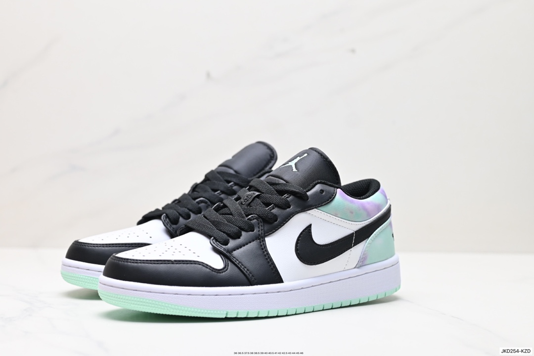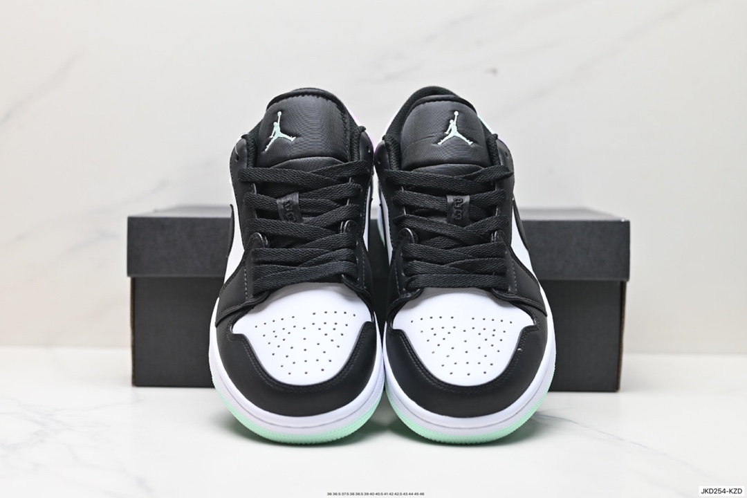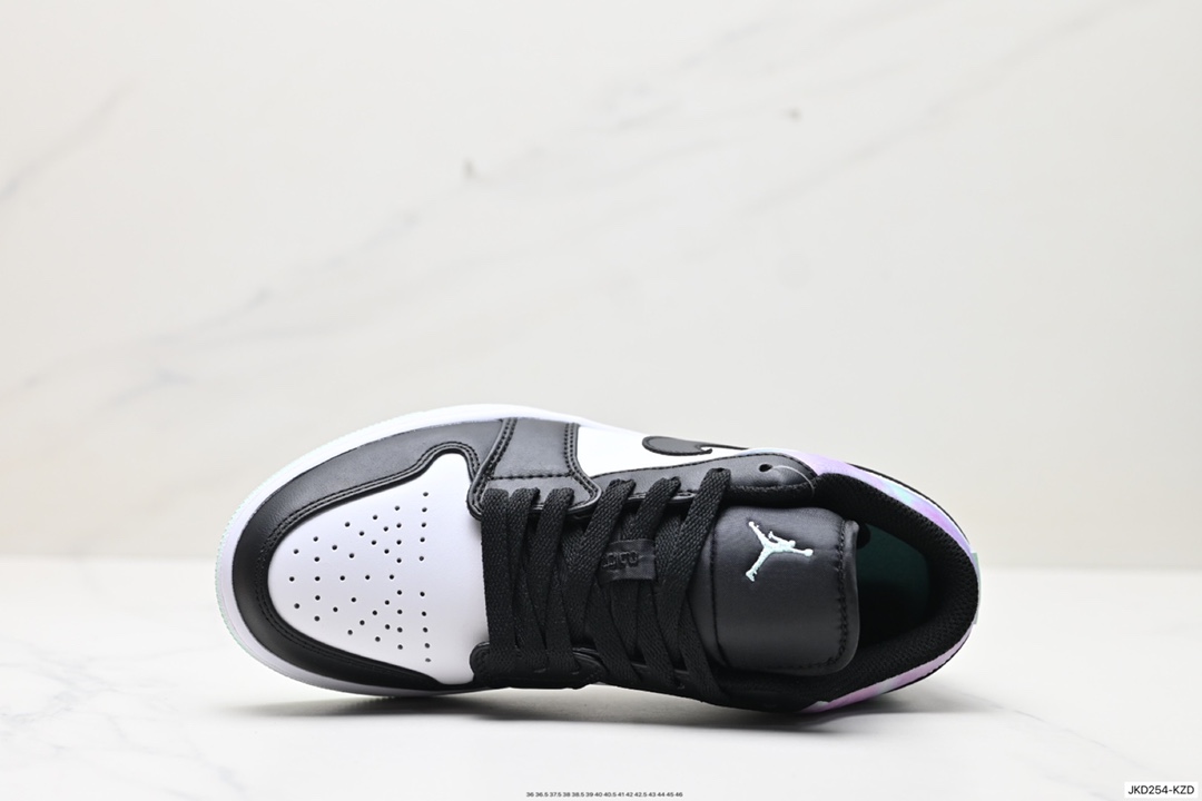 Air Jordan 1 Low 低帮 黑白绿 AJ1 乔丹1代 aj1 乔1 低邦 黑白绿渐变 乔丹篮球鞋系列 采用黑脚趾设计风格 鞋头黑色和中部白色部分采用冲孔皮革设计 带来与众不同的质感 首先最大的变化就是后跟由紫色 绿色渐变合成 外底绿色 风格偏酷 简单百搭