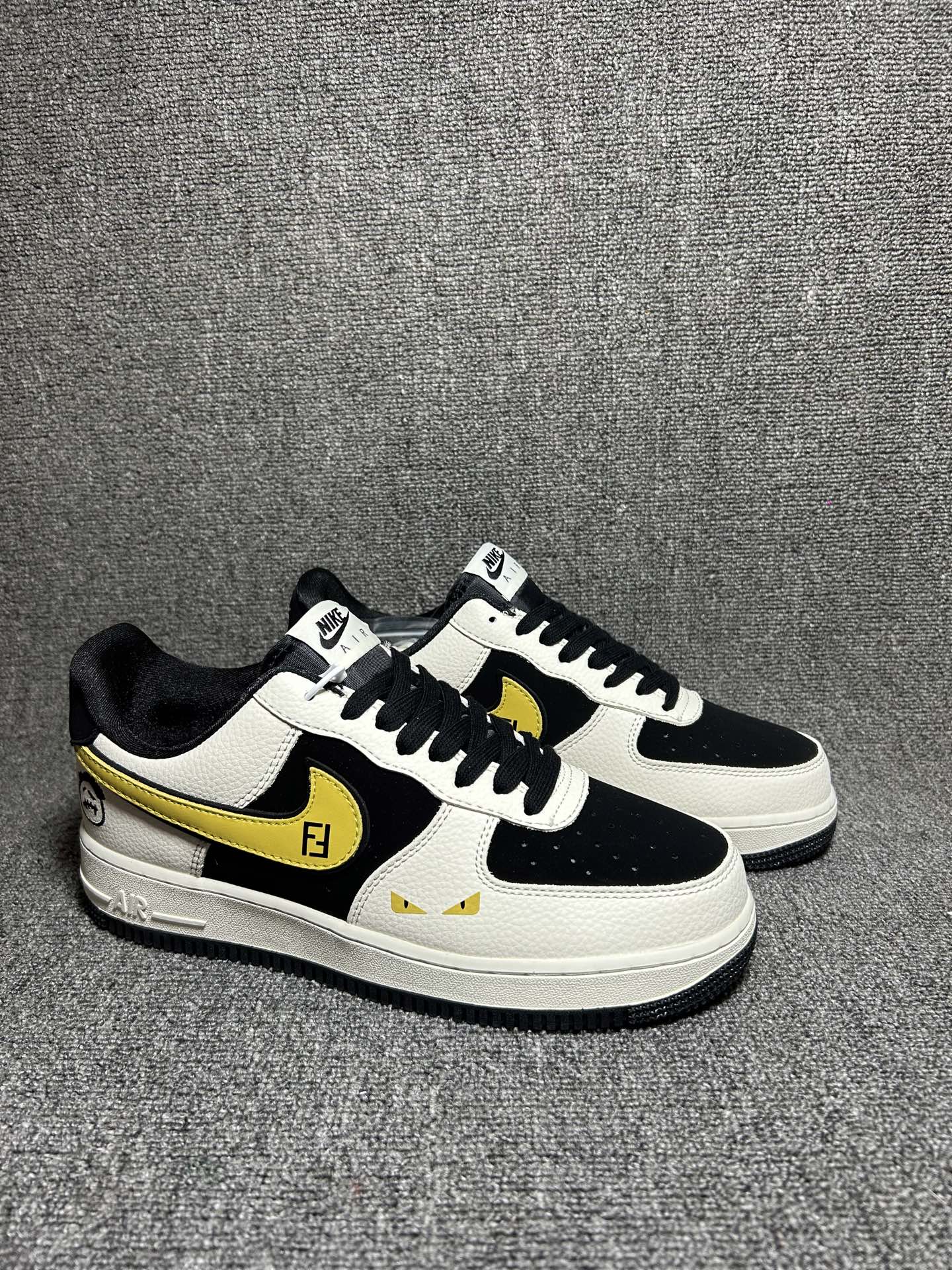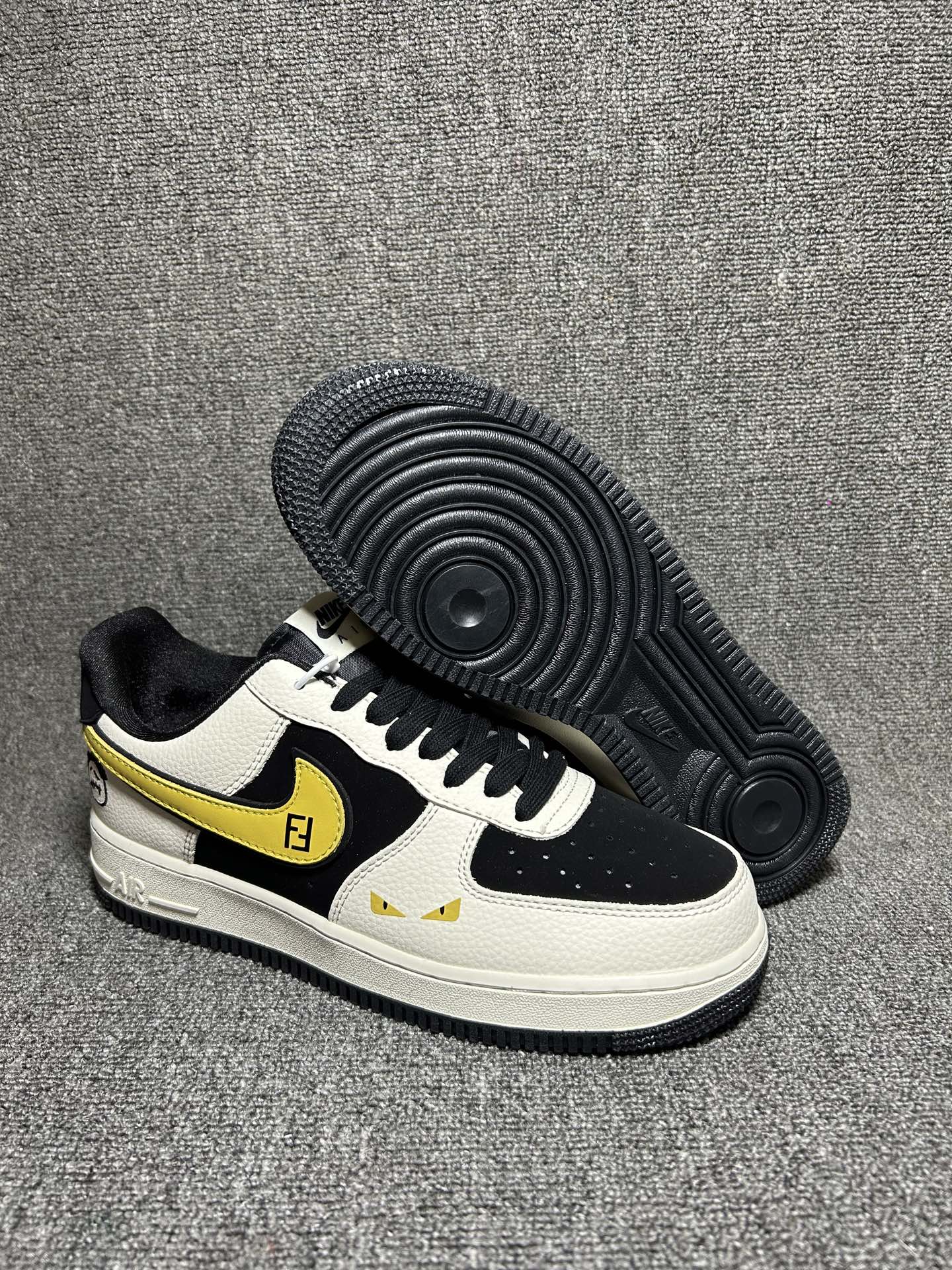 米白 黑 金三色撞色 主色调为米白色 辅以黑色框架和金色 Swoosh 点缀 鞋身带有卡通笑脸涂鸦 专属标识及芬迪装饰元素