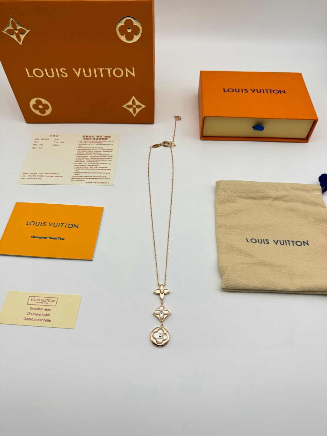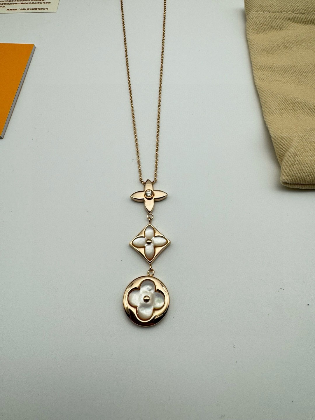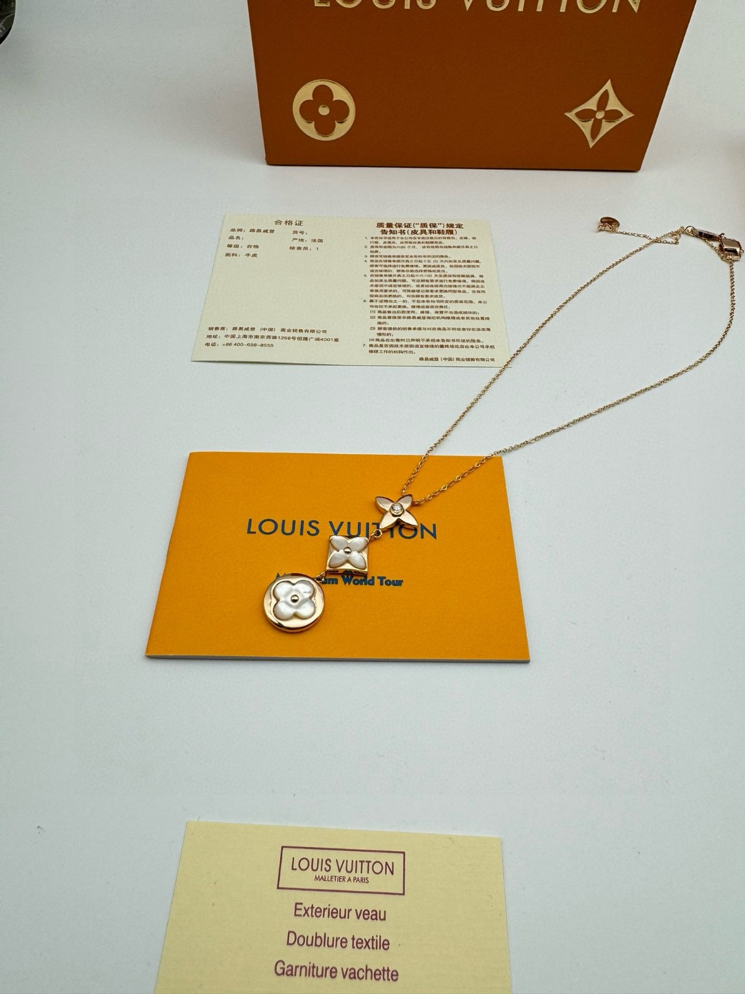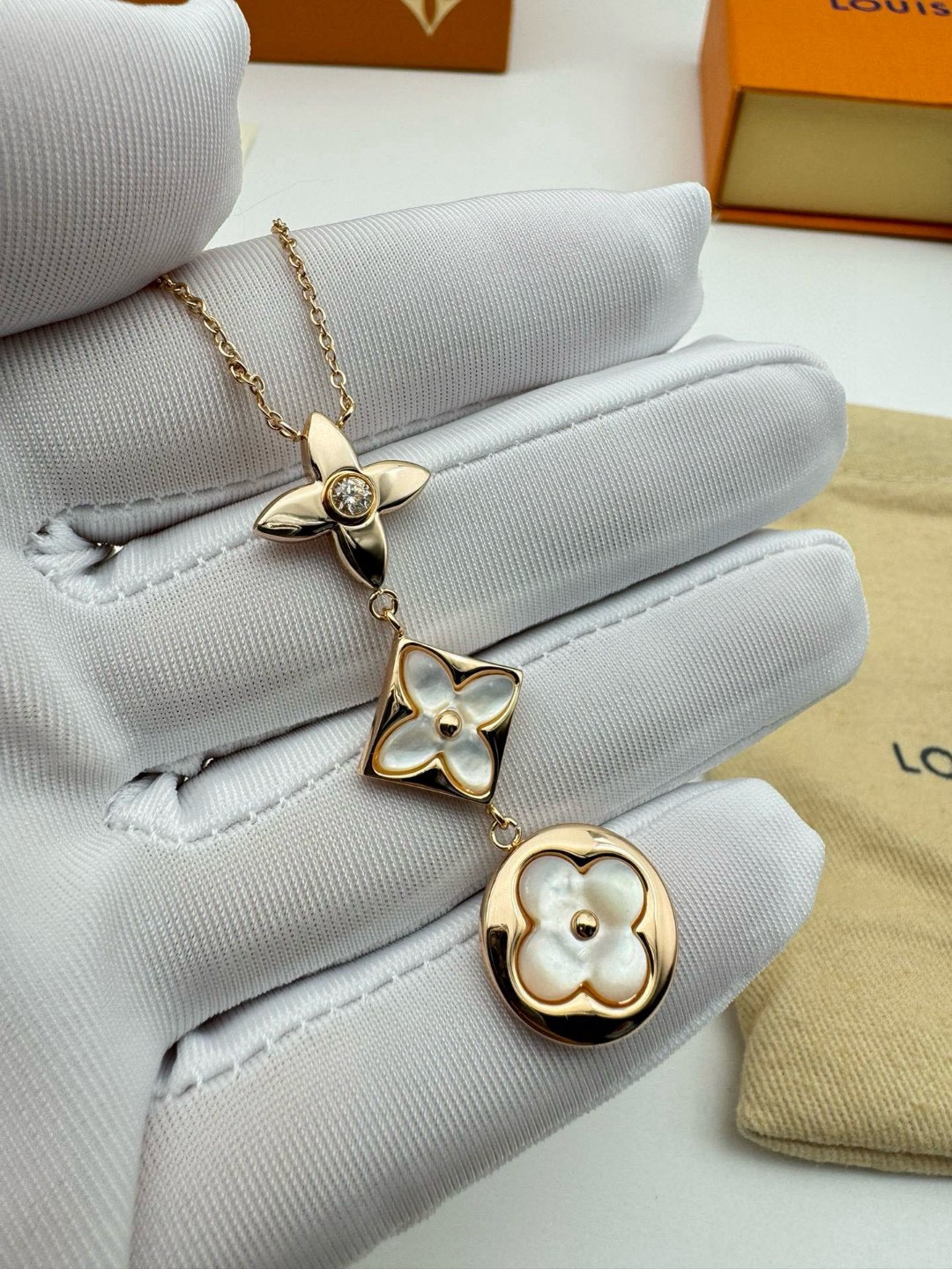 LV路易威登圆形菱形贝母项链 代购级别官网同步最高级别1 1 采用天然高档白贝母镶嵌精选德国进口钛钢材质电镀厚金 原版扣 尾牌 字印 这是由独特的花瓣朵结合成的手链 白贝母柔和的色调看着很是舒服 在自然光下更美 上手 效果特别好看 显白 仙气十足 颜色 玫瑰金 链长 48CM可调节