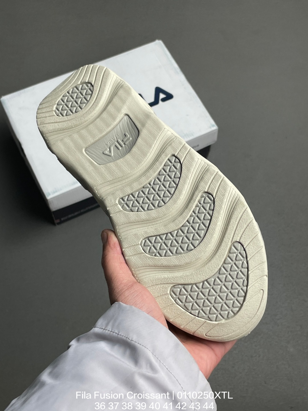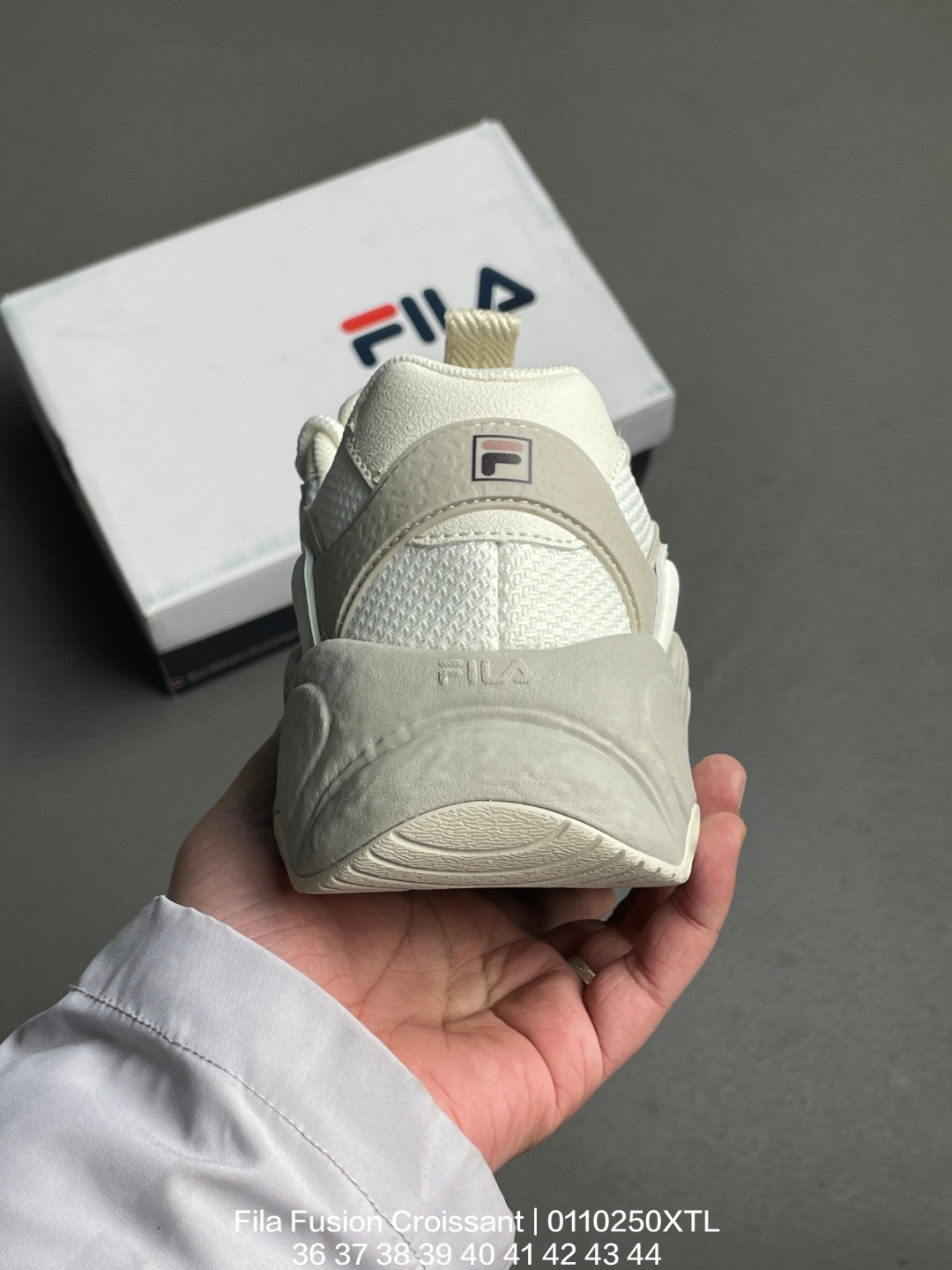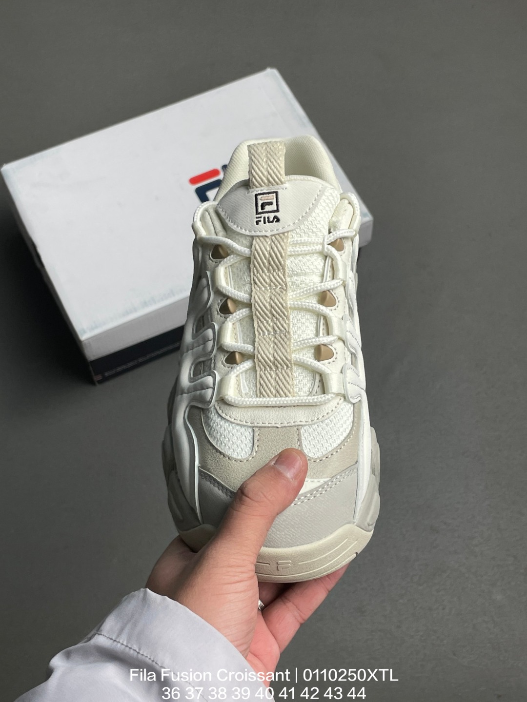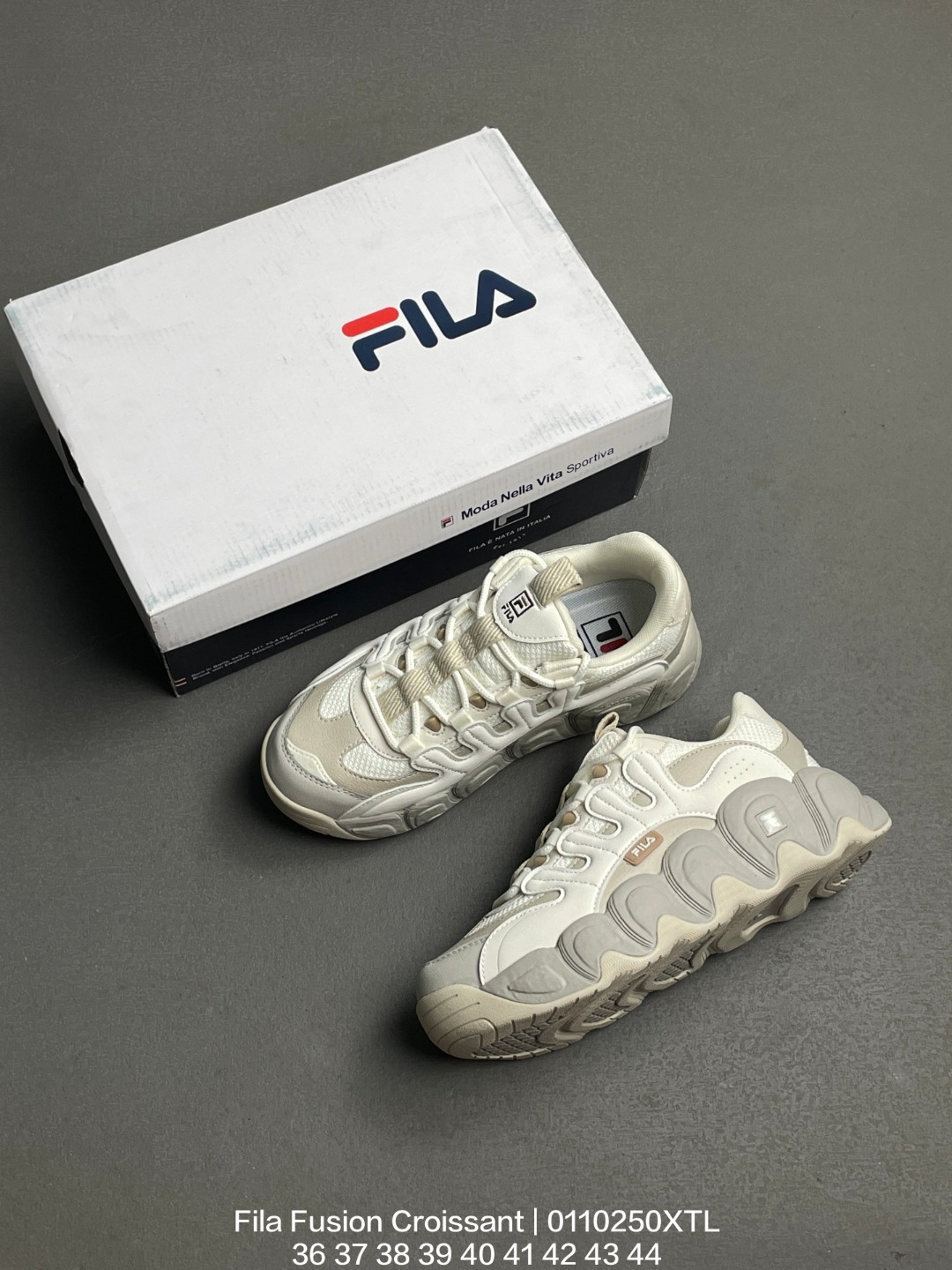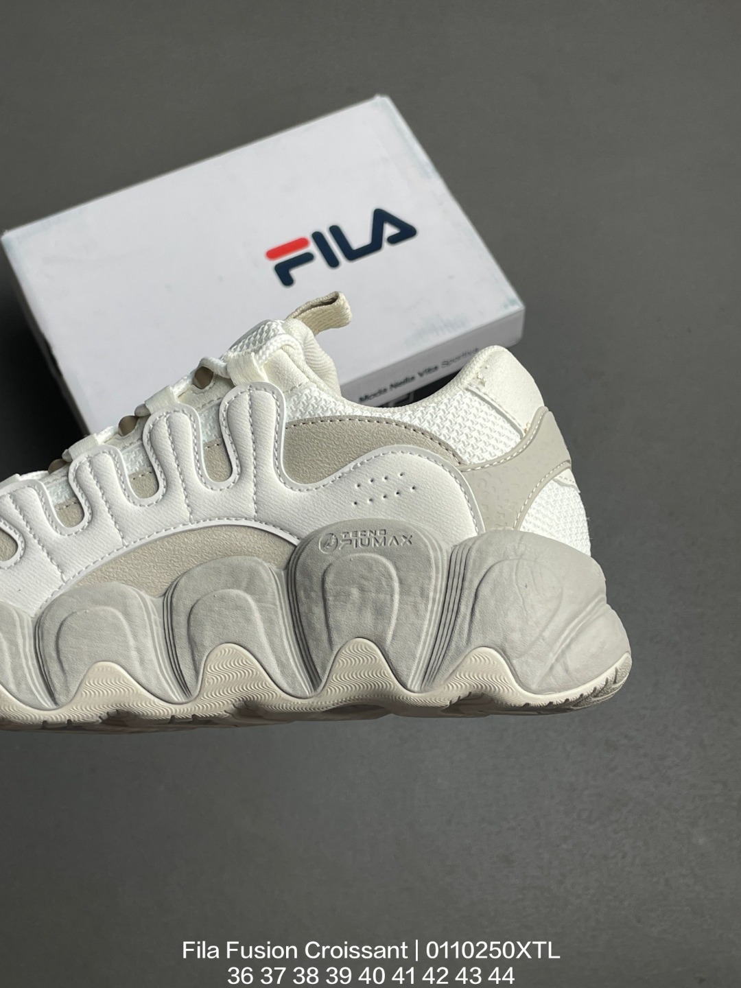 FILA 斐乐 采用环保牛剖革组合网织布鞋面材质 独立外发泡EVA科技中底 耐磨橡胶外底 4 5cm厘米外增高效果糖果配色有点甜意式运动美学 斐乐Fila Fusion Croissant 可颂面包系列老爹风增高厚底复古中性休闲运动慢跑鞋