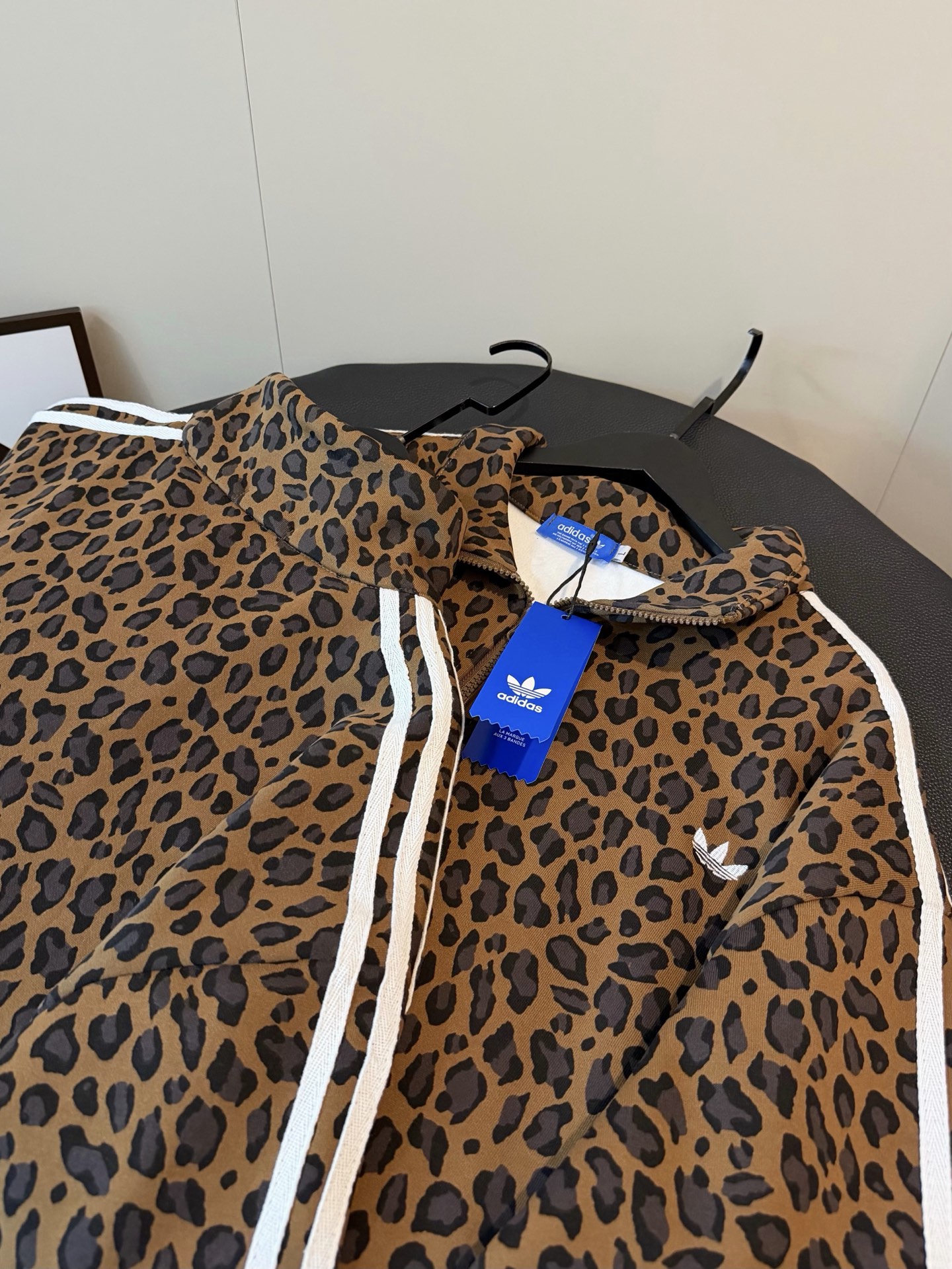 Adidas三叶草新款豹纹刺绣三杠织带加绒外套