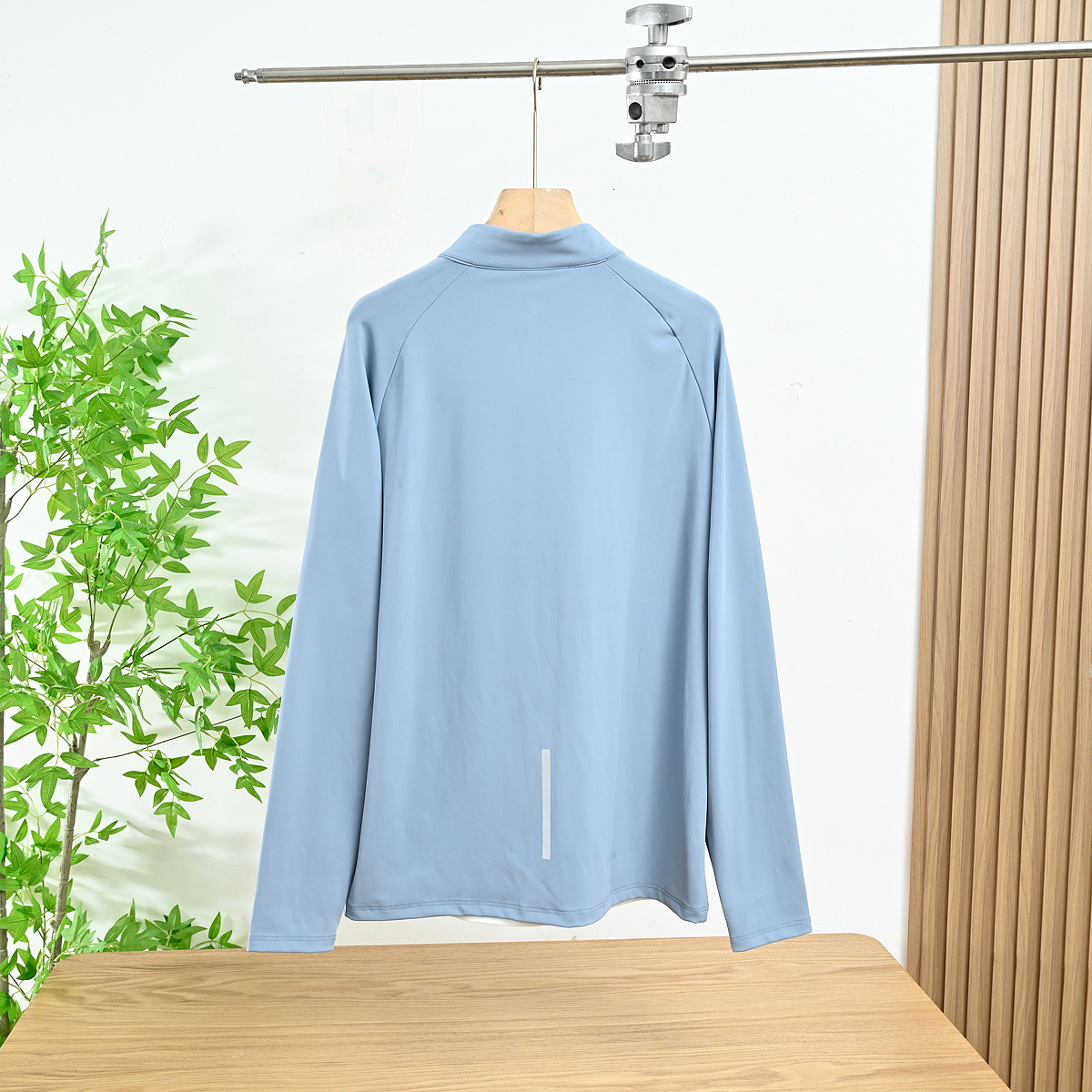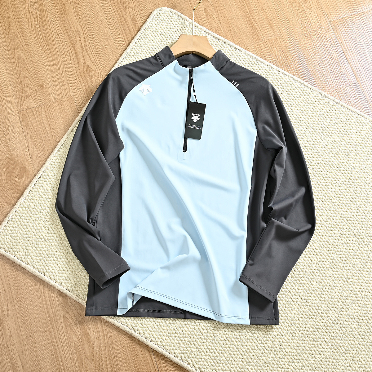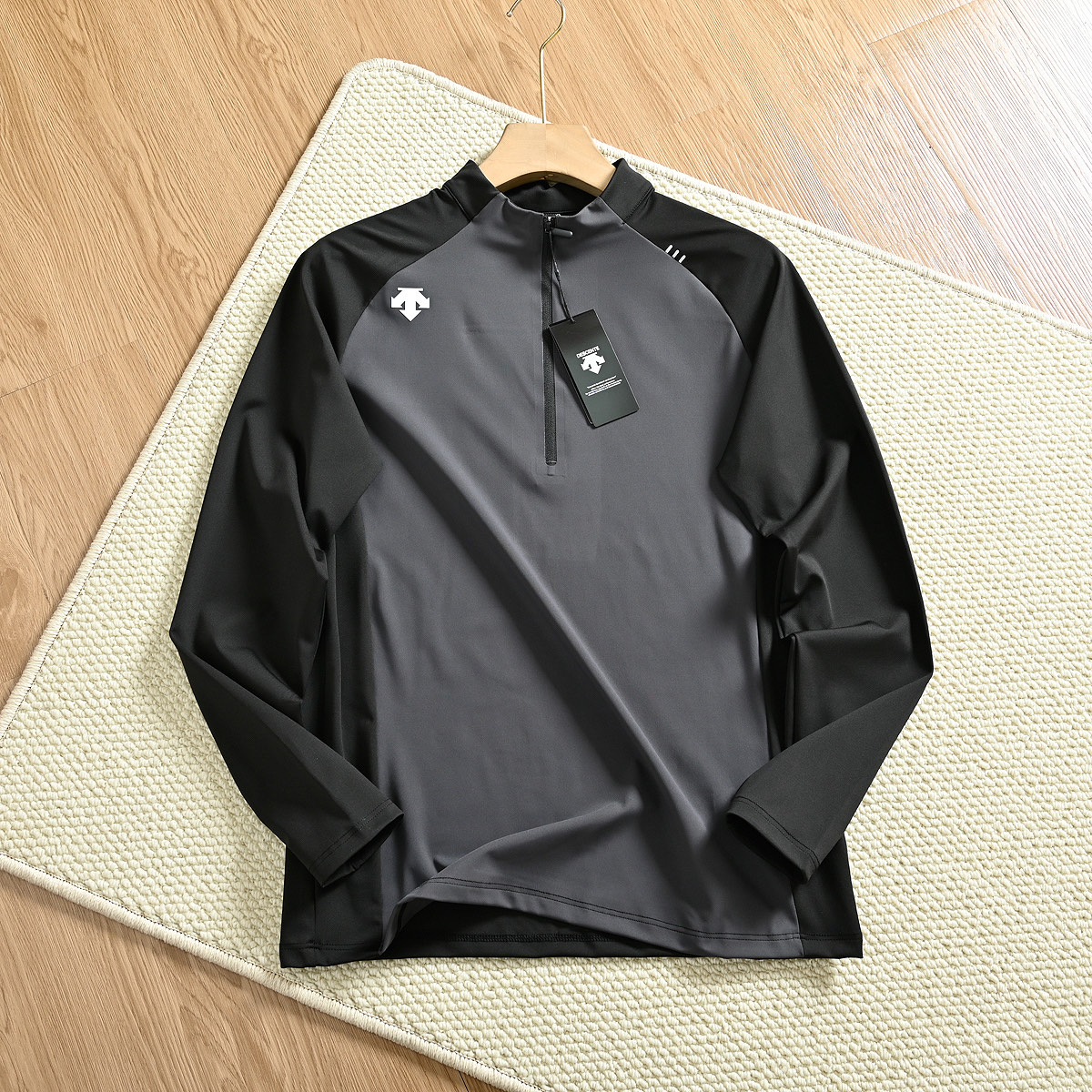半拉链T恤在春季时 采用了优质酷跑丝220克 专业户外功能性的面料 加上撞色 背后采用反光条 面料手感光滑柔软 高弹力舒适运动无束缚 透气性贼啦好 具有良好的吸湿排汗性能 上身干爽舒适 肩膀上迪家烫印LOGO 中间是热封无痕拉链设计细节感满满 落肩款式 暗线做压缝 档次十足
