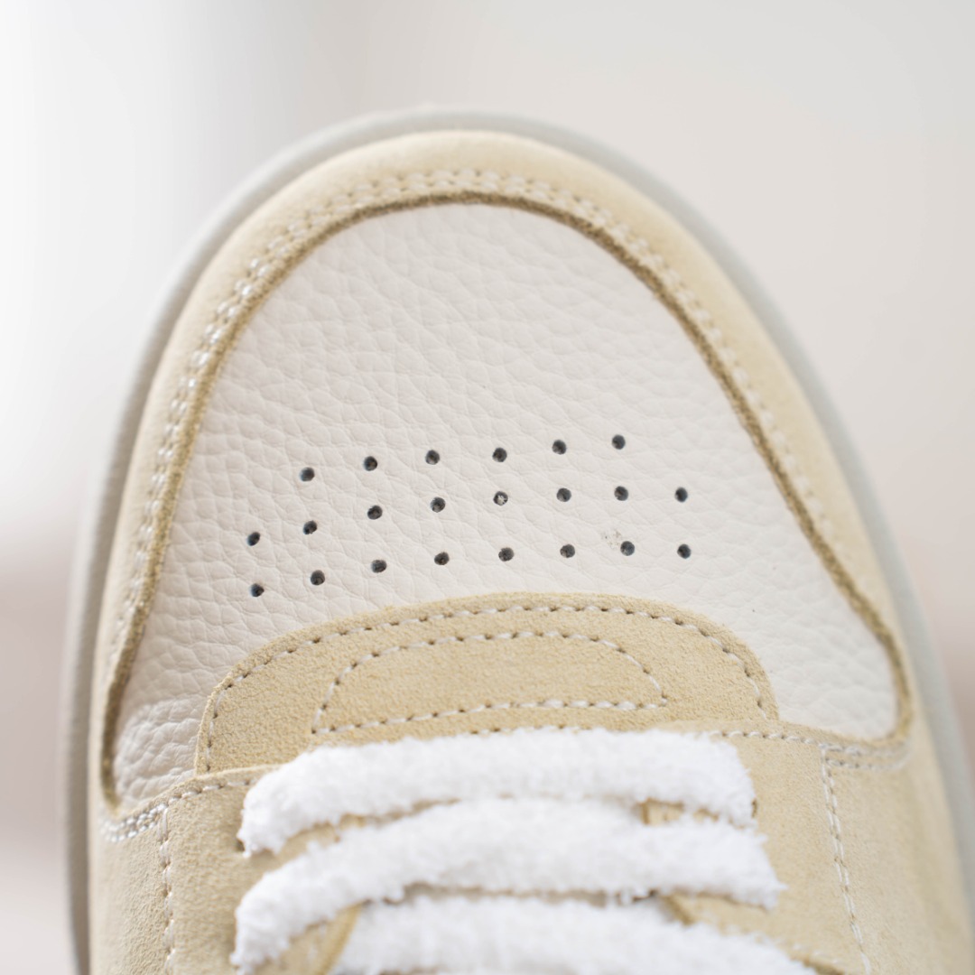鞋面采用麂皮和胶片拼接组合