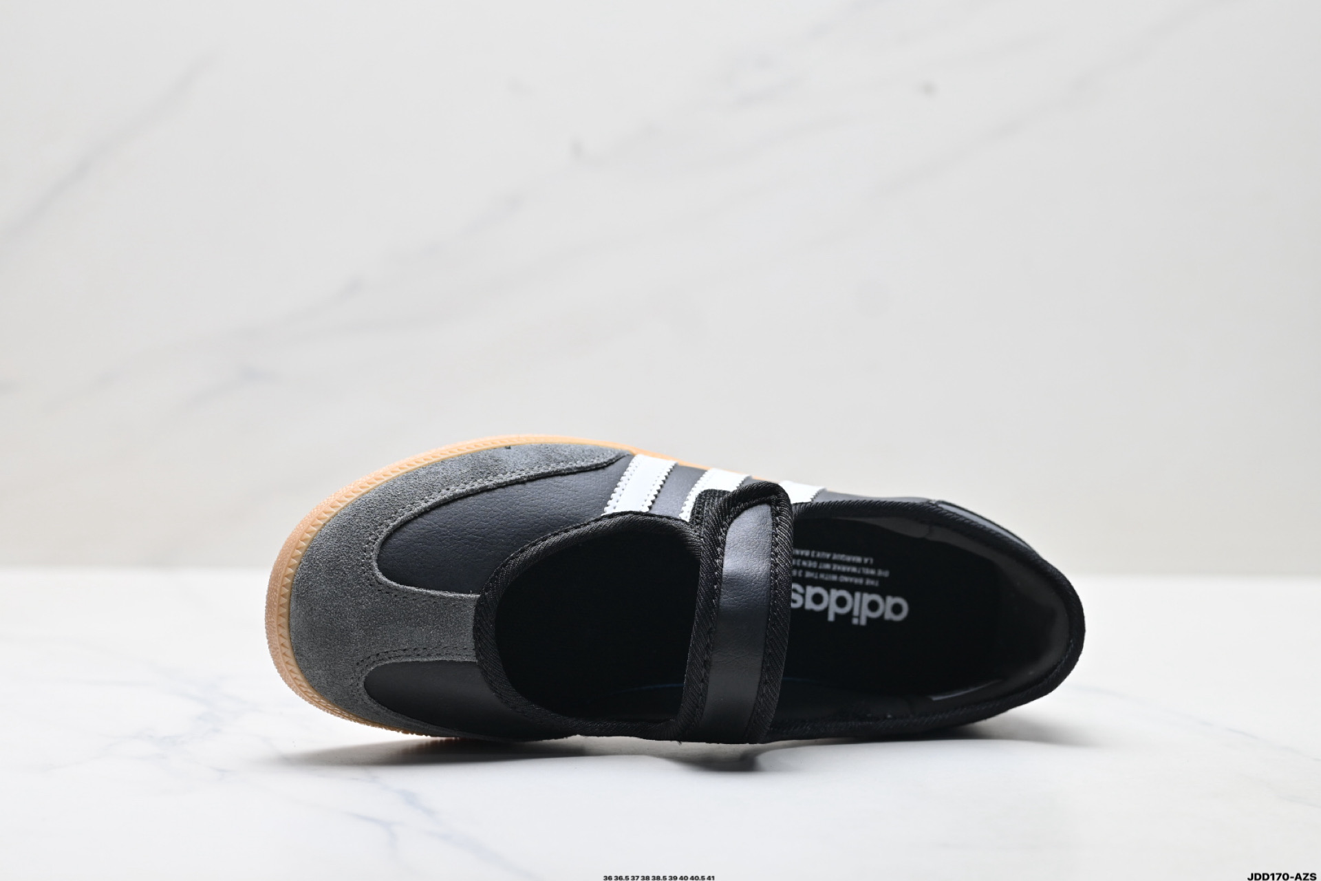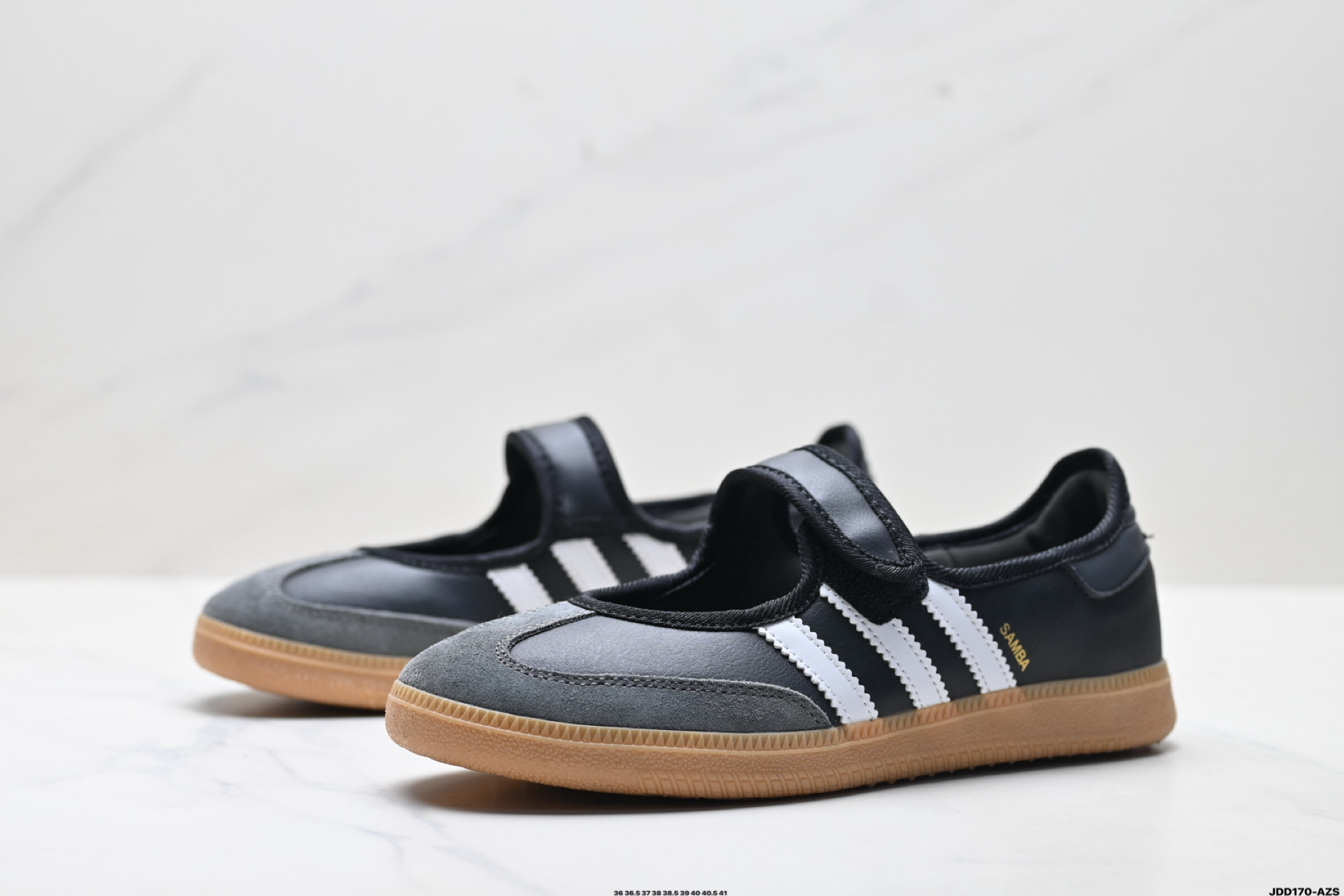 它采用了玛丽珍鞋的特色设计 如鞋面上的扣带和环扣装饰 同时保留了Samba鞋的经典三道杠设计和橡胶大底 这款鞋的鞋型修长 中足偏窄 整体贴合感强 适合标准脚型和宽脚型的人群
