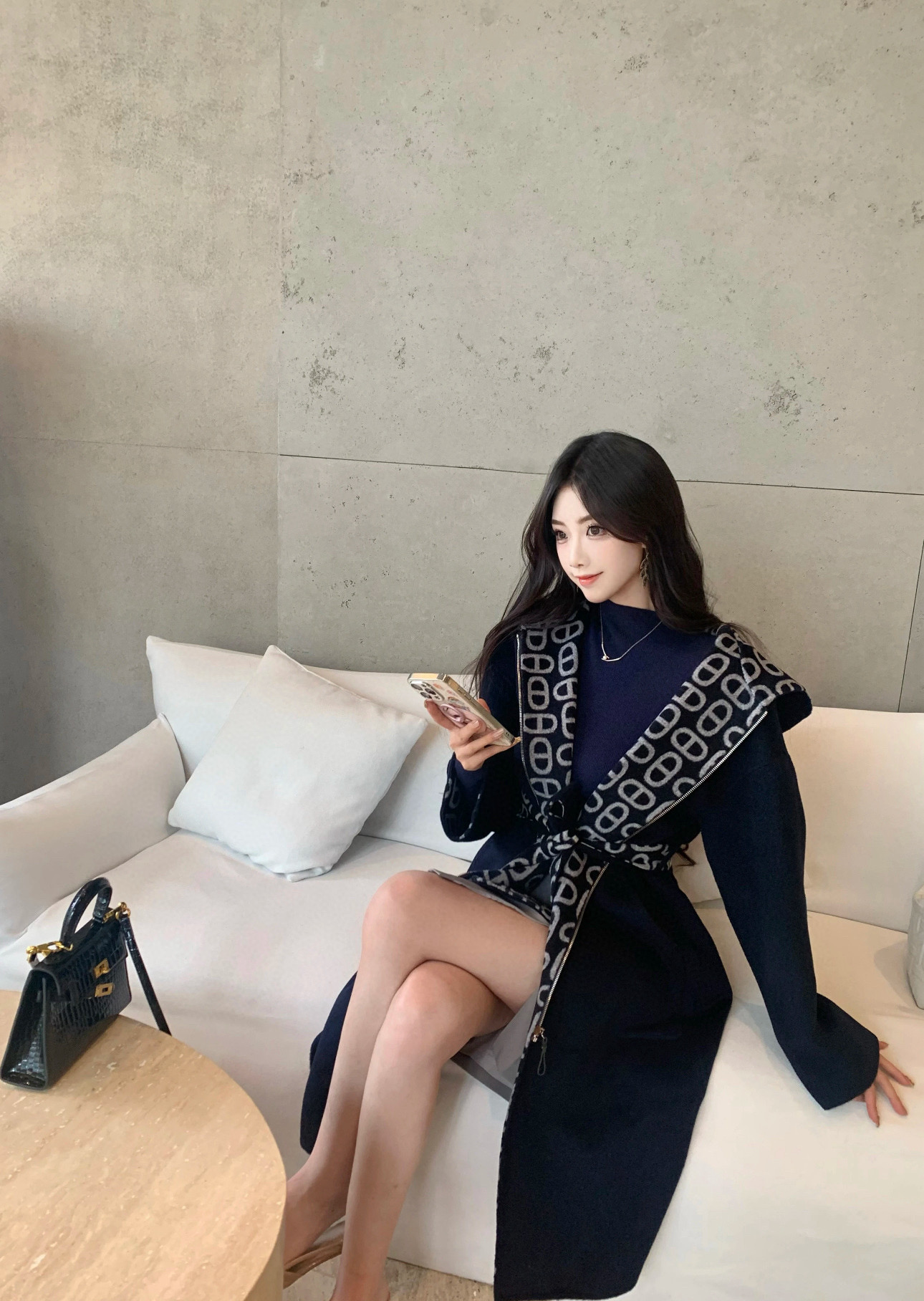 Hermes爱马仕定制拉链猪鼻子双面连帽大衣配腰带