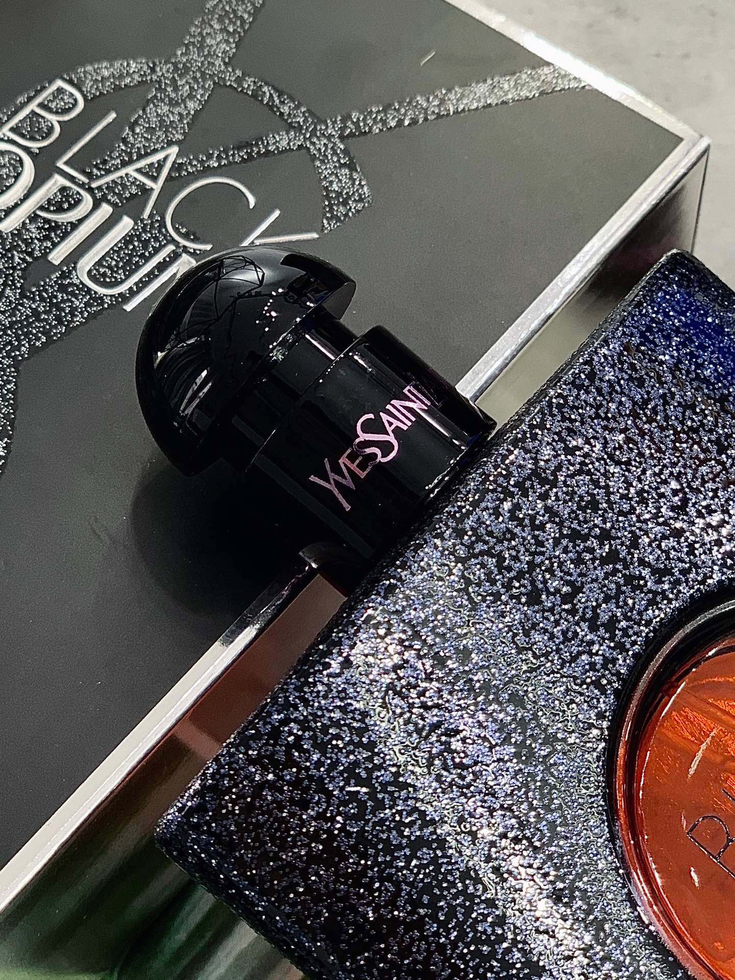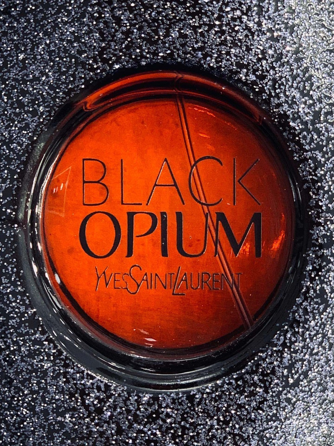 亮片点缀黑色瓶子 摸起来很有质感 瓶身上是黑字