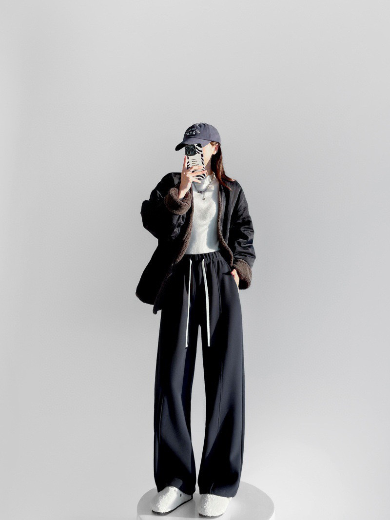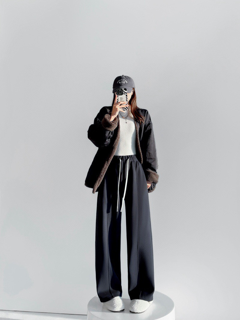 批加绒软糯保暖运动裤冬季休闲抽绳松紧腰宽松拼接直筒中线卫裤女 这条阔腿裤直接承包了我整个冬天的舒适穿搭