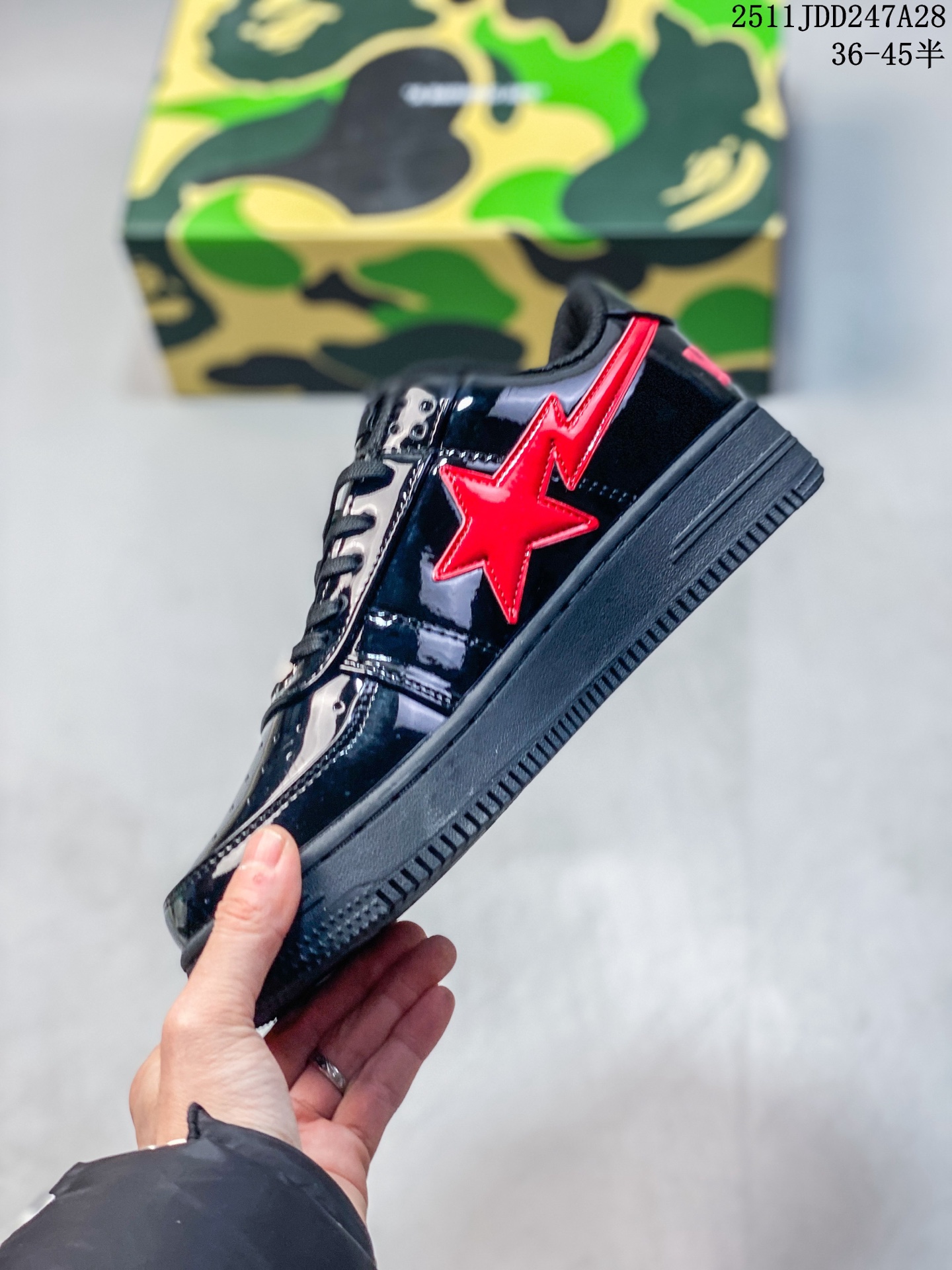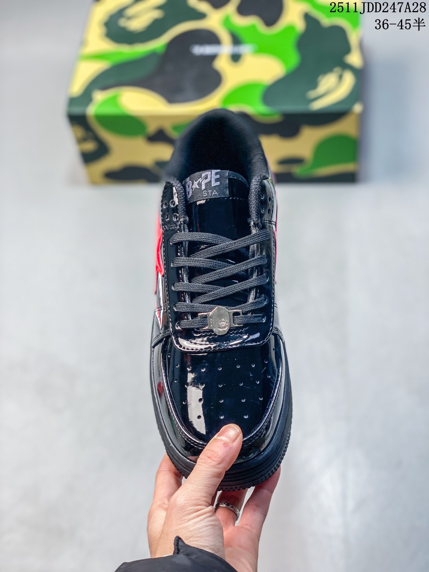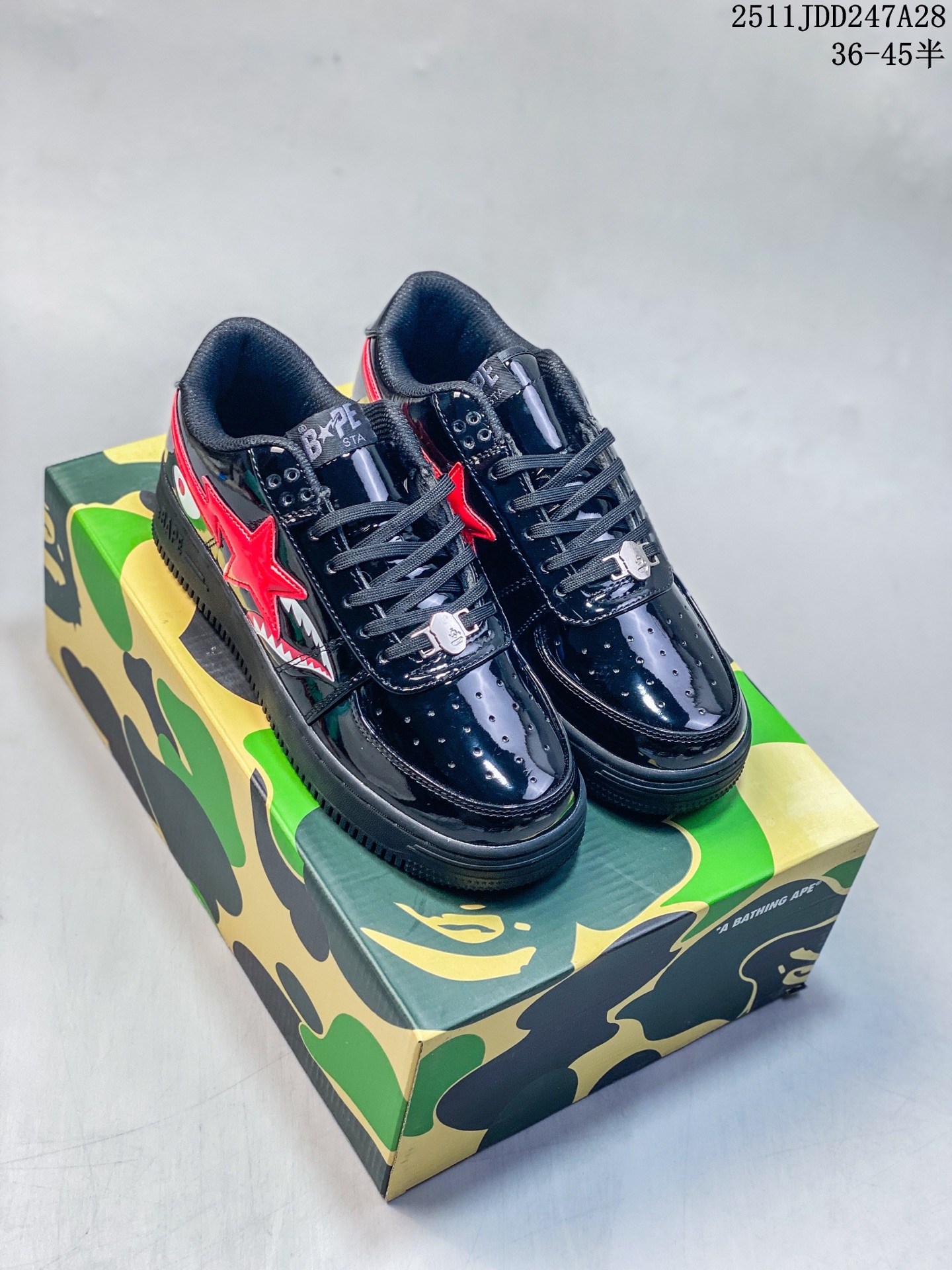 Bape Sta To Low 猿人头经典漆皮低帮运动休闲板鞋 全套原纸板楦头开发 确保原汁原味 市场最完美低趴版型 鞋头弧度高度鞋身弧度 外贸平台指定订单 独家私模磨具冲刀加持 原厂特供皮料光泽色卡零偏差 内里均采用市场最好的超软原厂填充棉 原数据进口机台高频印压LOGO 最高QC检验标准 控制溢胶瑕疵 深浅定位均保持zp一致 中底嵌入Ortholite缓震材质 全套原包装 包含猿人logo