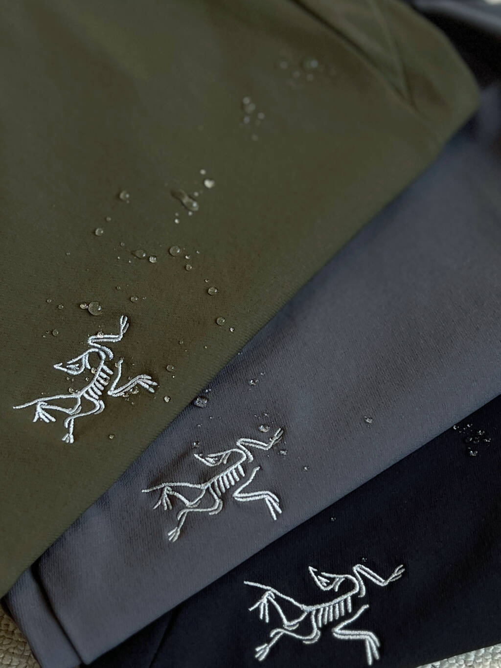 防泼水 DWR处理 表面有持久防水涂层 能甩掉小雨和雪沫 防止短时间内被浸湿 但无法承受长时间大雨