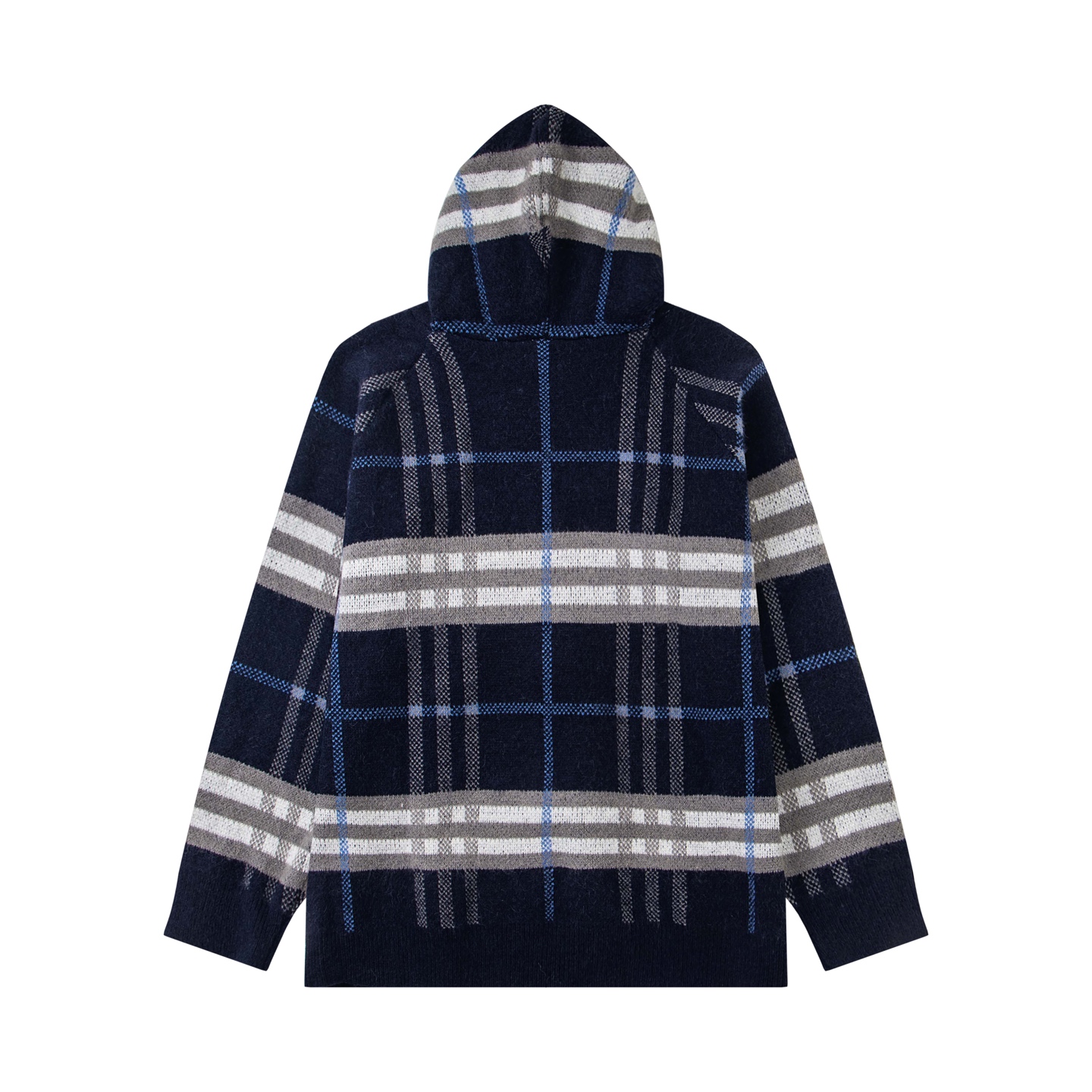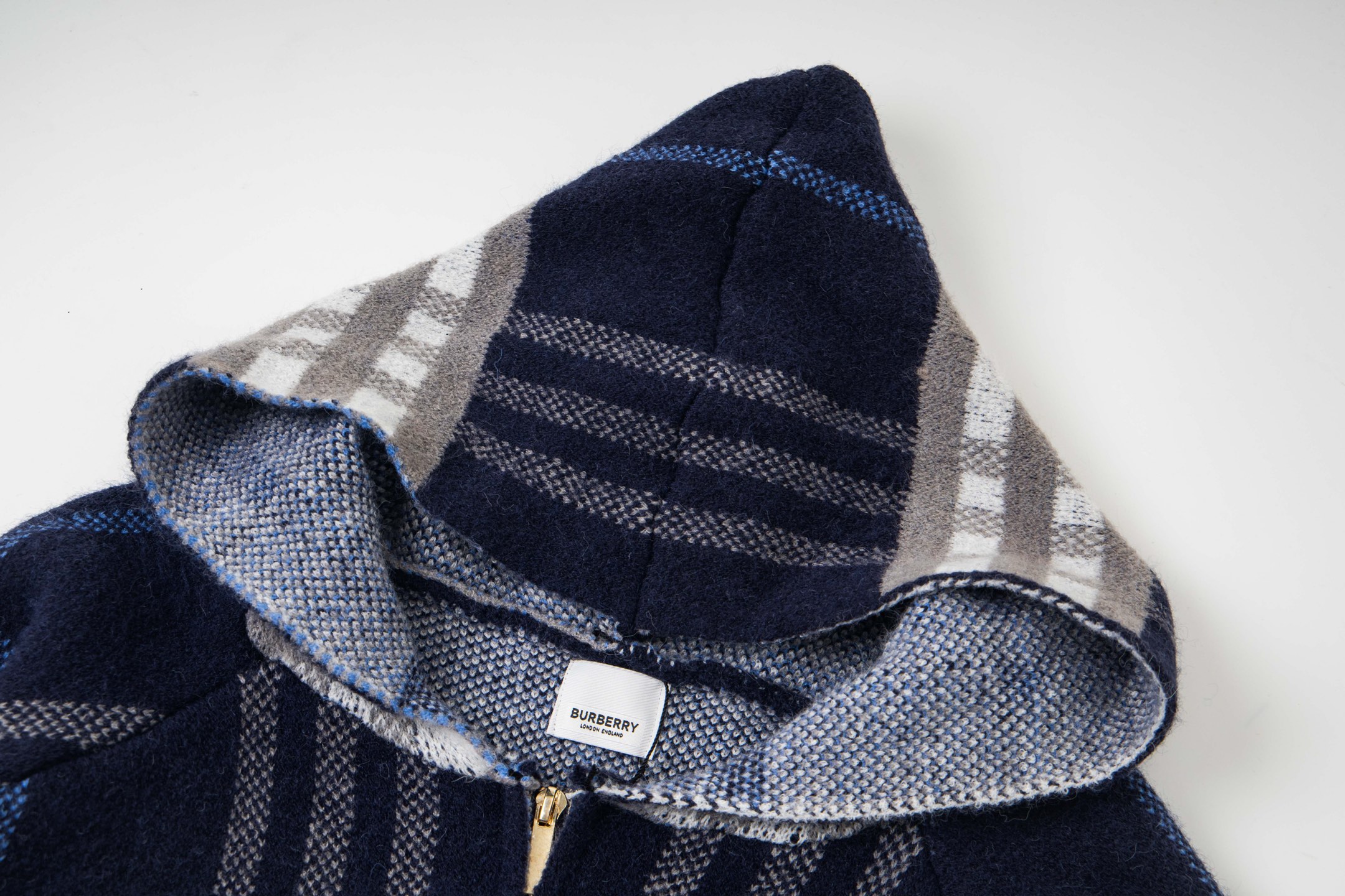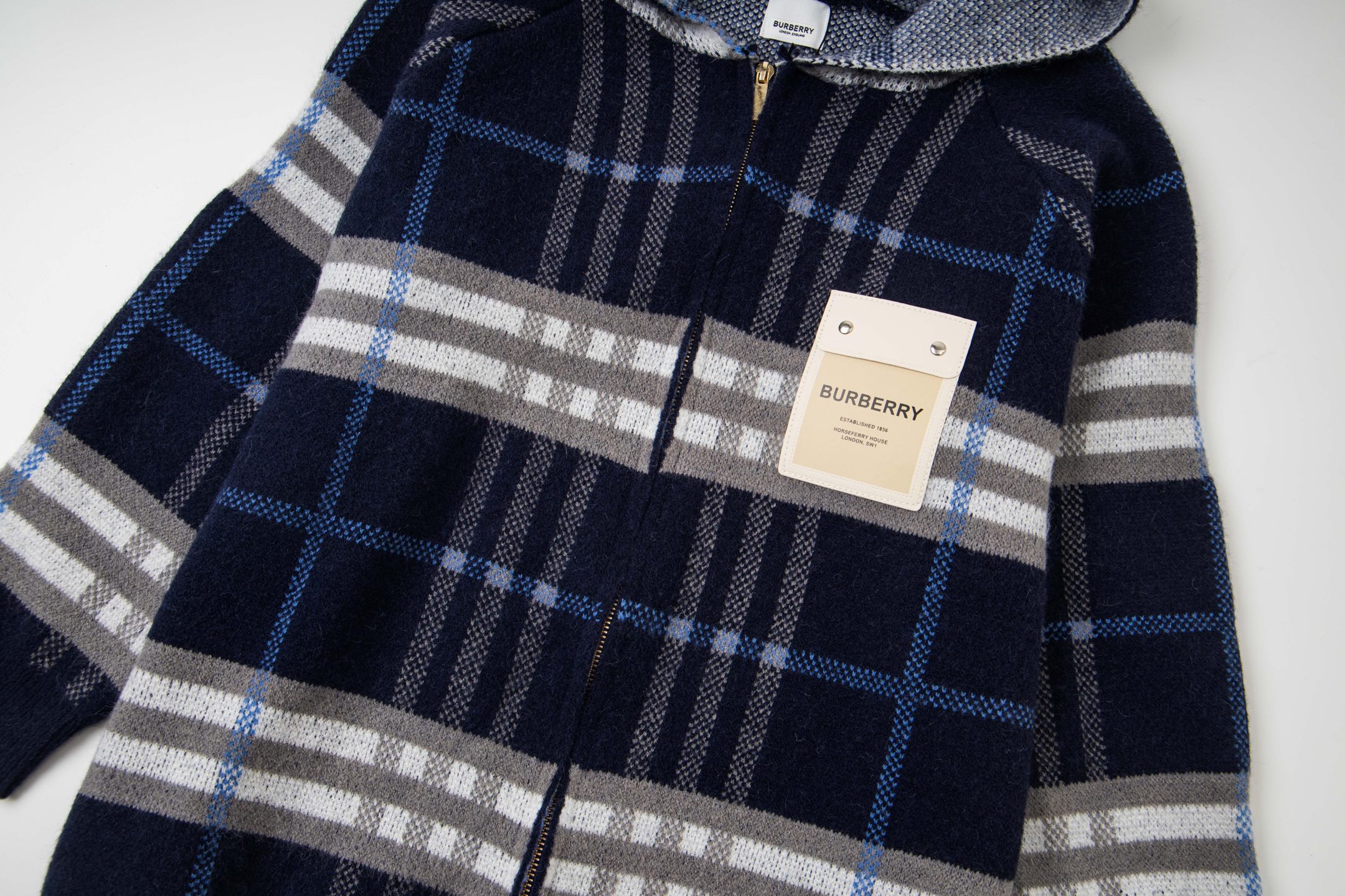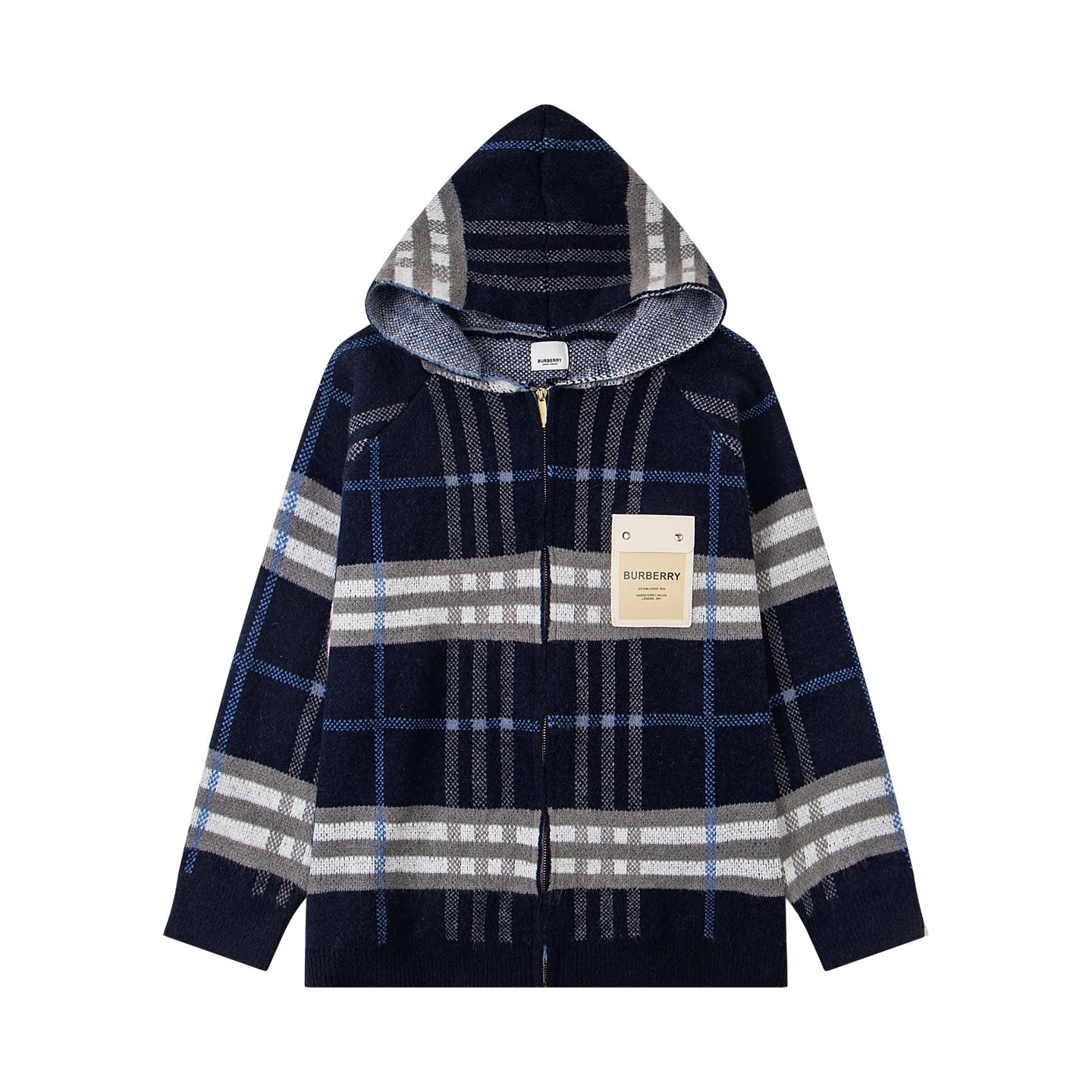 巴宝莉BURBERRY经典皮标拉链连帽蓝格子羊毛针织夹克外套 男女款