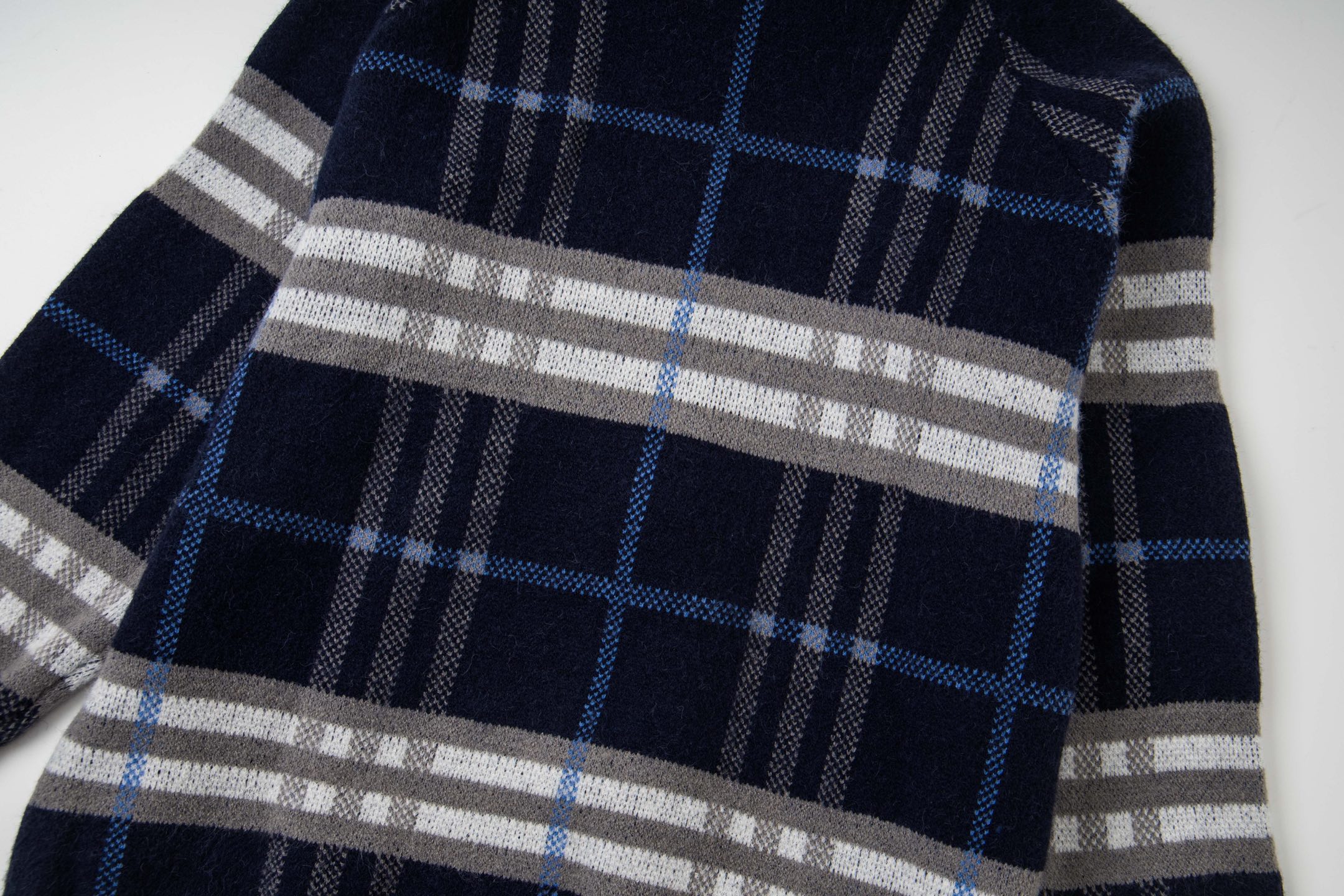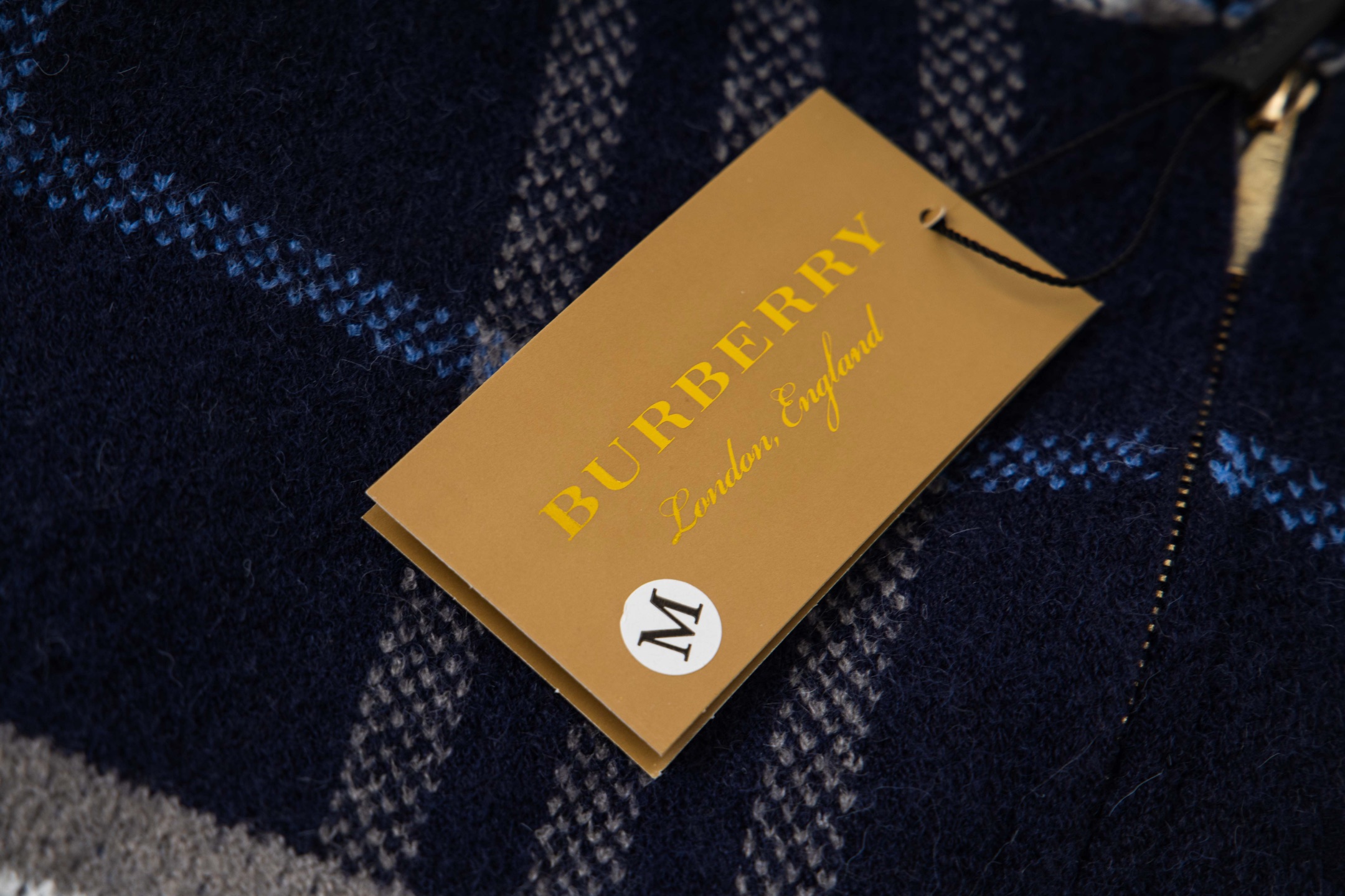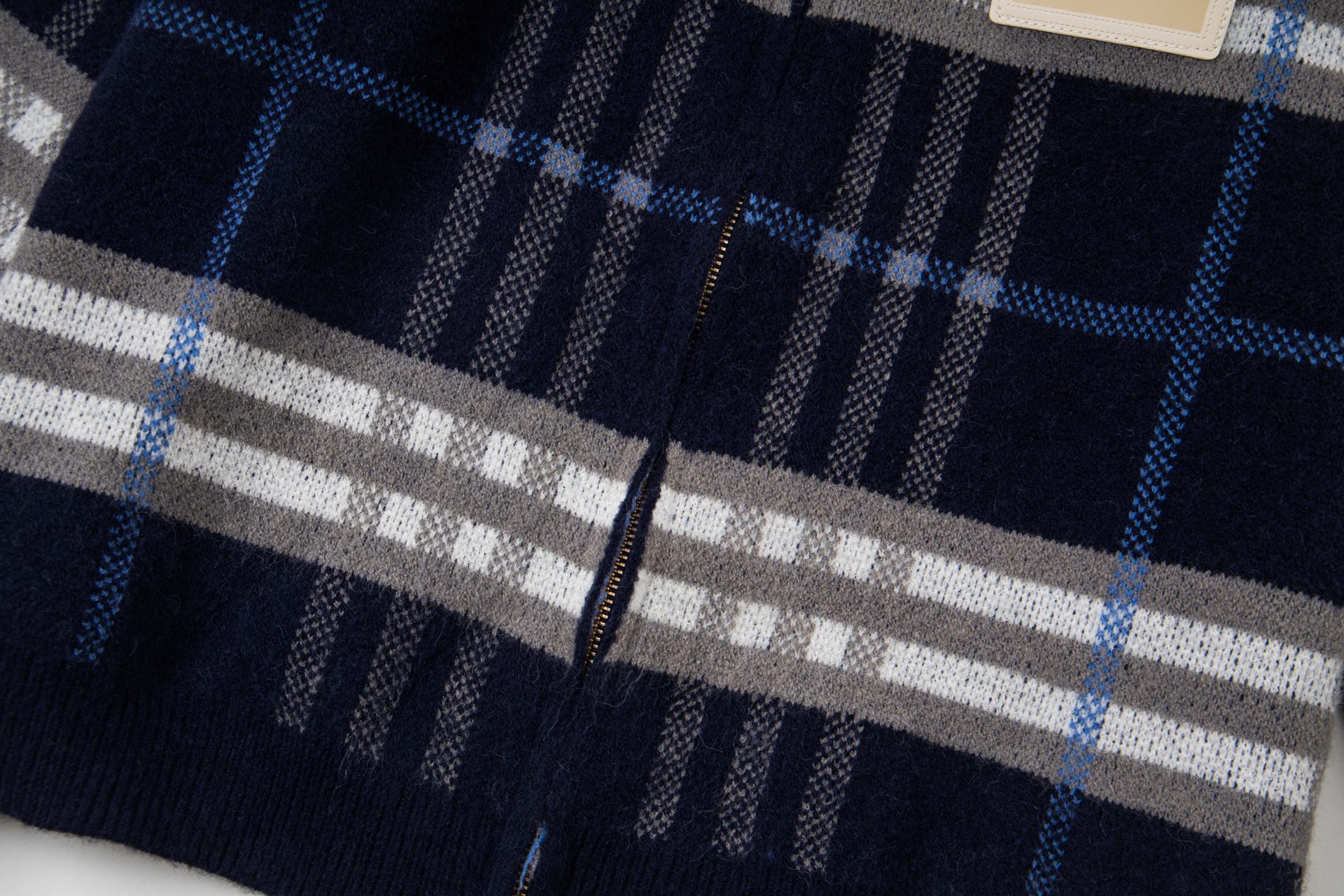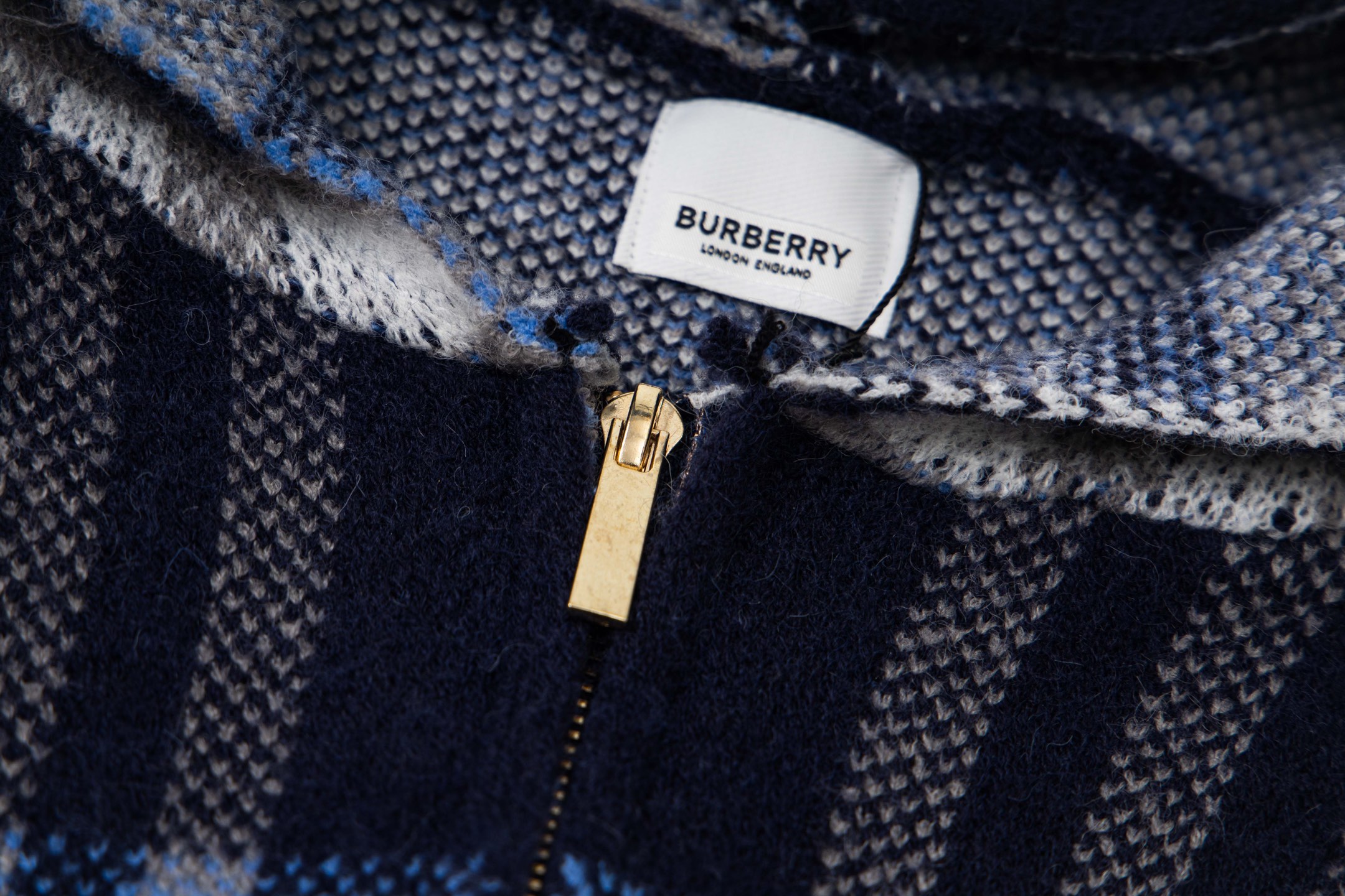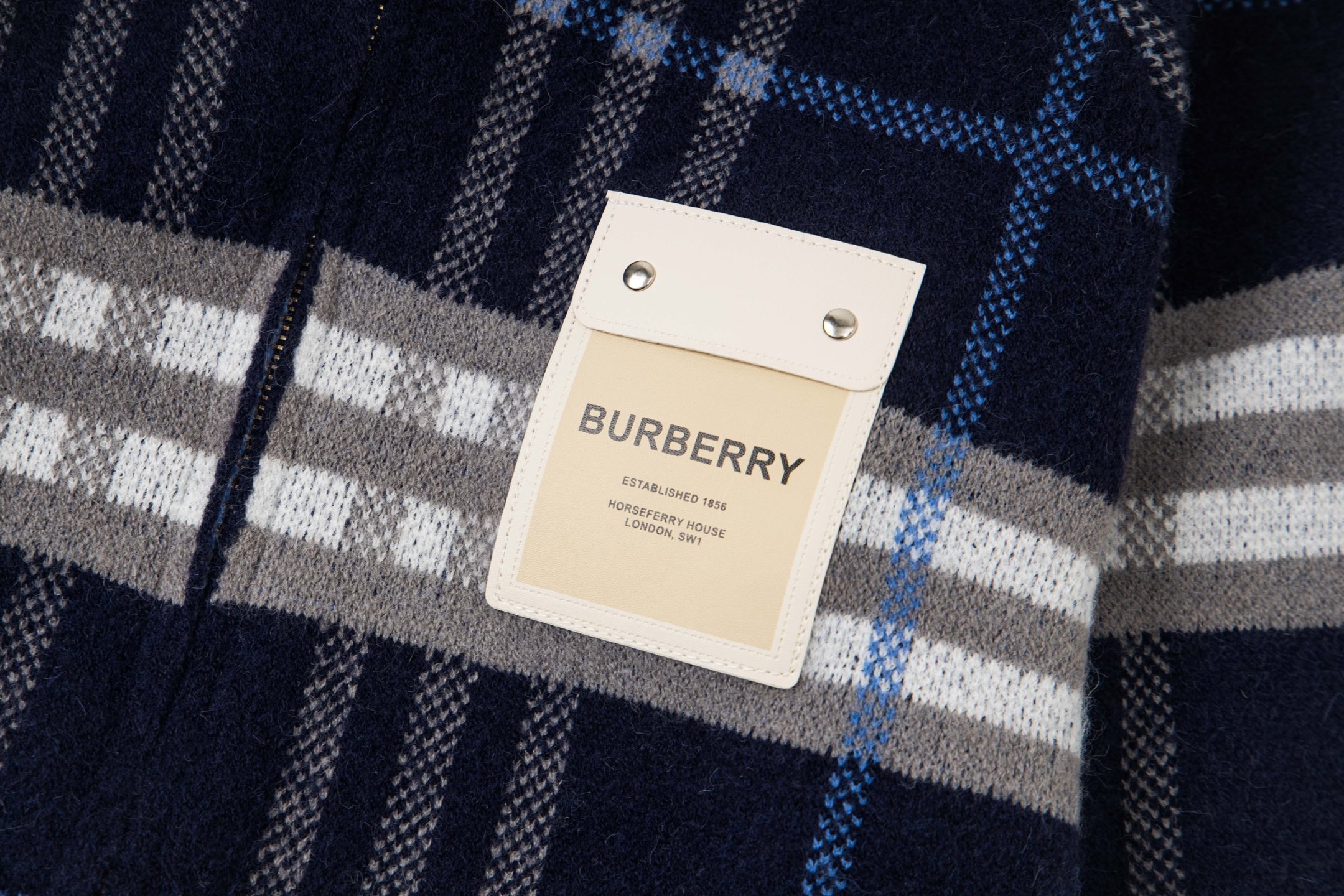 巴宝莉BURBERRY经典皮标拉链连帽蓝格子羊毛针织夹克外套 男女款