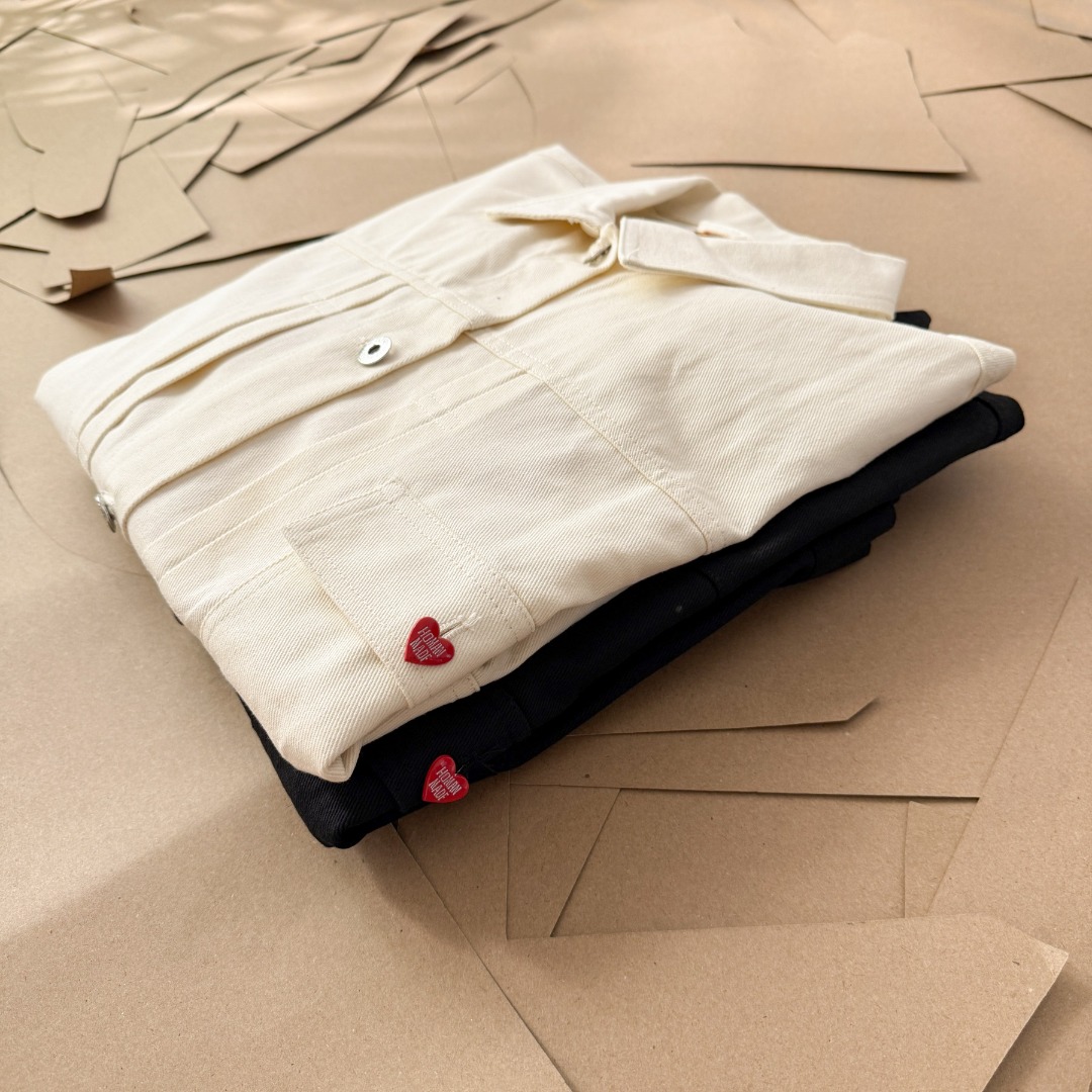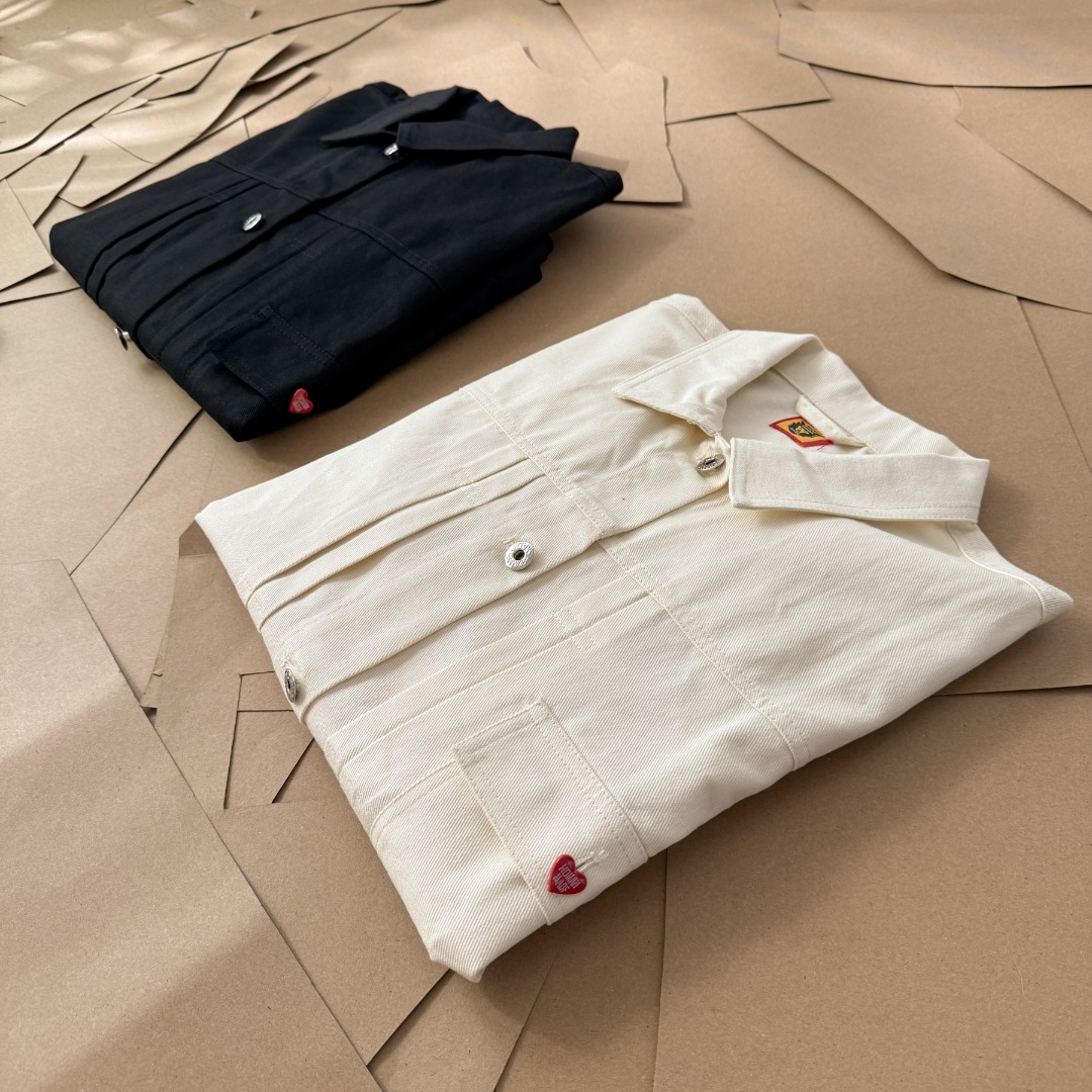 卡通味的工装穿搭 经典版型男女同款 后背植绒毛巾绣大爱心刺绣 纽扣开合设定 细节满满