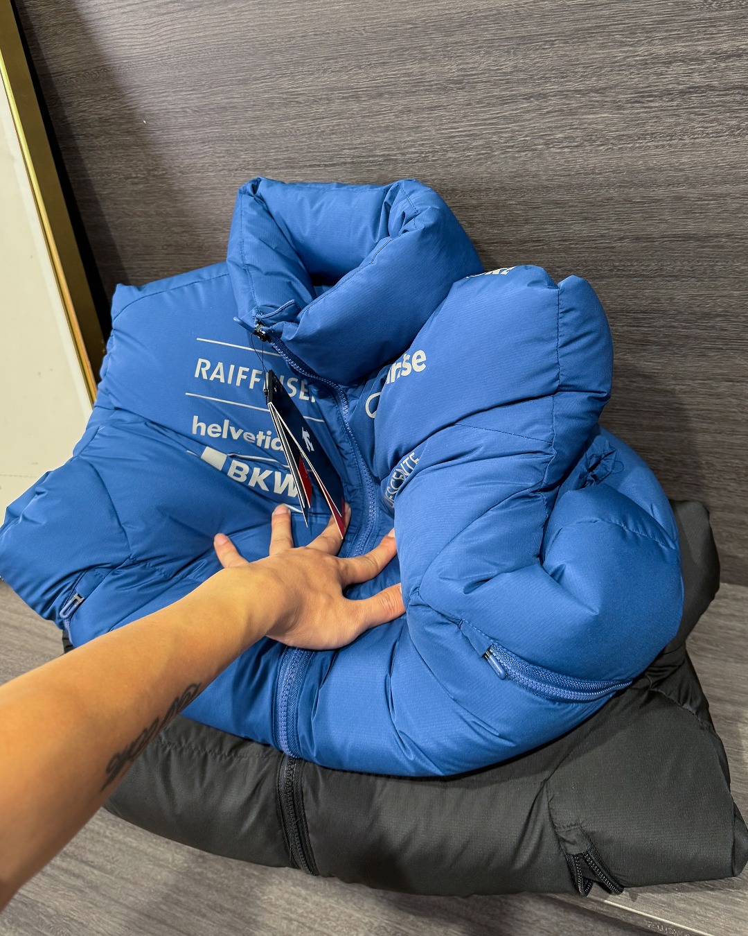 松紧介绍 区分传统羽绒服的 袖口 下摆 需要用老的松紧包边围的做法 我们拆解成衣 使用德国进口的 Rs 松紧线 使得衣服看起来更加自然 没有传统松紧的 整体不对称的感觉 收拉自如 望区分