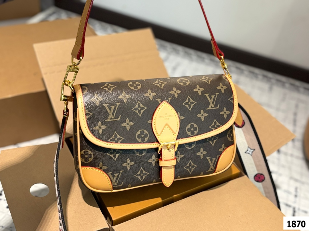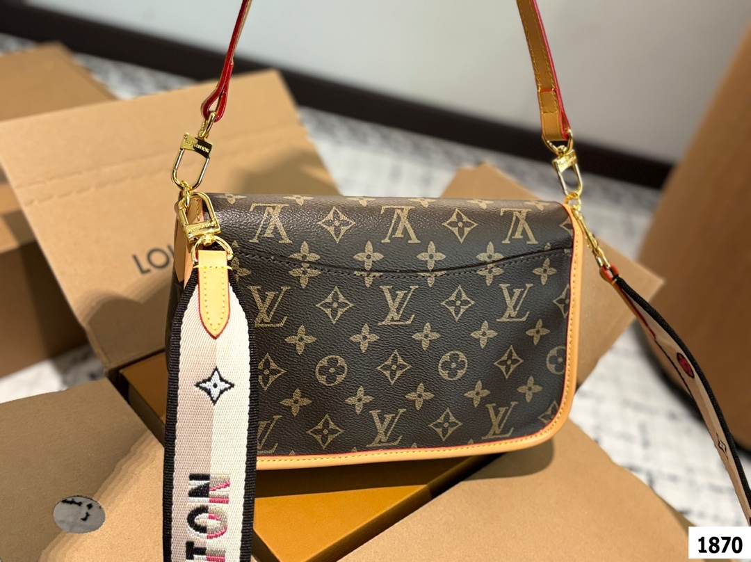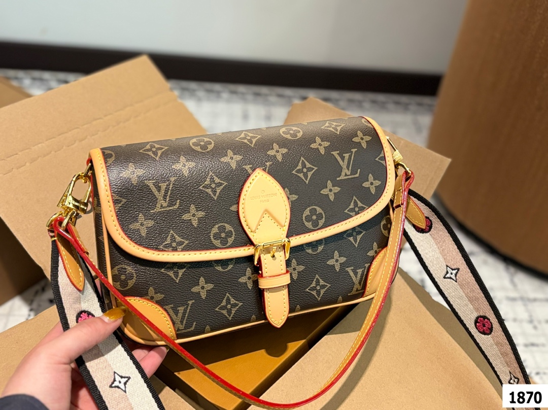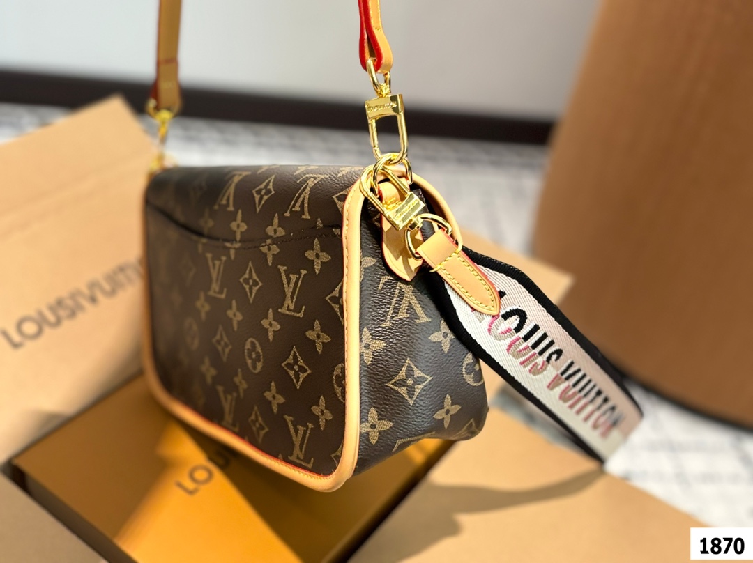 LV爆款王者法棍包 LV DIANE ivdiane 又名法棍包 老花monogram和皮拼焦糖色信封一样的包型 近 复古简约 特别是各种样式的肩带双面刺绣 精致又百变 金属扣肩带可拆卸不可调节 磁吸扣开合 内有拉链袋 下宽的微鼓包身 实际容量比看起来更能装 优雅大方 这款包包有着法式的随性优雅 搭配任何风格都可以 尺寸 25 16