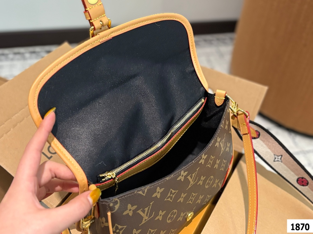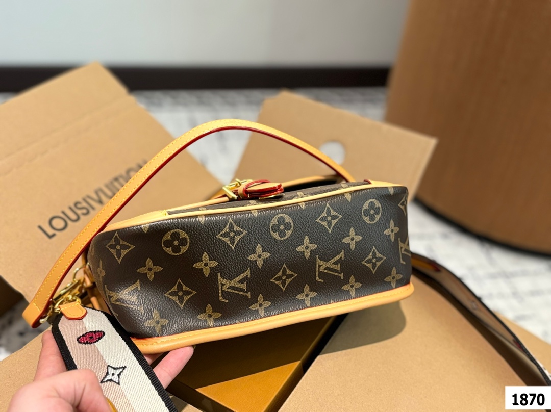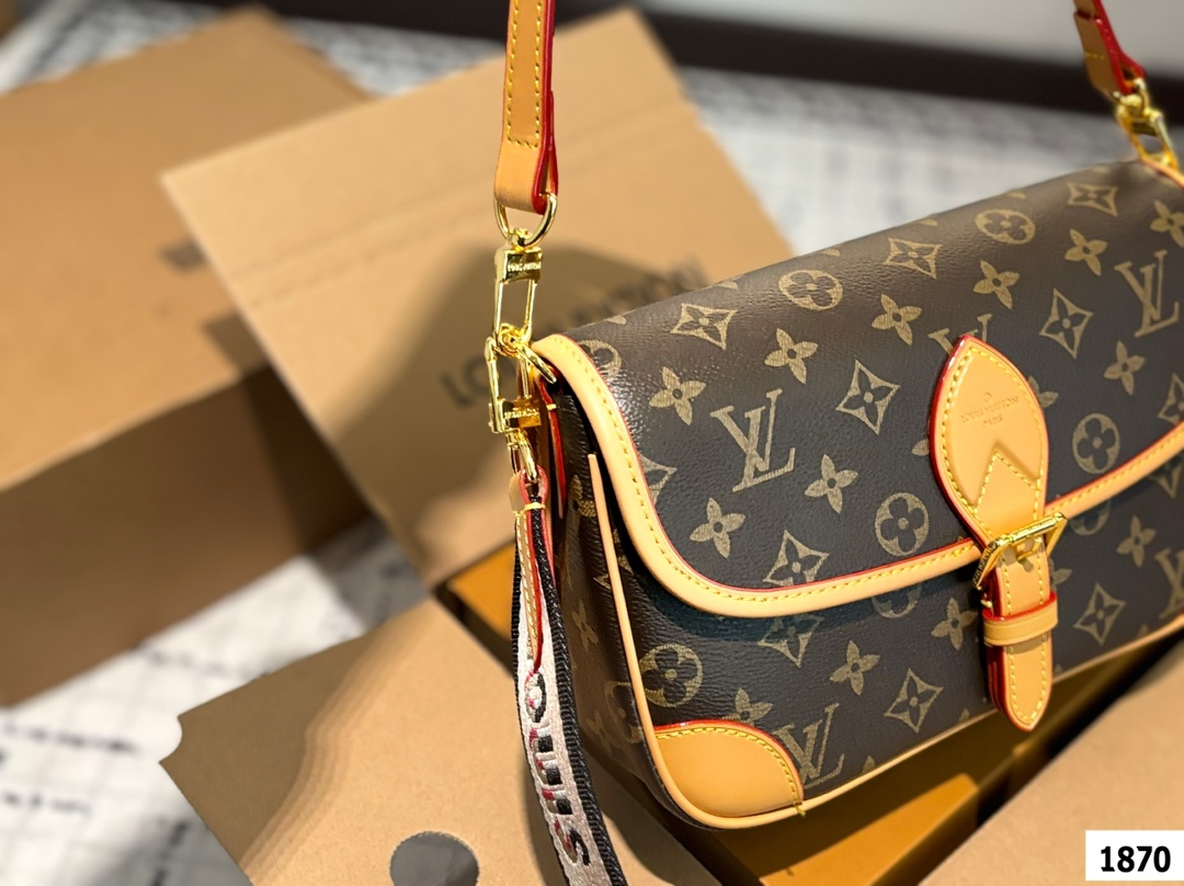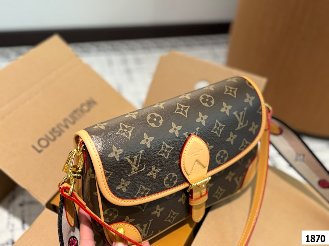 LV爆款王者法棍包 LV DIANE ivdiane 又名法棍包 老花monogram和皮拼焦糖色信封一样的包型 近 复古简约 特别是各种样式的肩带双面刺绣 精致又百变 金属扣肩带可拆卸不可调节 磁吸扣开合 内有拉链袋 下宽的微鼓包身 实际容量比看起来更能装 优雅大方 这款包包有着法式的随性优雅 搭配任何风格都可以 尺寸 25 16