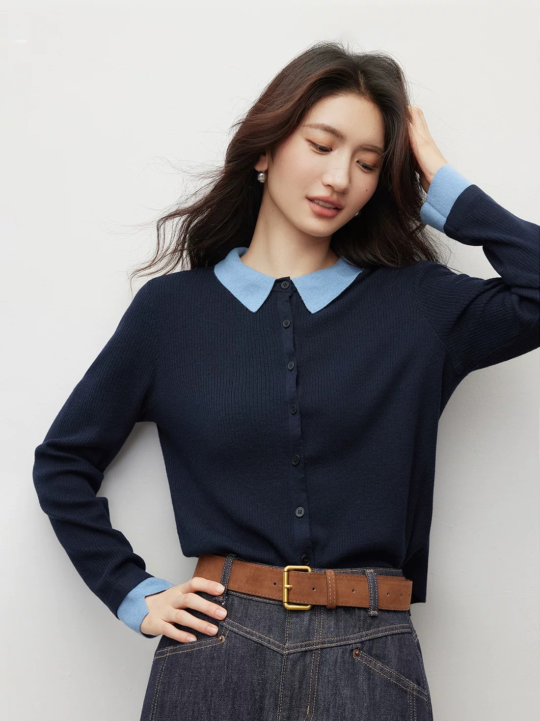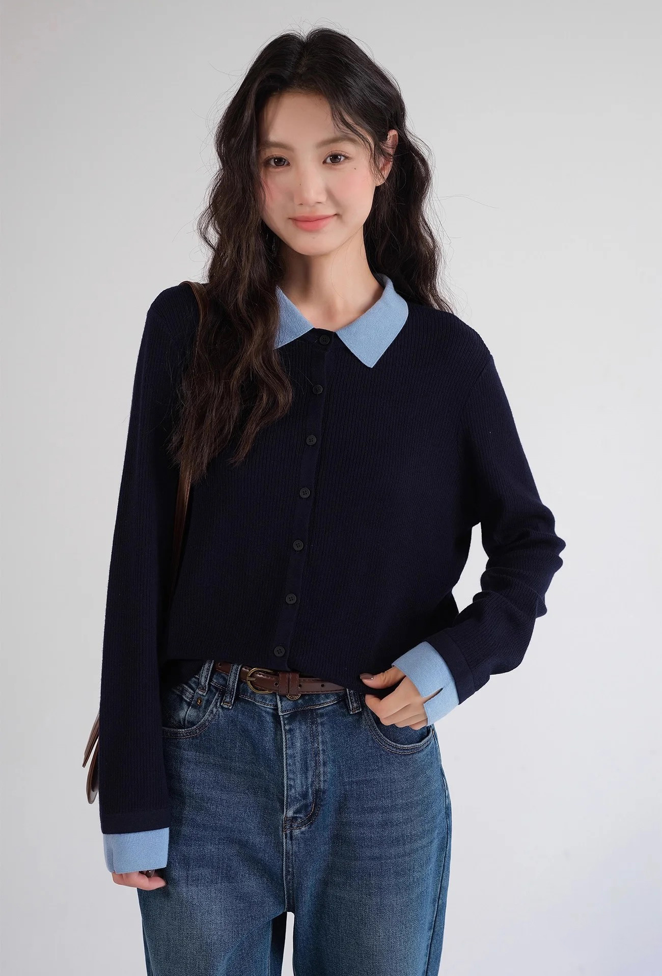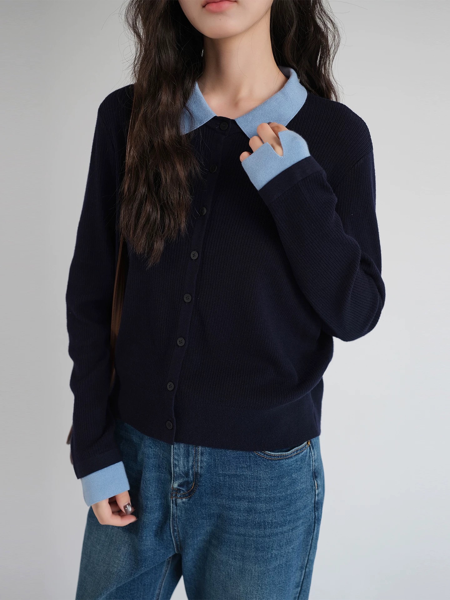 微宽松直筒版型 适度的宽松度包容腰腹赘肉 对各种身形都十分友好 同时保持整体廓形的挺括 不会有软塌的拖沓感 抬手或活动时也能自在无束缚 设计上的点睛之笔 莫过于撞色拼接 浅蓝色的衬衫翻领与袖口 和藏青色针织主体形成清新的色彩碰撞 还原了衬衫叠穿针织开衫的经典造型 却省去了搭配的繁琐 又能修饰颈部线条 增添知性的通勤气质 袖口处的浅蓝拼接做了小开叉处理 让手臂线条更显纤细 也为整体增添了灵动的细节感