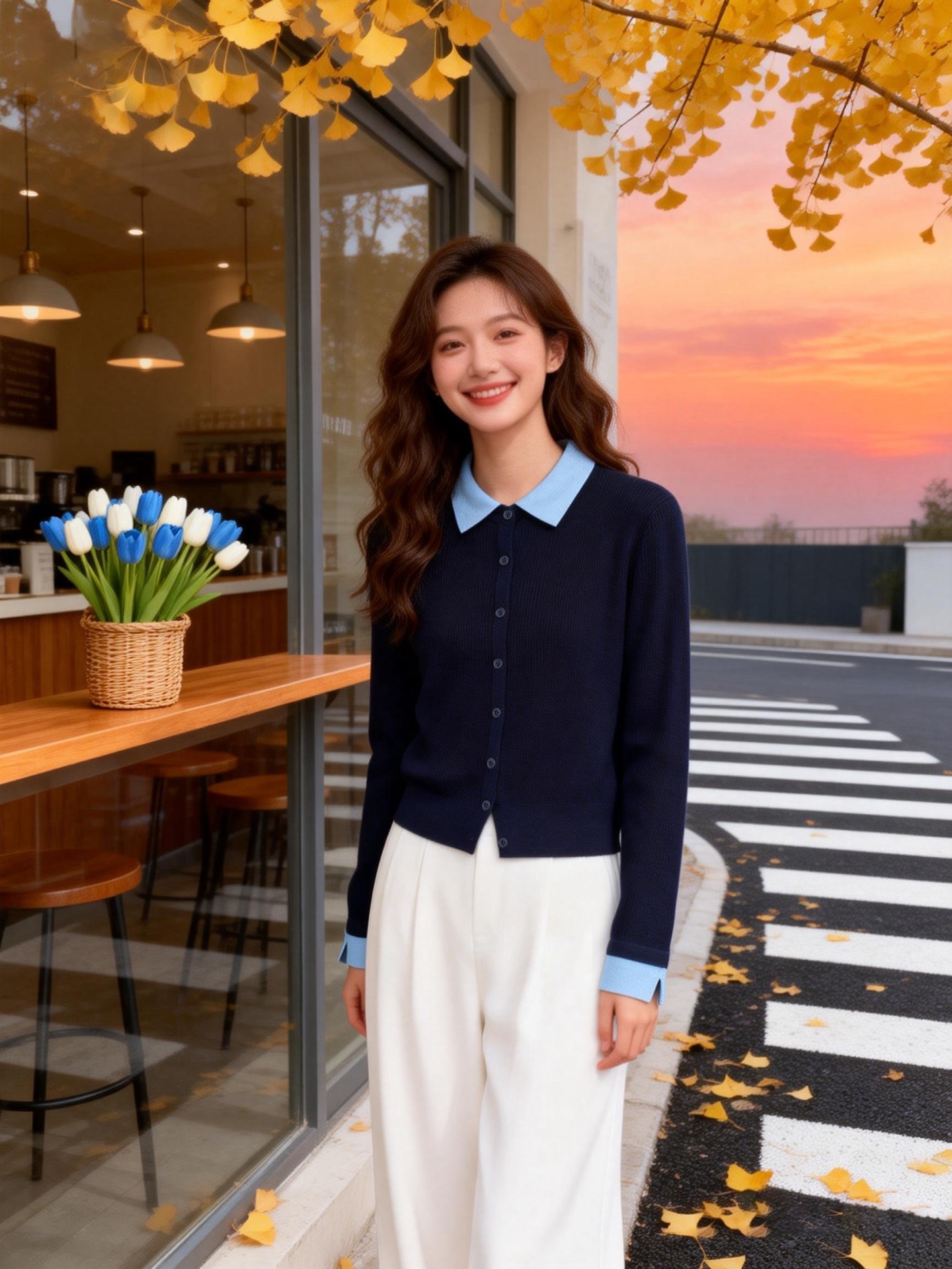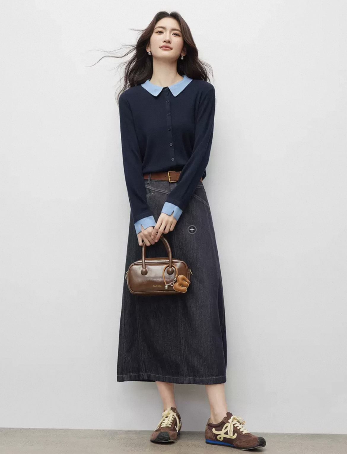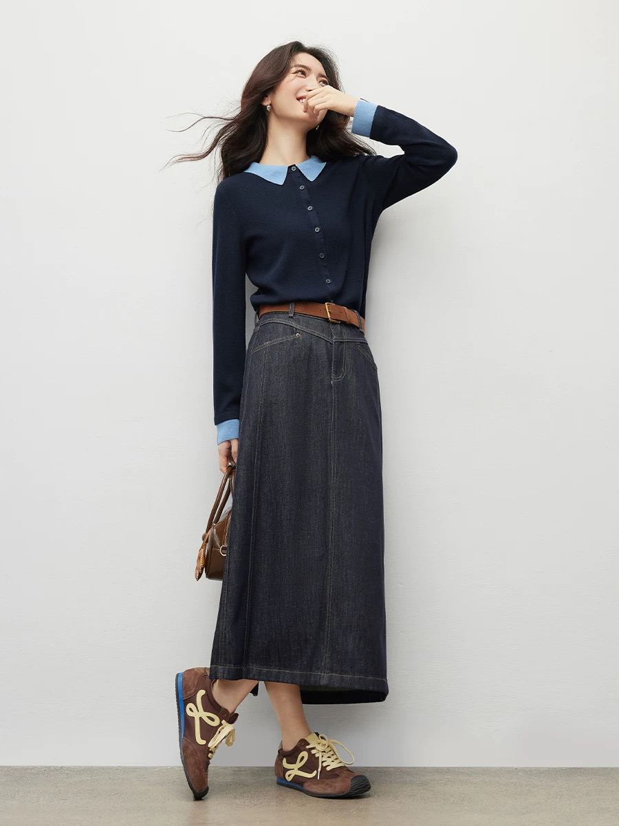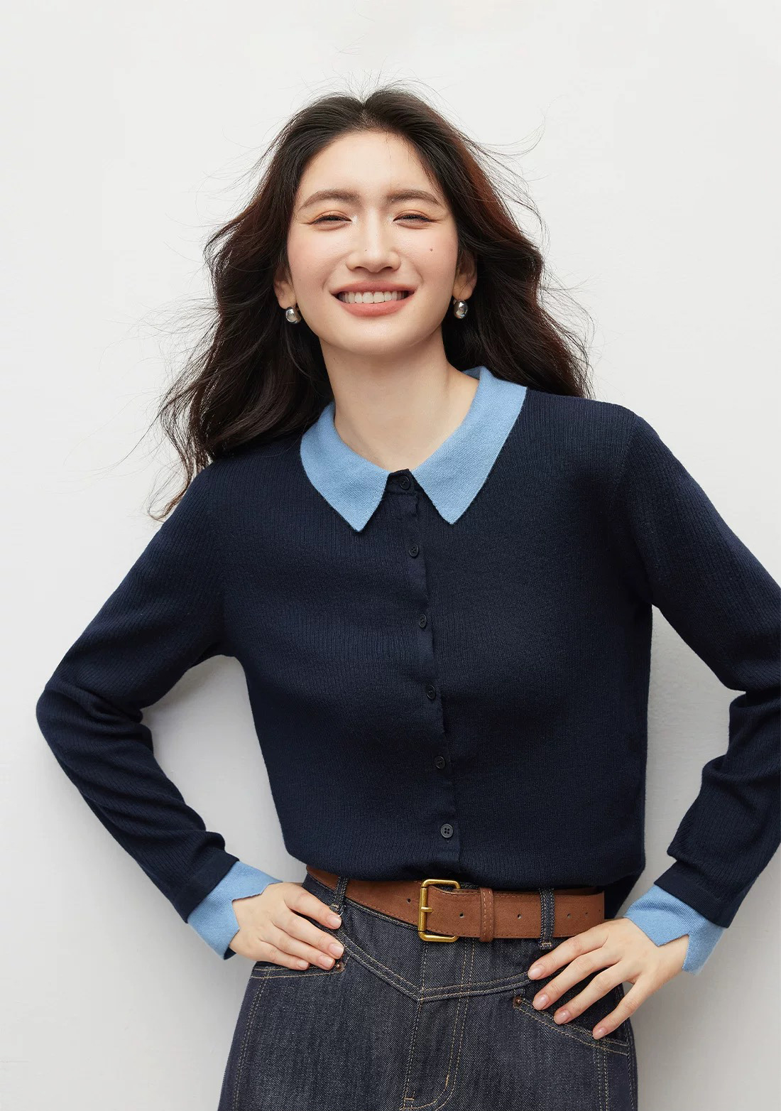 微宽松直筒版型 适度的宽松度包容腰腹赘肉 对各种身形都十分友好 同时保持整体廓形的挺括 不会有软塌的拖沓感 抬手或活动时也能自在无束缚 设计上的点睛之笔 莫过于撞色拼接 浅蓝色的衬衫翻领与袖口 和藏青色针织主体形成清新的色彩碰撞 还原了衬衫叠穿针织开衫的经典造型 却省去了搭配的繁琐 又能修饰颈部线条 增添知性的通勤气质 袖口处的浅蓝拼接做了小开叉处理 让手臂线条更显纤细 也为整体增添了灵动的细节感